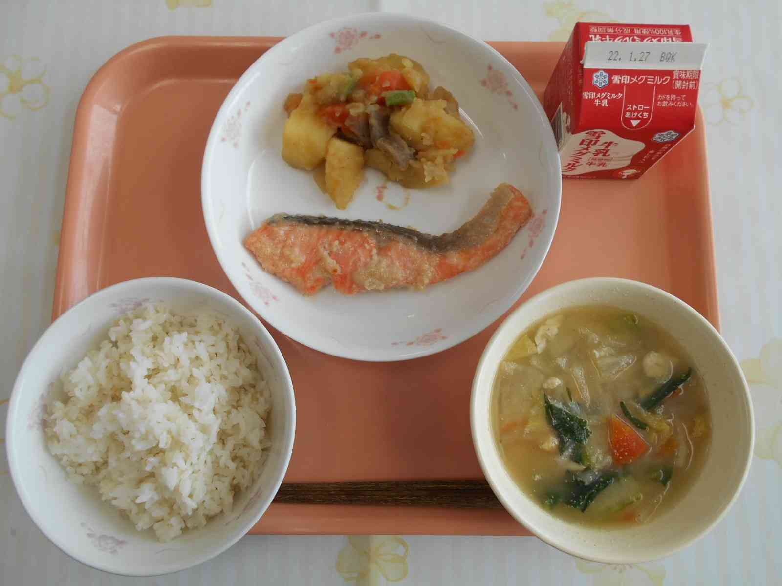 ○牛乳 ○麦ご飯 〇鮭(さけ)の塩こうじ焼き 〇野菜の炒め煮 〇呉汁(ごじる) ☆一口メモ☆ こうじは米こうじと塩と水を混ぜて発酵させた、日本の調味料です。魚を塩こうじに漬けこんでから焼くと、しっとりジューシーになります。塩こうじの酵素(こうそ)のパワーです。さらに、塩こうじにはうまみ成分も含まれているので、ワンランクアップした焼き魚にしてくれます。