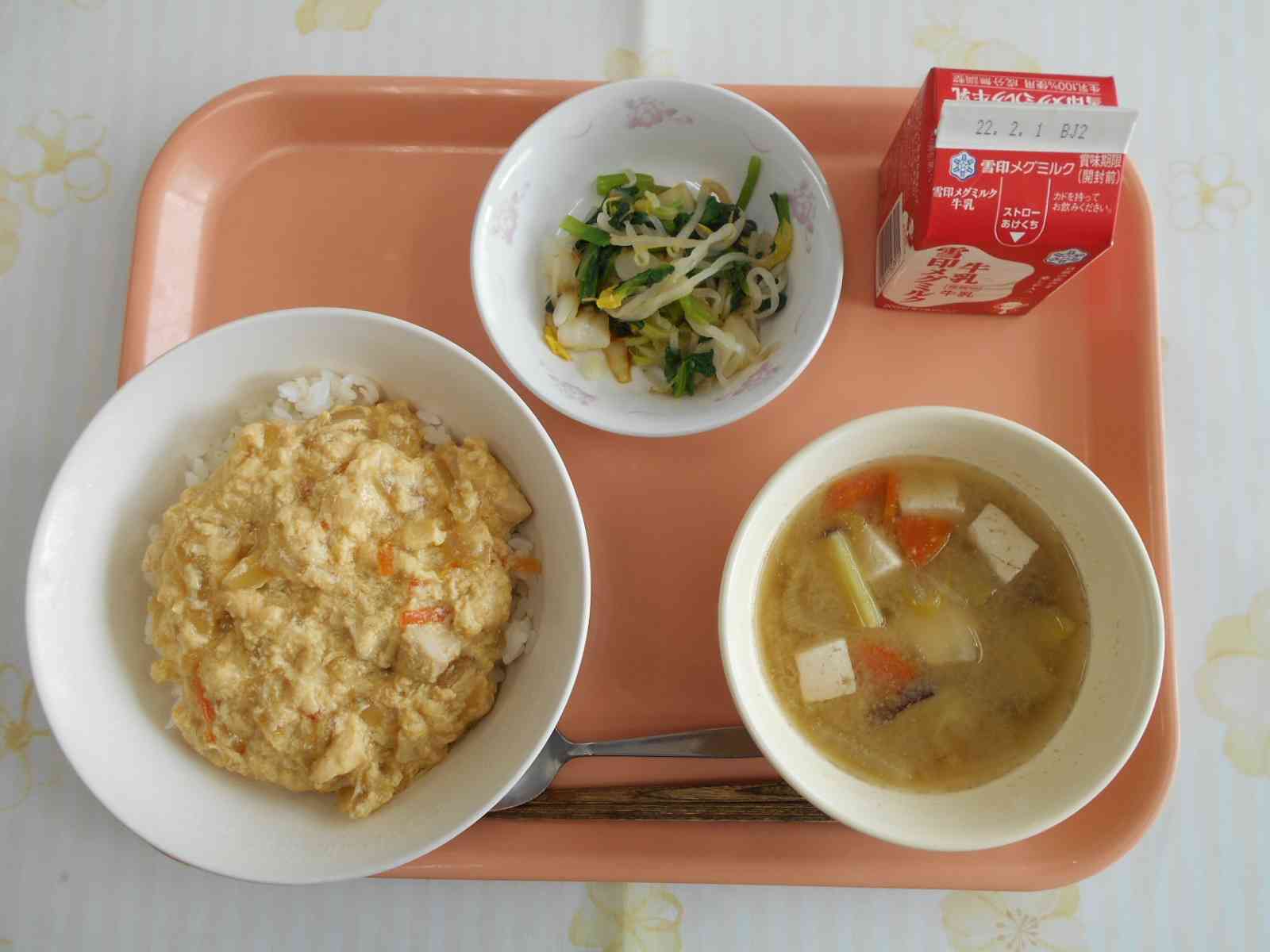 ○牛乳 ○ふわふわ親子丼 〇だし醤油(じょうゆ)のお浸し(ひたし) 〇さつま芋のごま味噌汁(みそしる) ☆一口メモ☆ おひたしの「だしじょうゆ」は、しょうゆとだし汁を混ぜたものです。同じ量のしょうゆを使って、おしょうゆだけのおひたしと、だしじょうゆのおひたしを作って比べて見ると、だしじょうゆのおひたしの方が、うまみと香りがあっておいしくなります。だしは、限られた調味料でも、料理をおいしくしてくれるのです。【添付ファイル】