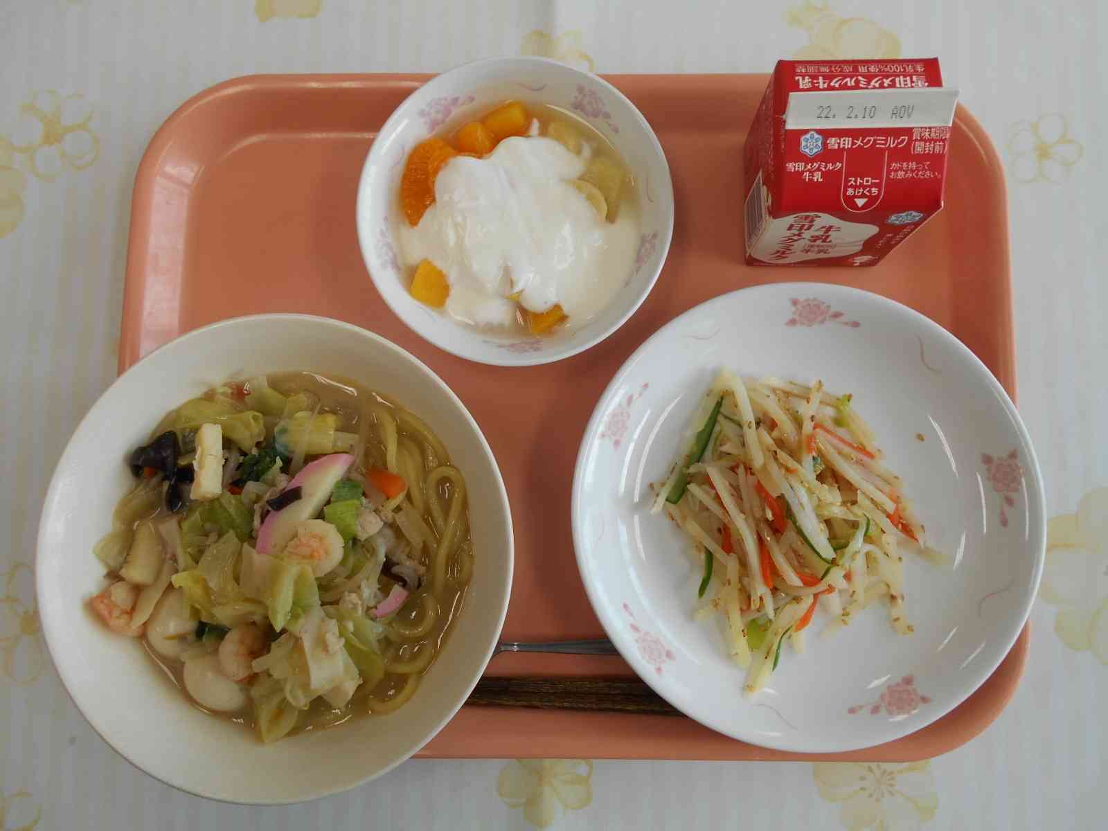 <長崎県の味めぐり献立> ○牛乳 ○長崎ちゃんぽん 〇千切りじゃが芋のサラダ 〇フルーツのヨーグルト添え ☆一口メモ☆ ☆長崎県の味めぐり☆ ちゃんぽんは、長崎県の郷土料理で、具だくさんのめん料理です。豚肉やいか・えびなどの魚介類と、玉ねぎ・にんじん・キャベツなどの野菜を使っています。食材を油で炒めてから、鶏ガラでとったスープを加えて作ります。鶏ガラスープに魚介類のうまみが溶け込んで、濃厚な味わいになっています。【添付ファイル】