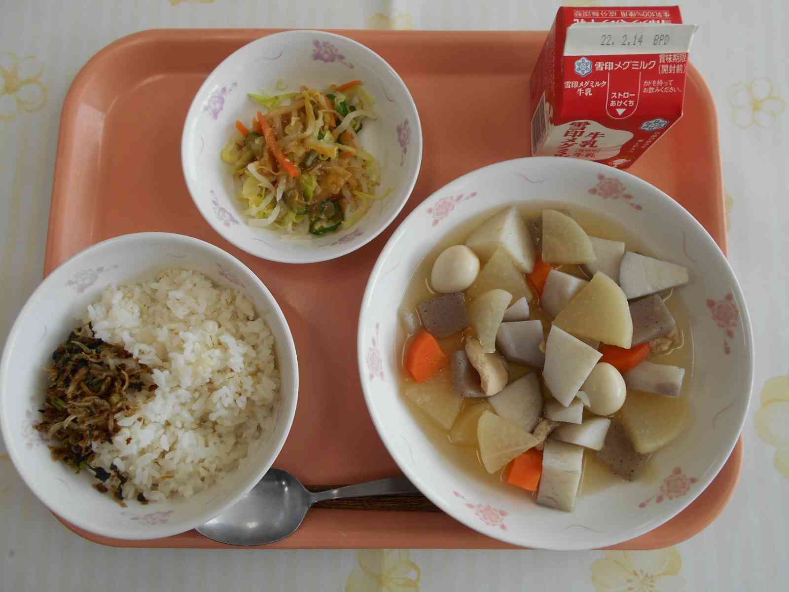○牛乳 ○押麦(おしむぎ)入りご飯 〇小松菜とじゃこのふりかけ 〇和風ポトフ 〇みそドレッシングサラダ ☆一口メモ☆ ポトフに里いもを使いました。里芋はじゃがいもやさつまいもよりも昔から、日本で食べられてきた歴史の長いいもです。 じゃがいもとさつまいもは、江戸時代に日本に伝わりました。 一方、里いもは、なんと縄文時代から日本で食べられていました。 現代の日本ではどうでしょうか。おうちで、里いもを食べていますか。今日は、里いももねっとりとした食感を楽しみながら食べてくださいね。【添付ファイル】