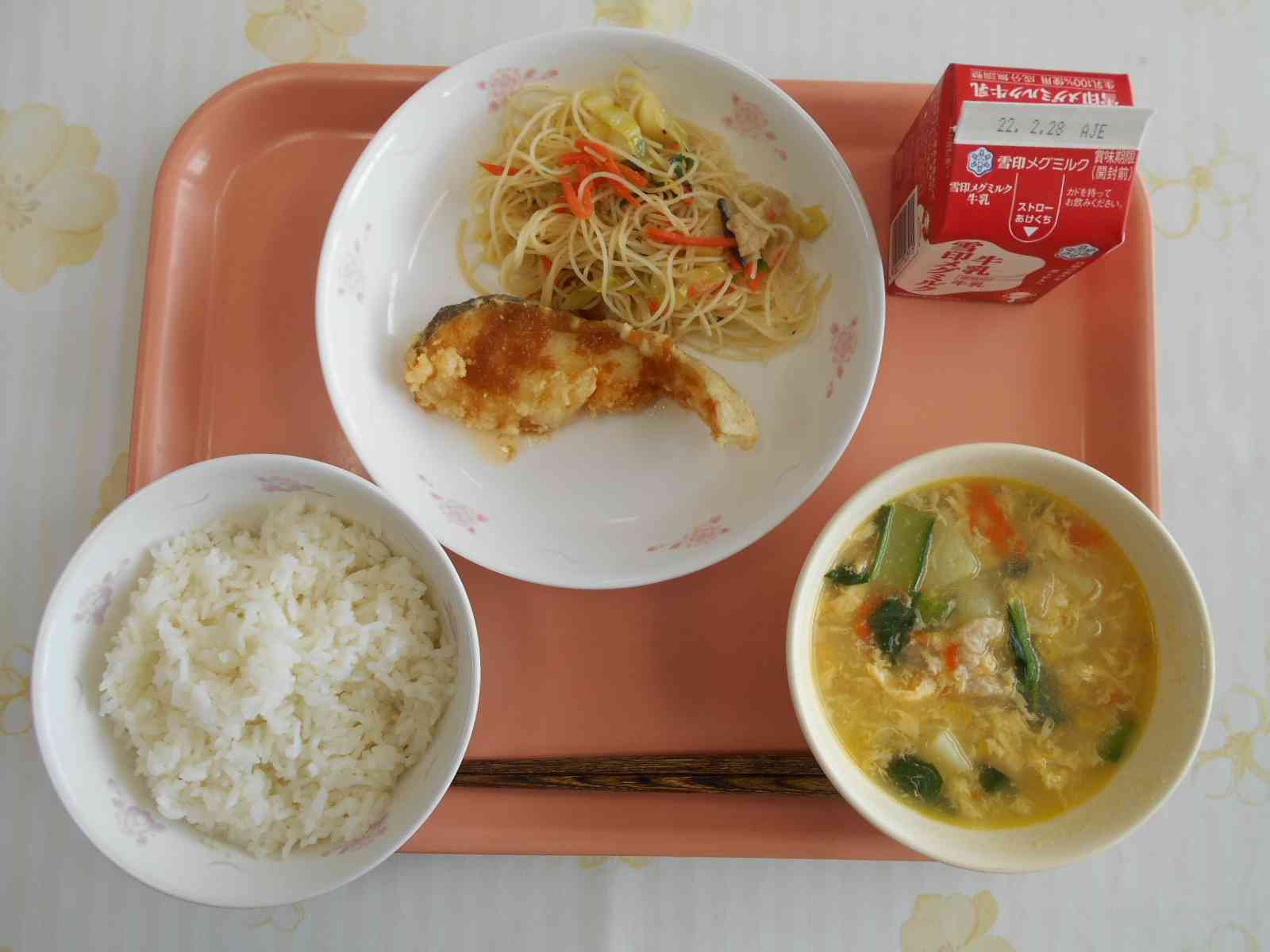 ○牛乳 ○ご飯 〇鱈(たら)の変わりづけ 〇焼きビーフン 〇中華風卵入りコーンスープ ☆一口メモ☆ タラは漢字で「さかなへん」に雪と書きます。 「たらふく食べる」のたらふくとは、お腹が満たされるまでたくさん食べたり飲んだりすることを意味する言葉です。「鱈腹」の漢字を当てます。この漢字通り、タラは大食いで、冬の時期のおなかはパンパンにふくれています。もともとの「たらふく」言葉の語源は、魚のタラのおなかのことではなかったそうですが、たっぷり食べてお腹が出ている状態は、まさに「鱈の腹」のようで、ぴったりの漢字ですね。【添付ファイル】