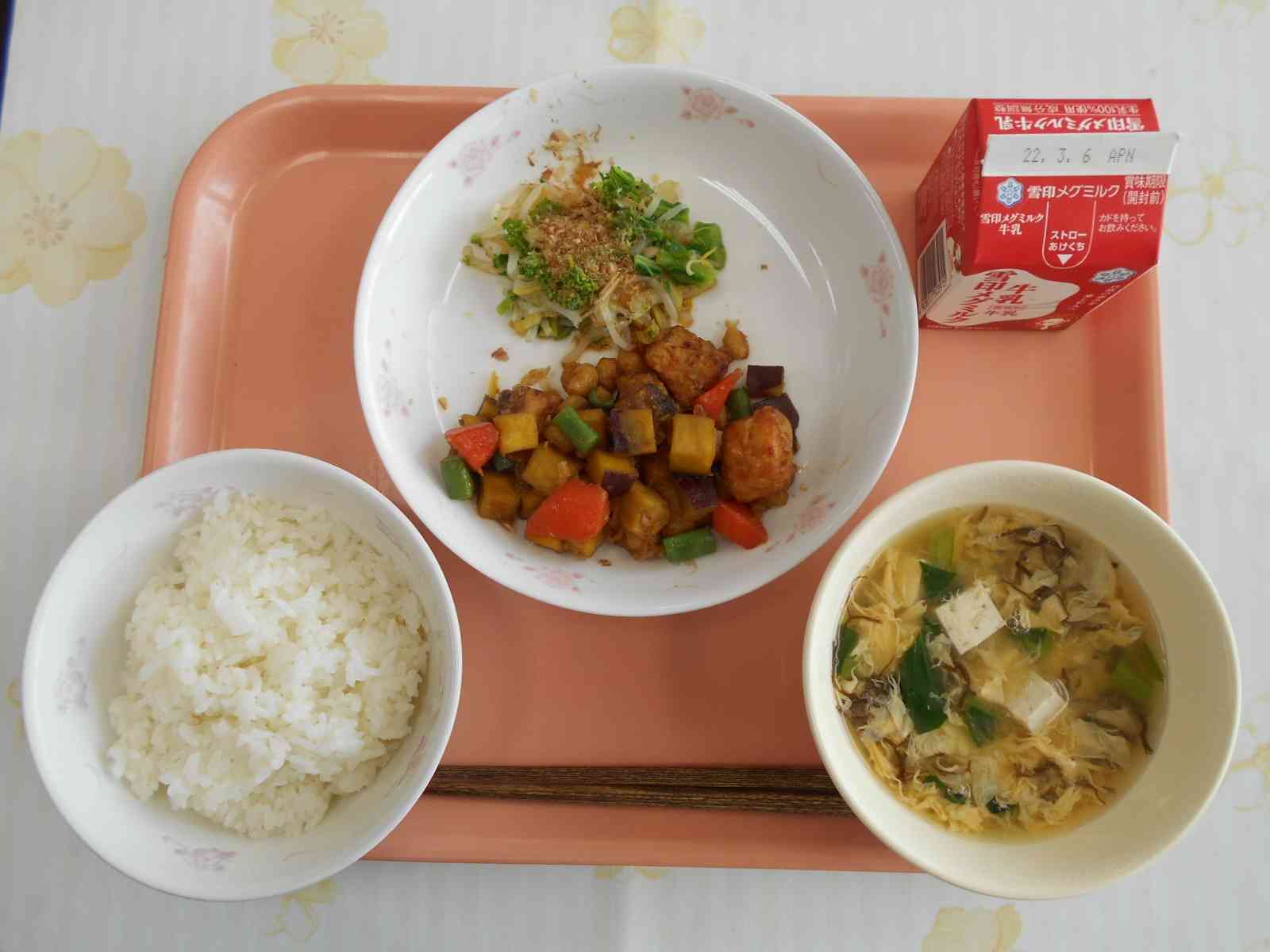 ○牛乳 ○ご飯 〇魚と野菜の五色和え 〇菜の花(なのはな)のお浸し 〇卵ともずくの味噌汁 ☆一口メモ☆ 今日のお浸しには菜の花が入っています。菜の花は、春になると黄色い花を咲かせます。食べる菜の花の花が咲く前に、つぼみや若葉を摘んだものをいただいています。ほろ苦い菜の花を食べると、春が近づいてきていることを感じられますね。まだ寒い時期が続きますが、春になるまでもう少しです。