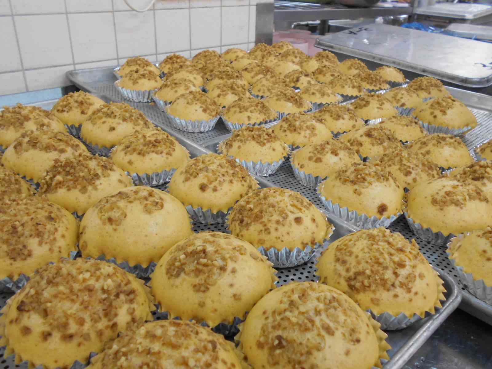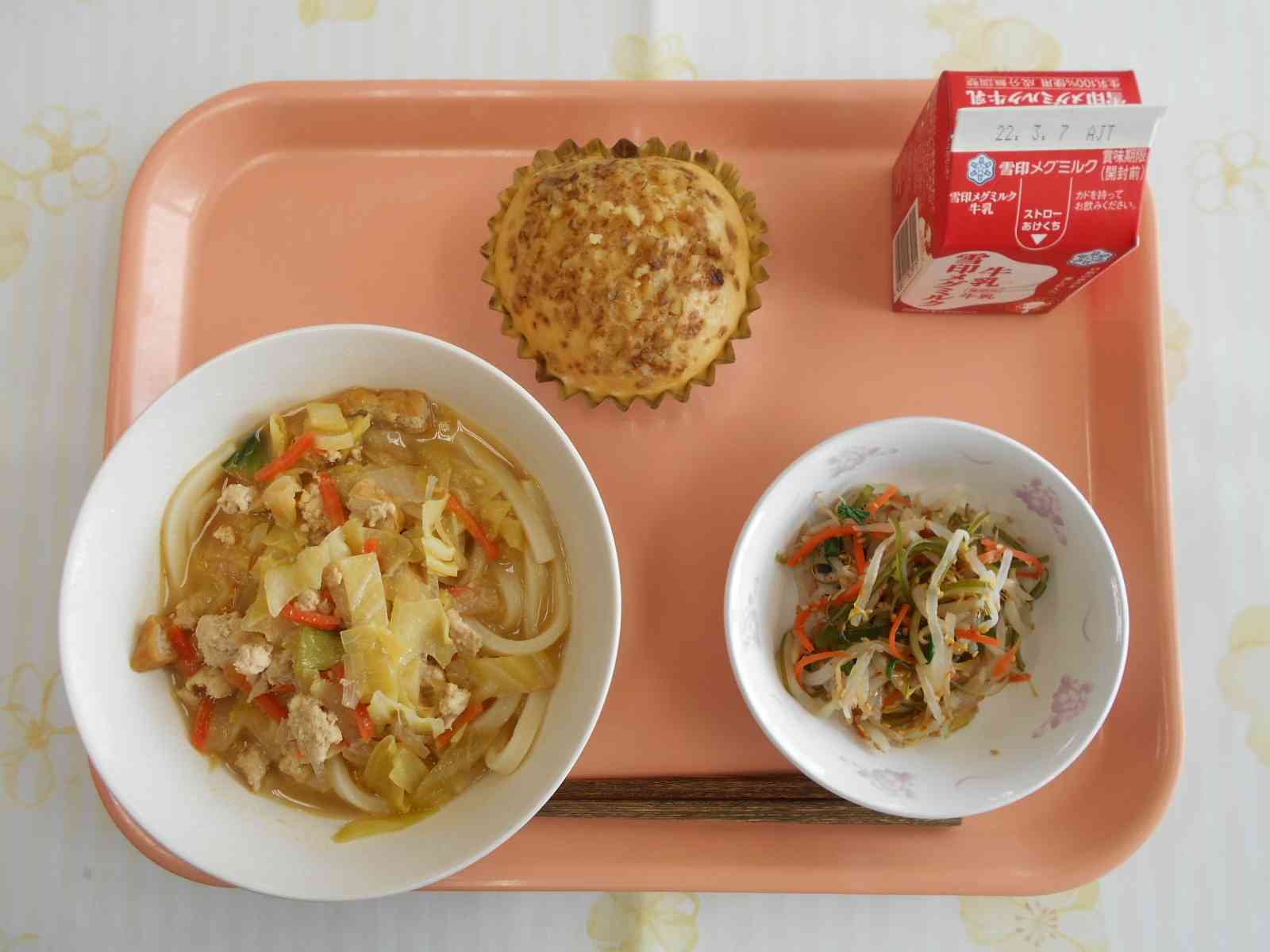 ○牛乳 ○ごま味噌坦々(たんたん)うどん 〇茎わかめのナムル 〇マーラーカオ(くるみ入り) ☆一口メモ☆ マーラーカオは中国の蒸しカステラです。中国語で「マーラー」はマレーシア、「カオ」はケーキという意味で「マレーシアから中国にやってきたお菓子」という意味になります。卵をたっぷり使った生地で、卵のやさしい風味を感じながら食べてくださいね。 写真2枚目 手作りのマーラーカオです。カップに生地を流し込んで、上からくるみをトッピングしました。 生地の砂糖は、三温糖と黒砂糖を使っているので、やや茶色みがかった色をしています。 ふくらみやすい生地にするために、薄力粉などの粉は2回ふるう、混ぜるときは混ぜすぎない等のコツをおさえて作りました。 写真3枚目 蒸し上がったところです。ふっくらふくらみました!【添付ファイル】