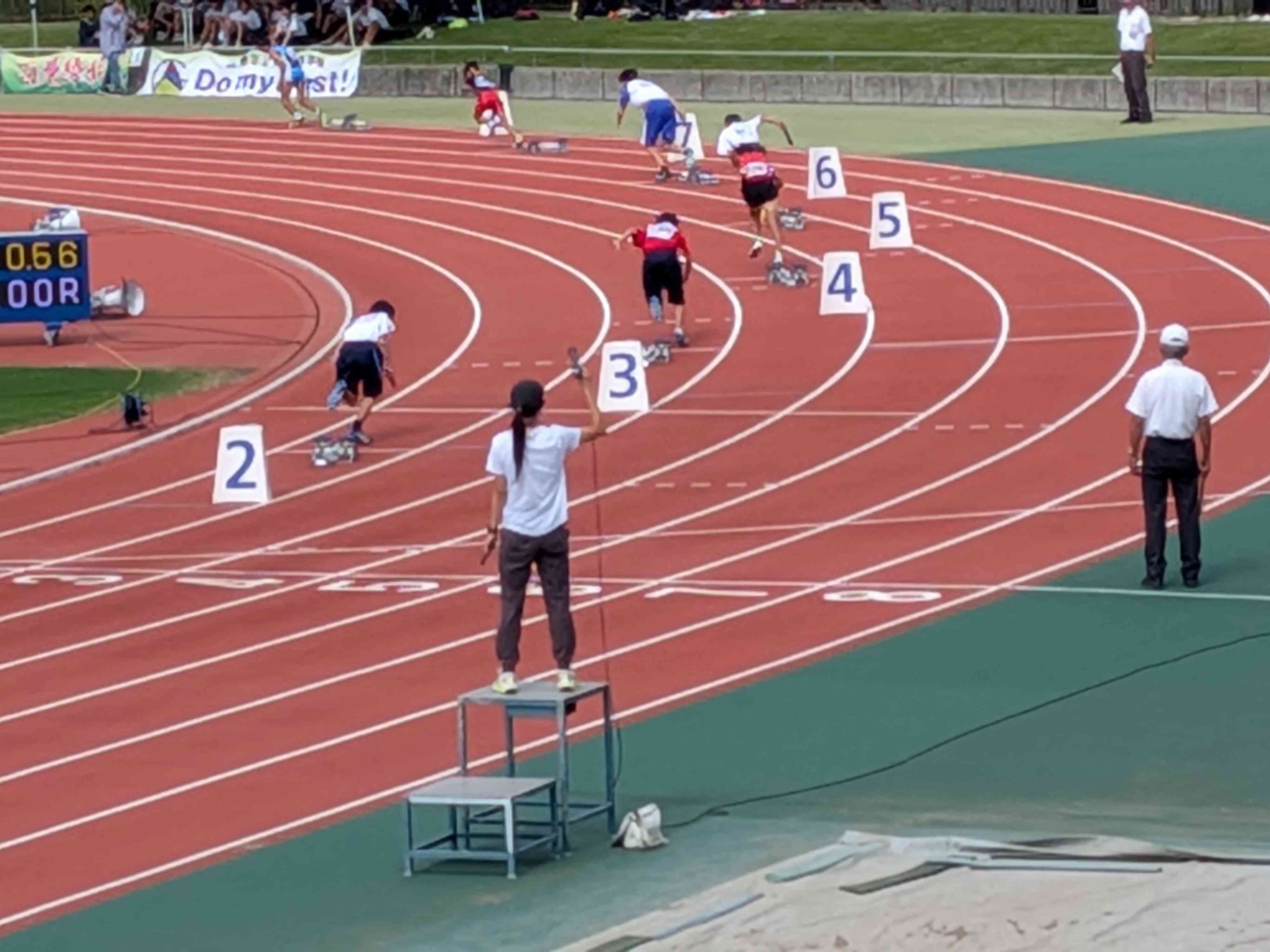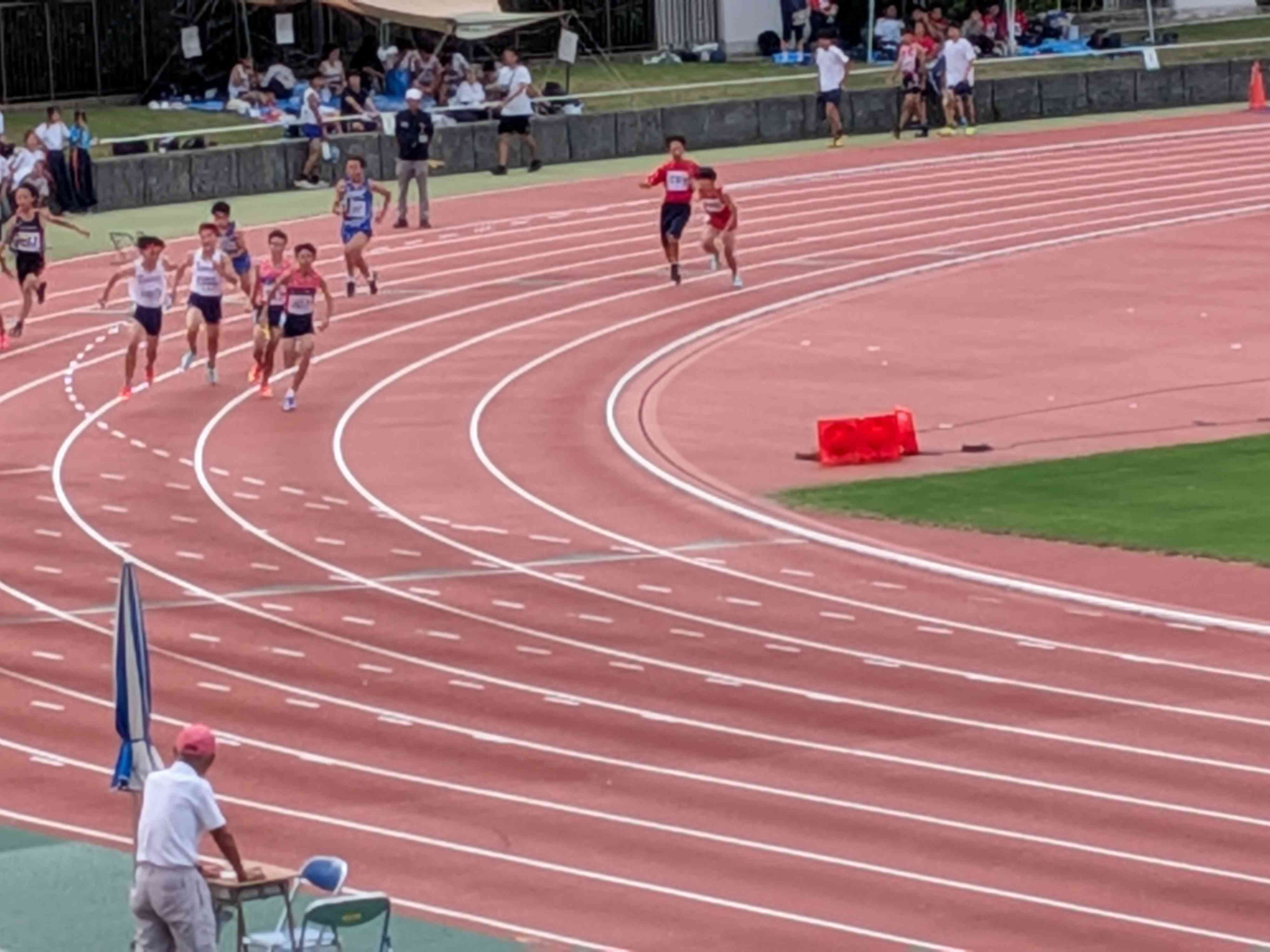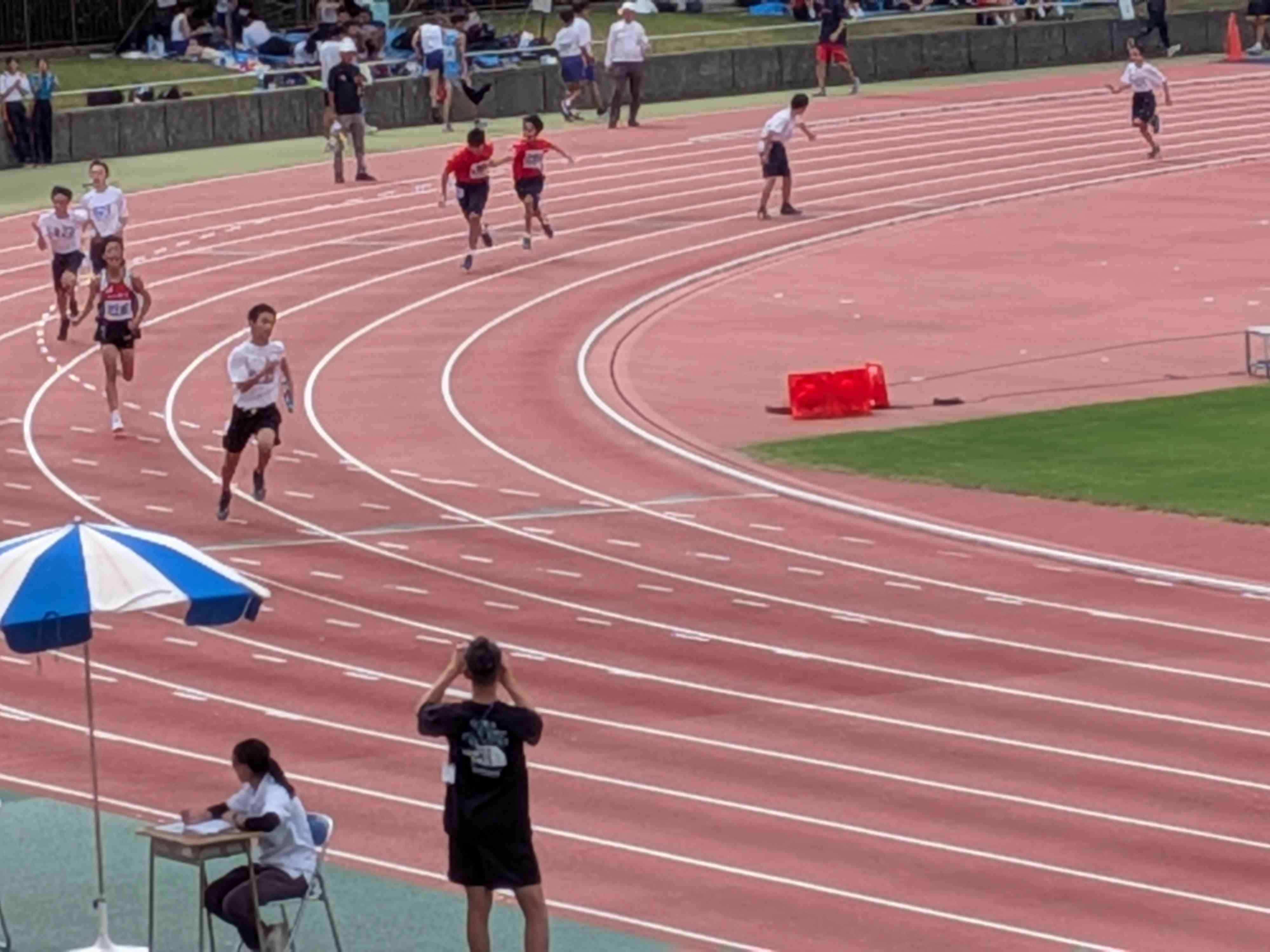 リレーの予選が行われています。本校は1年男子と共通男子にエントリーしています。 今、発表があり、共通男子は決勝進出です。