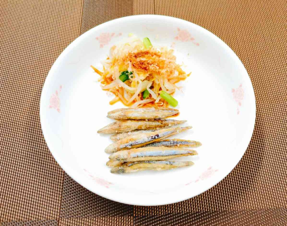 ○牛乳 ○わかめご飯 ○きびなごの唐揚げ ○ゆで野菜 ○高野豆腐のかきたま汁 定期的に骨ごと食べられる小魚を給食に出しています。 シシャモやワカサギ、そしてメヒカリなどです。 今日はキビナゴを使った唐揚げです。 二度揚げすることで、カリッとスナック感覚で食べられます。 魚料理は、残菜(食べ残し)が多いのですが、このキビナゴの唐揚げは残菜が少なく、好評です。