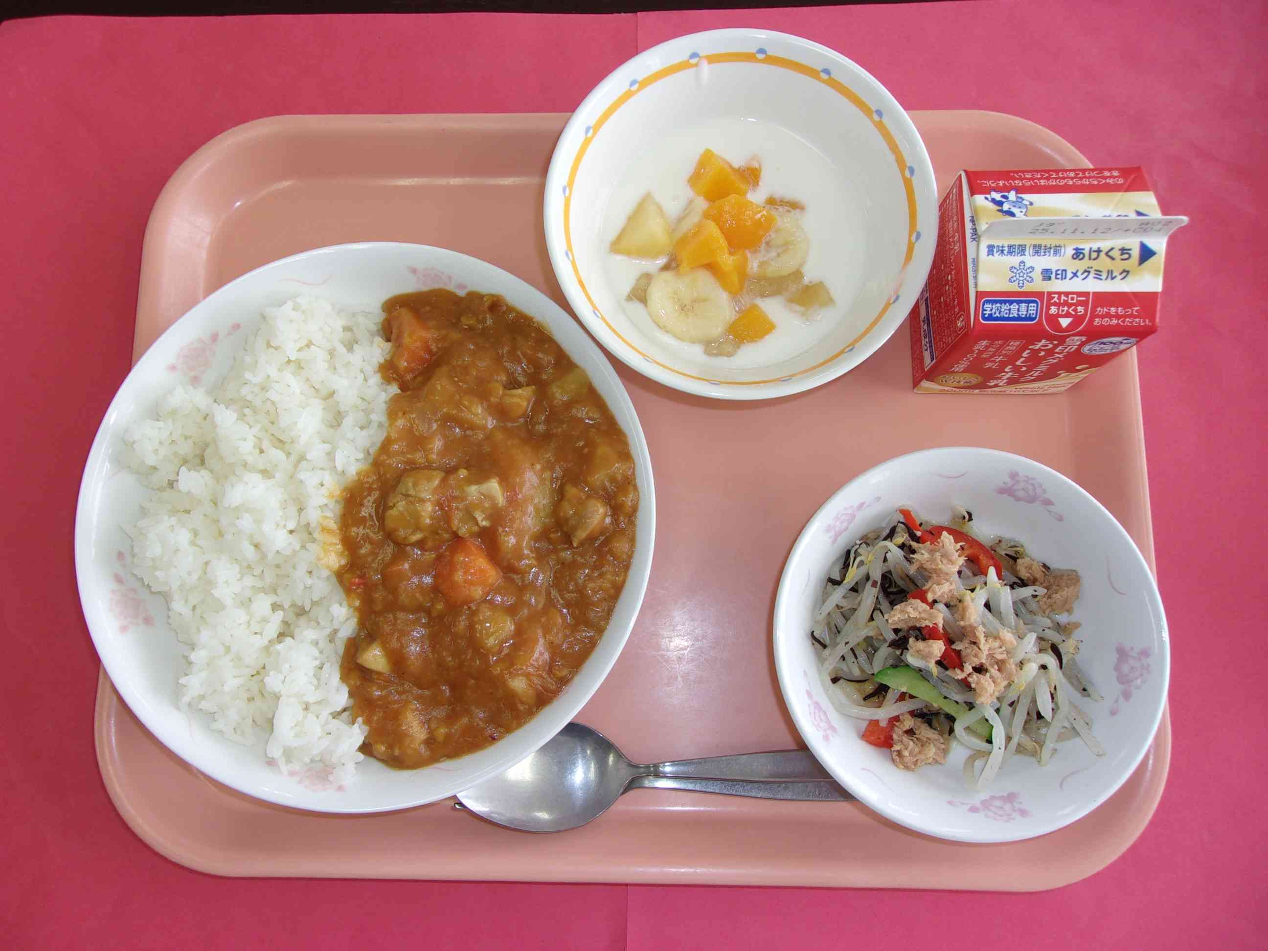 ○牛乳 ○カレーライス ○ひじきのサラダ ○フルーツヨーグルト カレーライスは、どの時代、どの年代にも好かれるメニューです。 カレールウを作るのに、長時間焦がさずに釜で練り上げるため、朝からカレーの香りが校舎内に立ち込めていました。 カレーとフルーツヨーグルトはとても好評でしたが、野菜は苦手な生徒も多く、残菜が目立ちました。 どうしたら、野菜を好きになってもらうか? 日々、悩みながら試行錯誤しています。【添付ファイル】