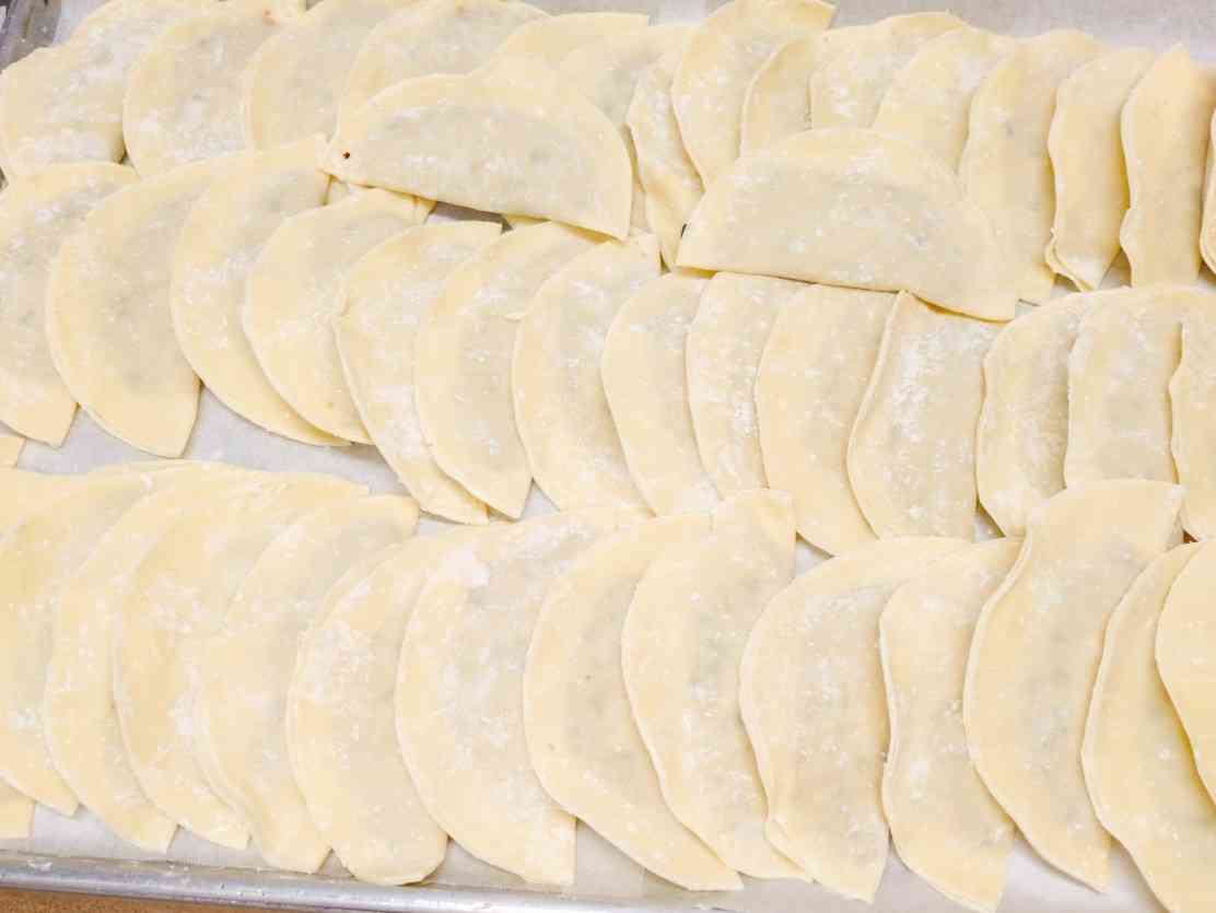 ○牛乳 ○ゆかりごはん 〇ジャンボ餃子 〇バンサンスー 〇ちんげん菜のスープ 給食の餃子は、まず具を炒めるところから始まります。 本来は挽肉にみじん切りにした野菜を加えてタネを作り、生のまま皮で包みますが、衛生を考え、先に加熱してしまいます。 ジャンボ餃子の皮は、直径16cm。 この大きな皮に一つ一つ丁寧に具を挟んで揚げました。