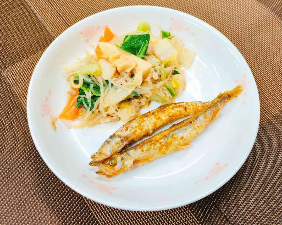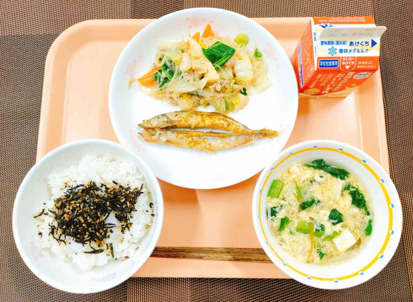 ○牛乳 ○ごはん 〇ひじきふりかけ 〇揚げシシャモ(カレー風味) 〇炒合菜(チャオフォツァイ) 〇めかたま汁 シシャモは漢字で「柳葉魚」と書きます。 アイヌ語の「シュシュ・ハム」(susu-ham=柳の葉の魚)がなまったものだそうです。その昔、食べ物がなくて困っていた人々を救うために、神様が柳の葉を川に流したところ、それが魚(シシャモ)に変わったという言い伝えから名付けられたそうです。 私たちが日々、給食や食卓で食べているシシャモは、北海道のものではなく、北大西洋で獲れたカラフトシシャモです。海水温の上昇や産卵場所が護岸工事などでなくなり、北海道の固有種のシシャモはほとんど獲れなくなってしまいました。 シシャモ、カラフトシシャモに限らず、大切な資源である食材を無駄なく食べて、感謝の心を忘れないでほしいと思います。【添付ファイル】