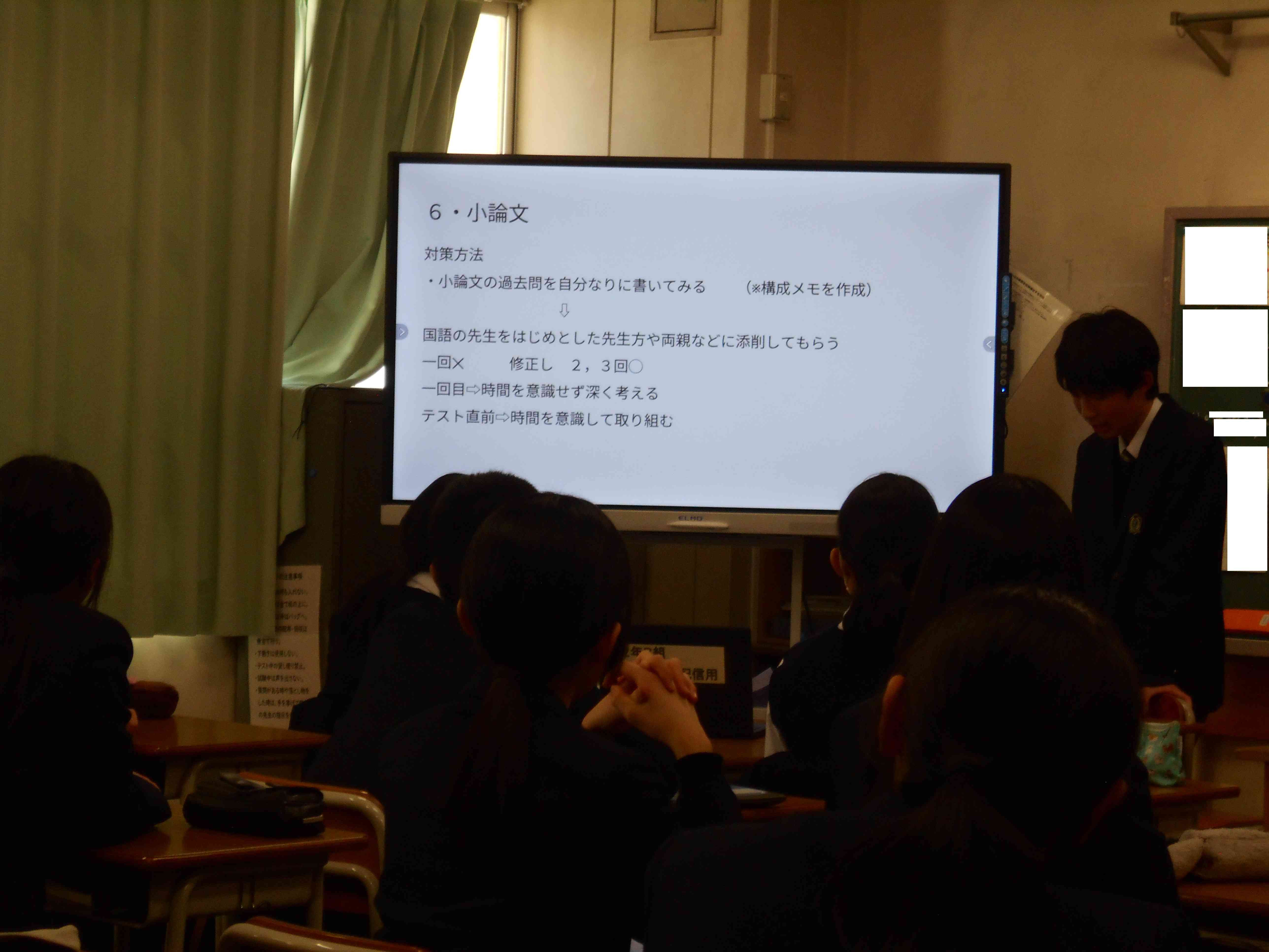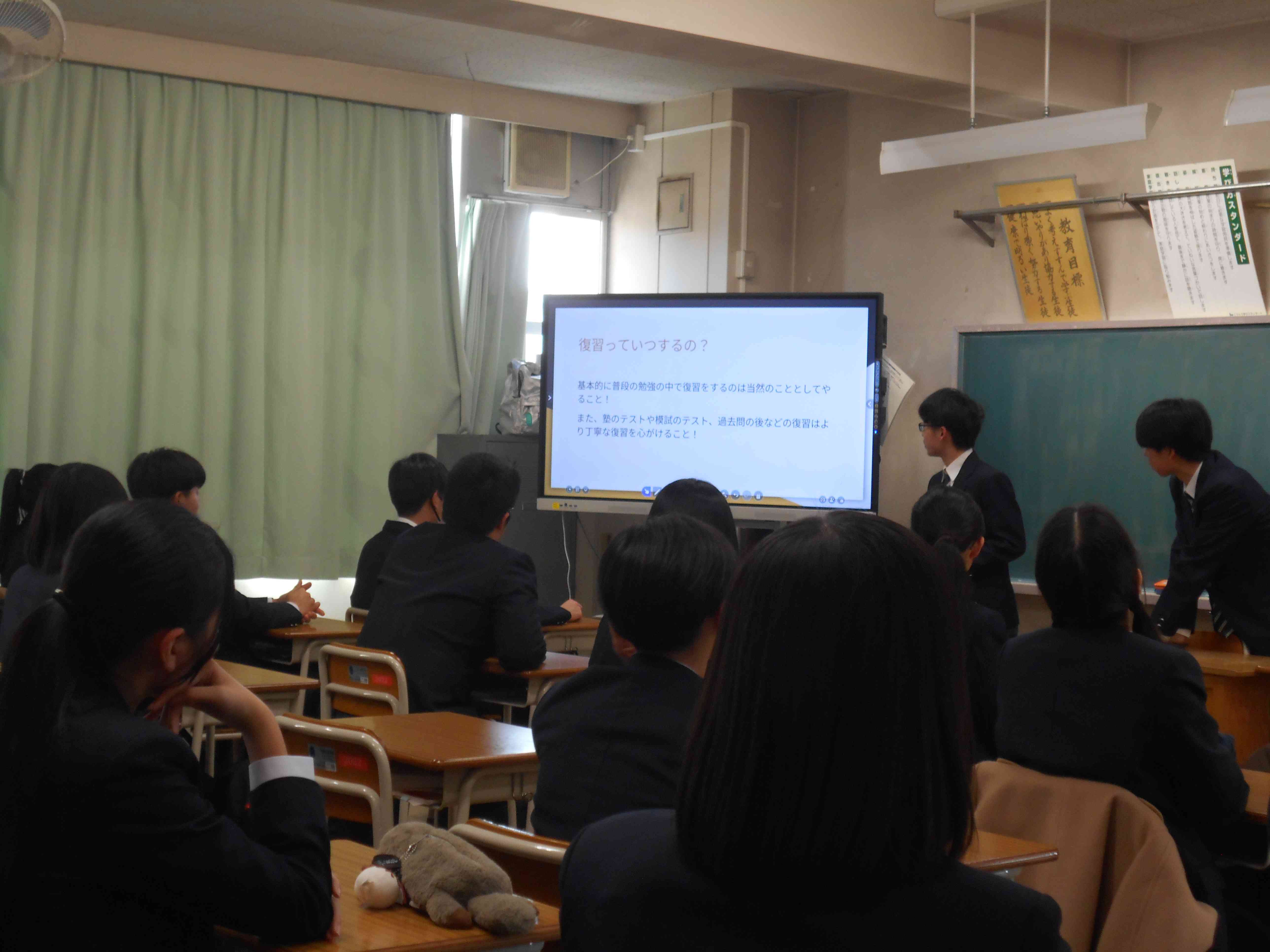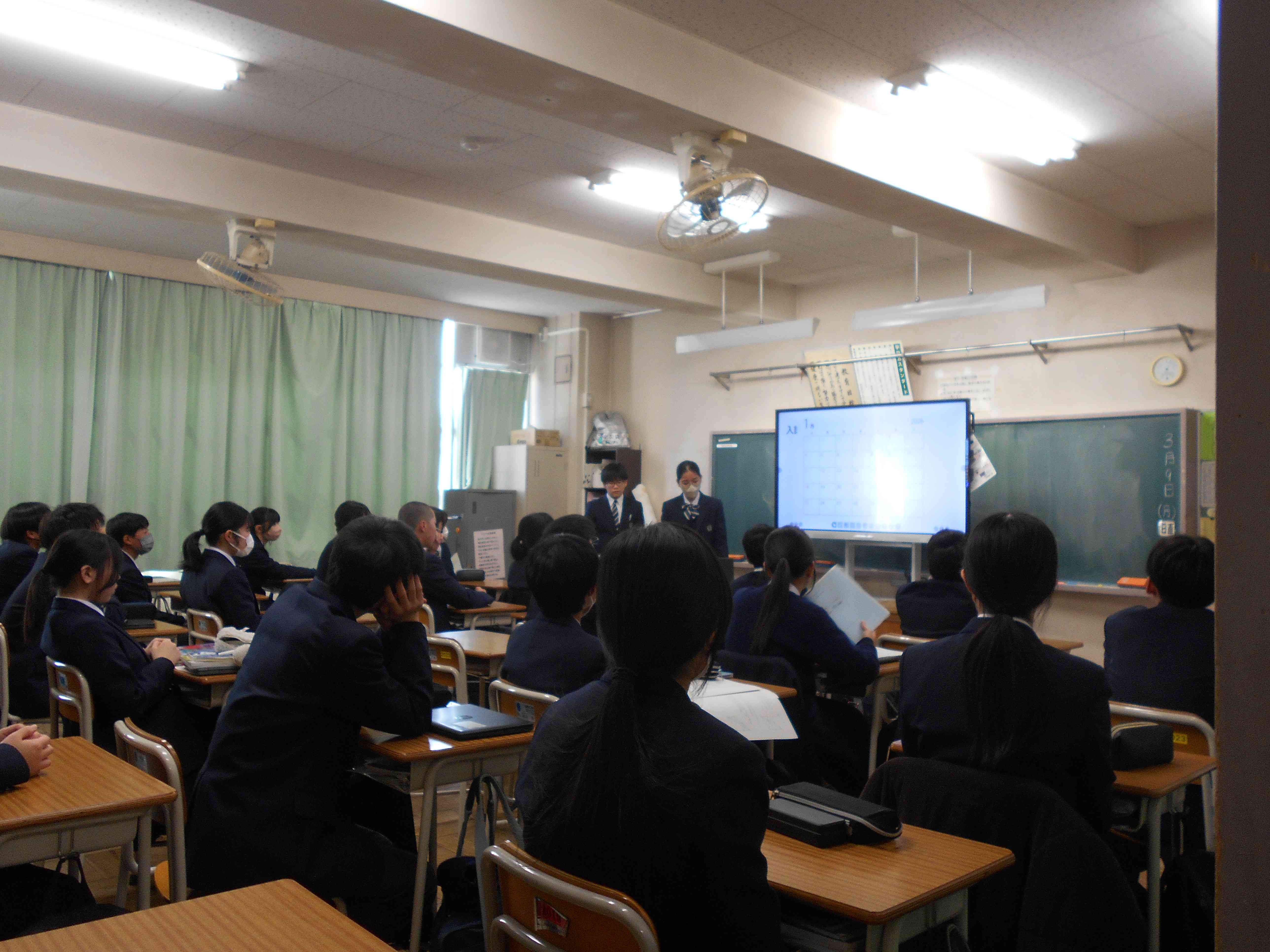 3月9日(月)、3年生の代表数名が2年生の各教室で進路について話しました。 自身の体験をもとに、学校の選択方法、勉強の仕方、心がけることなど、分かりやすく説明しました。 2年生は集中して話を聞いていました。 とても良い機会になりました。3年生の皆さん、ありがとうございました。 副校長 山田陽子