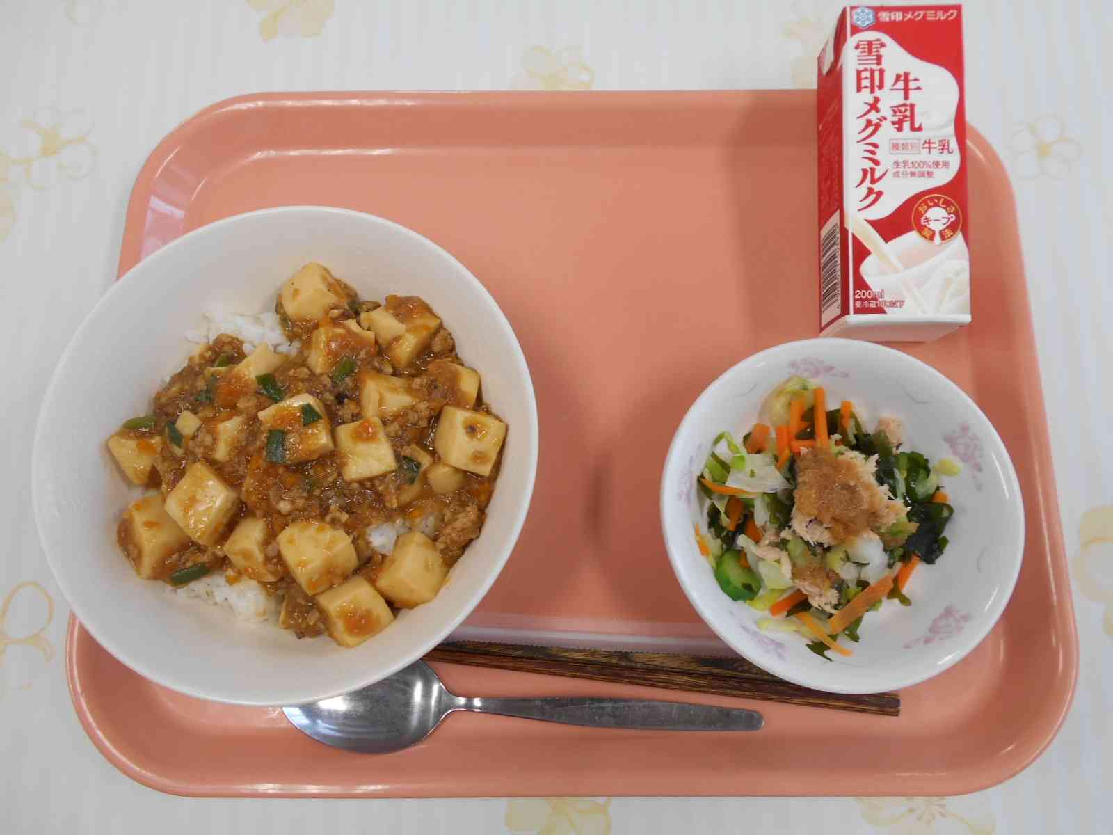 ○牛乳 ○マーボー丼 〇ツナサラダ ☆今週は感染リスクを軽減しつつ献立に配慮した「フタサラ給食」です。