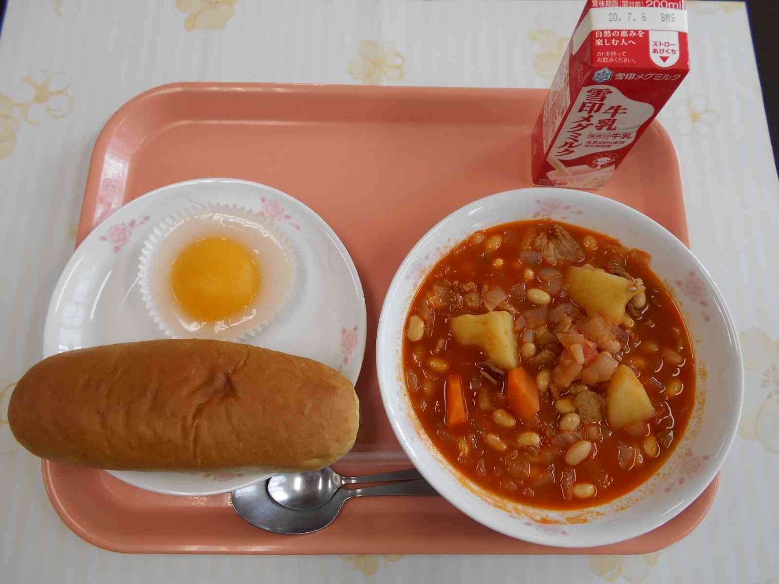 ○牛乳 ○あしたばパン 〇ポークビーンズ 〇おかしな目玉焼き(カルピスゼリーと黄桃) ☆今週は感染リスクを軽減しつつ献立に配慮した「フタサラ給食」です。