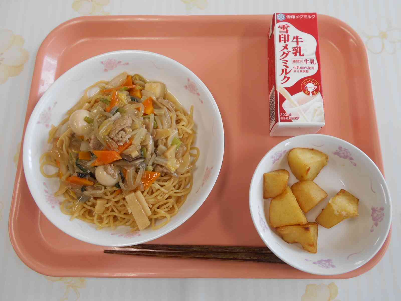 ○牛乳 ○炒めそば五目あんかけ 〇じゃがいものからあげ ☆今週は感染リスクを軽減しつつ献立に配慮した「フタサラ給食」です。