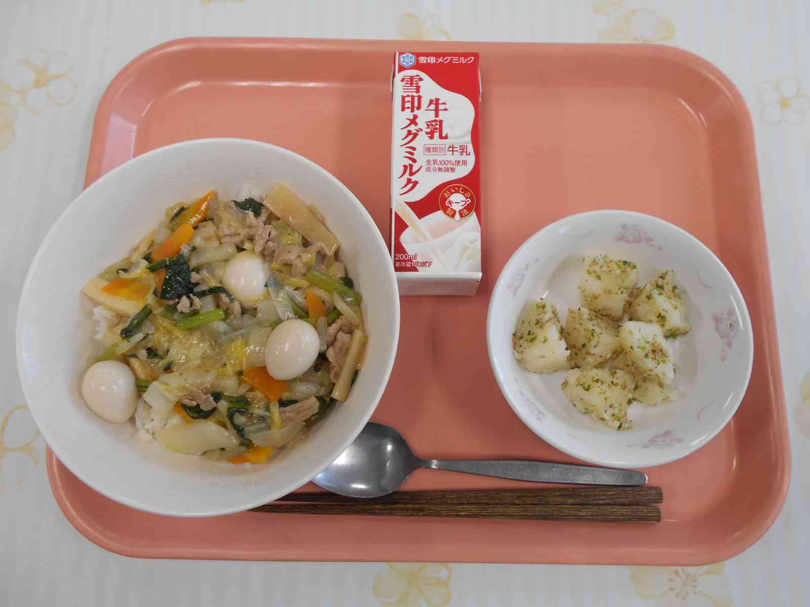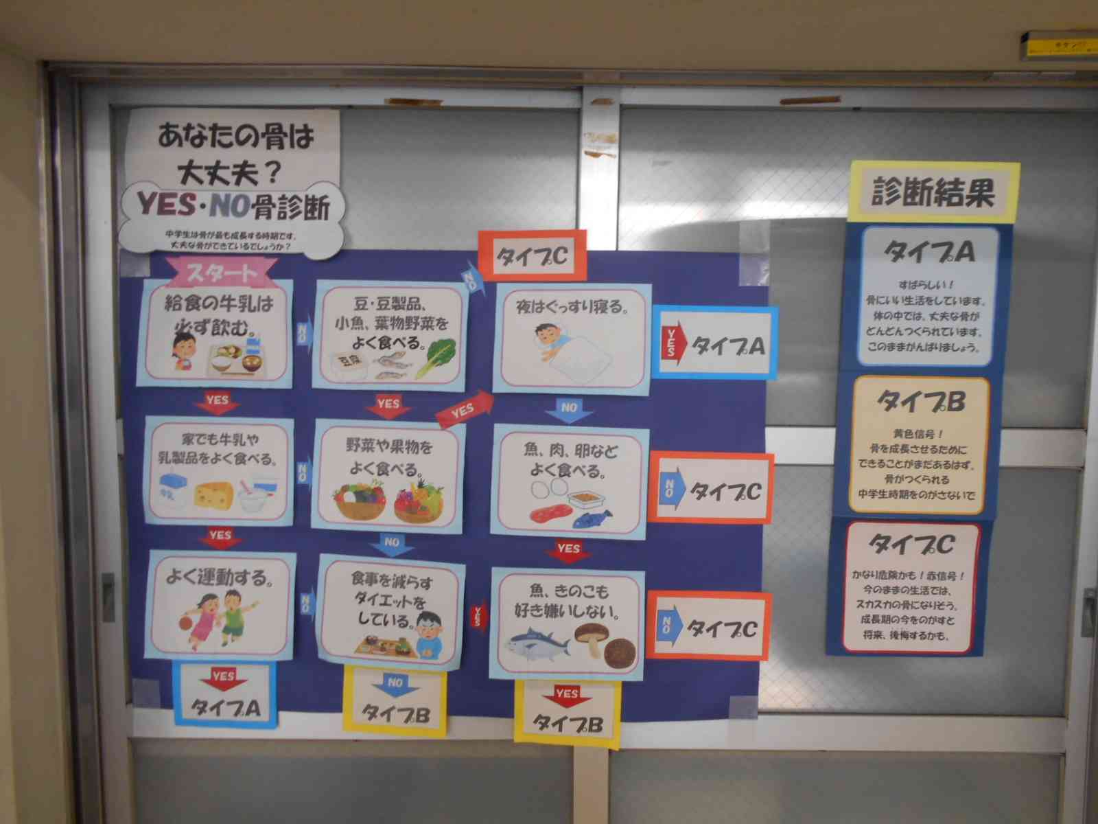 ○牛乳 ○中華丼 〇ポテトの香味和え ☆一口メモ☆ ポテトの香味和えは、粉ふきいもに青のりとすりごまをまぶして、風味よく作りました。給食によく登場するじゃがいもは、ビタミンCの多い野菜です。キャベツなどの葉物野菜のビタミンCは、火を通すと壊れて大幅に減ってしまいますが、じゃがいものビタミンCは火を通しても壊れにくくなっています。 写真下は今日のお昼の放送で紹介された、給食室前に掲示してある「あなたの骨は大丈夫? YES・NO骨診断」です。時間のあるときに診断してみましょう。【添付ファイル】