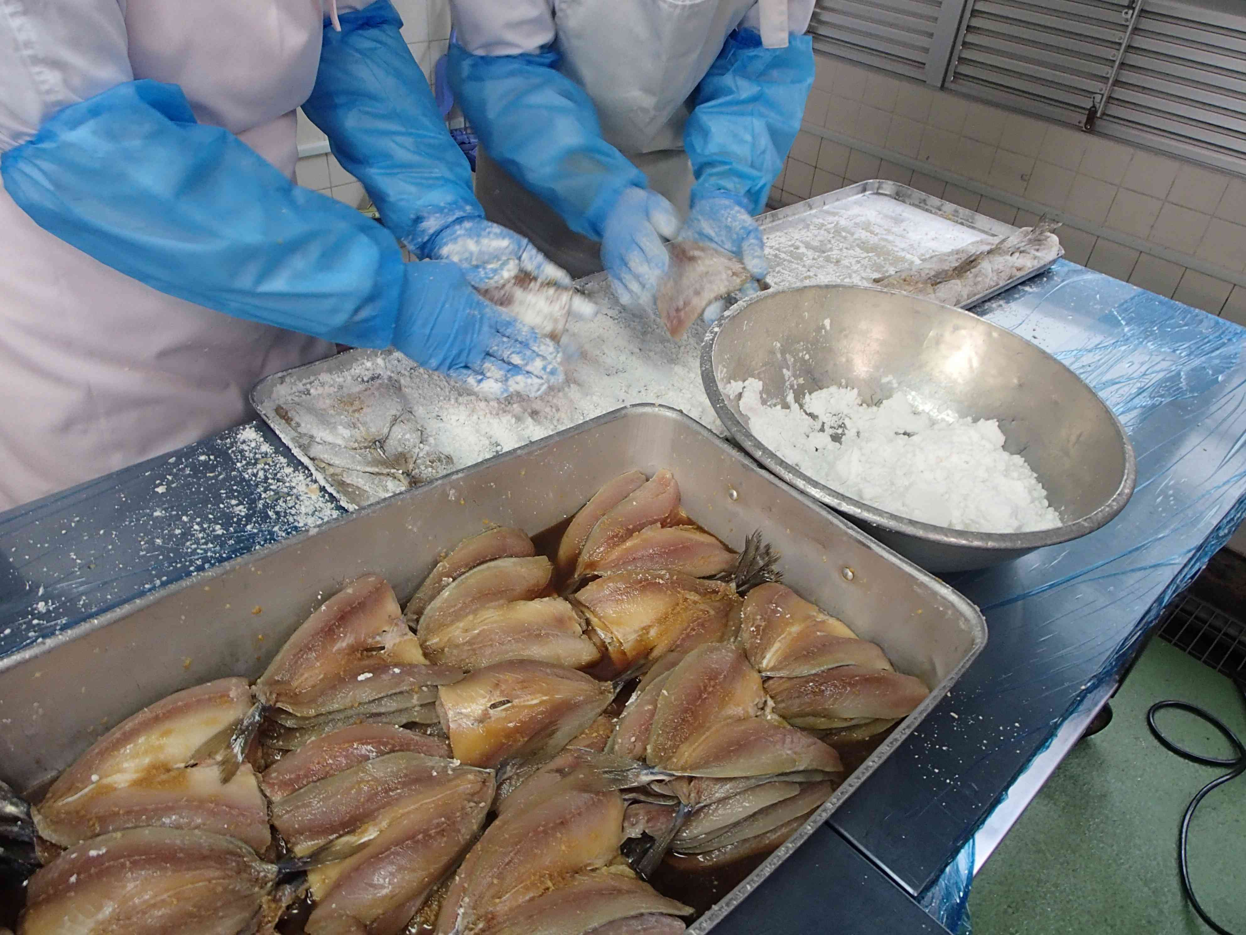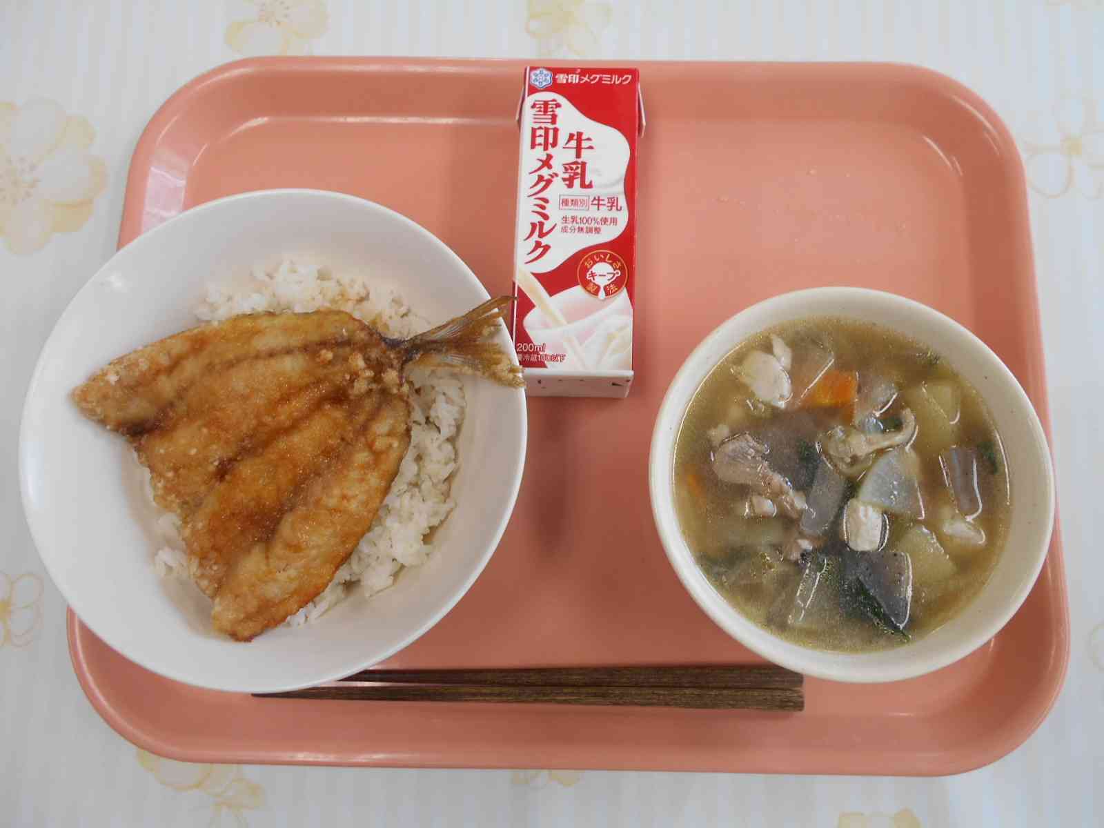 ○牛乳 ○鯵(あじ)のかば焼き丼 〇具だくさんけんちん汁 ☆一口メモ☆ アジについてのクイズです。アジの名前の由来はなんでしょうか。 (1)「あじかわ」さんという人が発見したから (2)味が良いから (3)アジアを代表する魚だから 答えは、(2)味が良いからアジという名前になったと言われています。 アジの旬は6~7月。今日は、とれたての新鮮なものを使うので、くさみが少なく食べやすいと思います。 写真2枚目 アジをしょうが醤油の下味につけてから、片栗粉をまぶして揚げました。 片栗粉がダマにならずに均一につくように、1枚ずつ手作業でつけています。【添付ファイル】