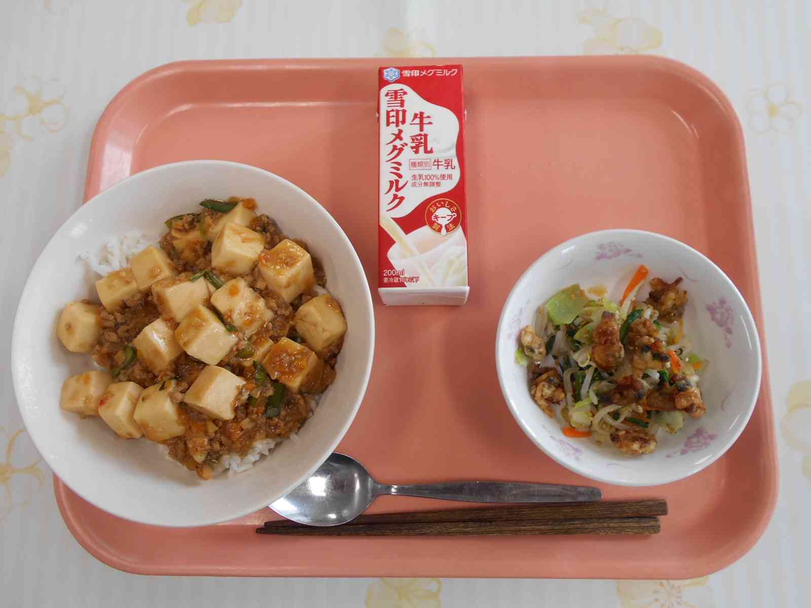 ○牛乳 ○麻婆丼 〇あさりのカリッとサラダ ☆一口メモ☆ あさりを油でかりっと揚げてサラダに入れました。あさりにしょうが醤油の下味をつけているので、苦手な人にも食べやすくなっています。あさりは鉄分が多く、貧血予防にも役立ちます。