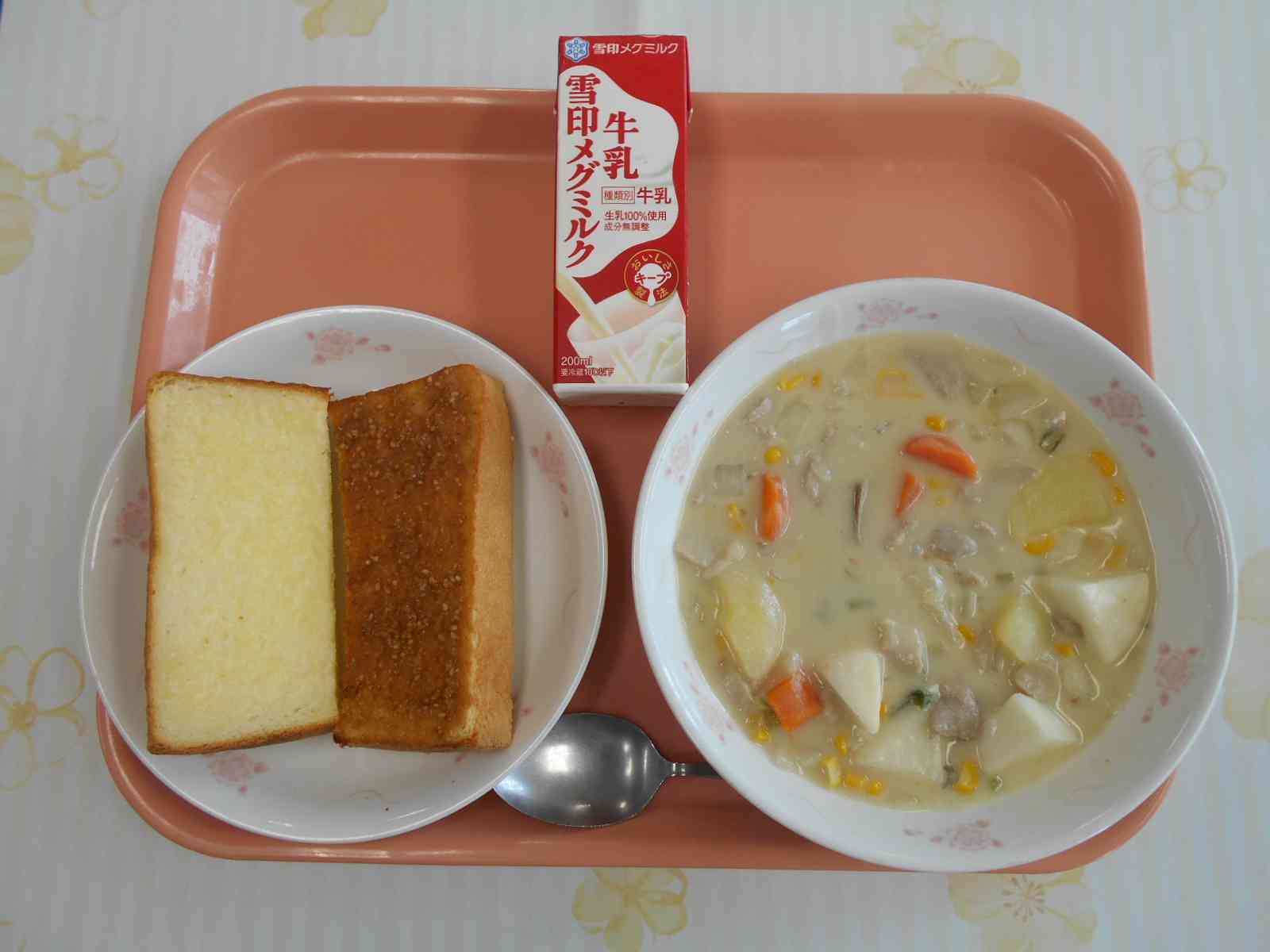 ○牛乳 ○クリームチーズトースト 〇ごまきな粉トースト 〇豆乳仕立てのクリームシチュー ☆一口メモ☆ 今日のシチューには、豆乳と牛乳が半分ずつ入っています。牛乳には動物性たんぱく質が、豆乳には植物性たんぱく質が含まれています。たんぱく質は、動物性・植物性の両方をとると良いと言われています。