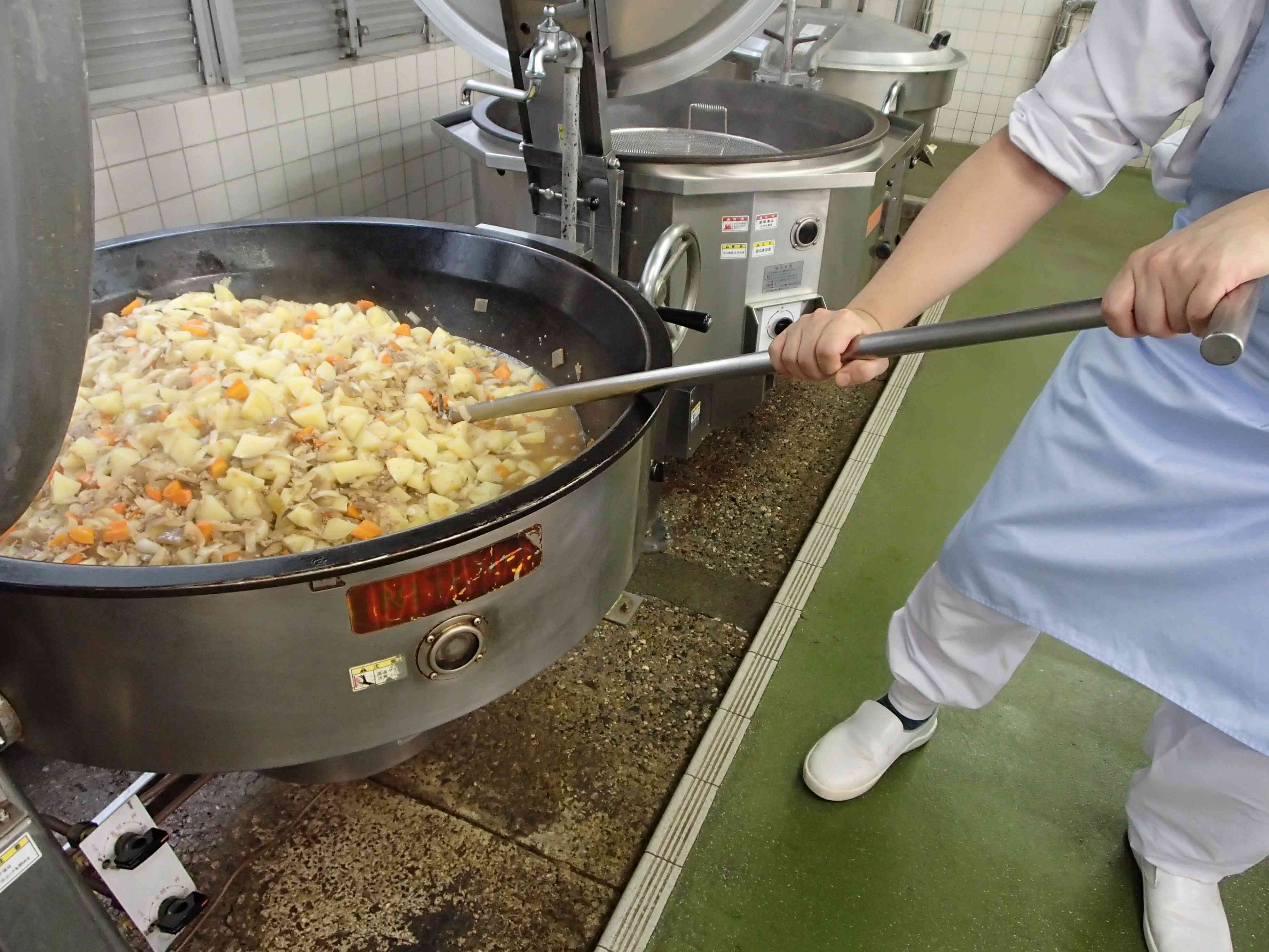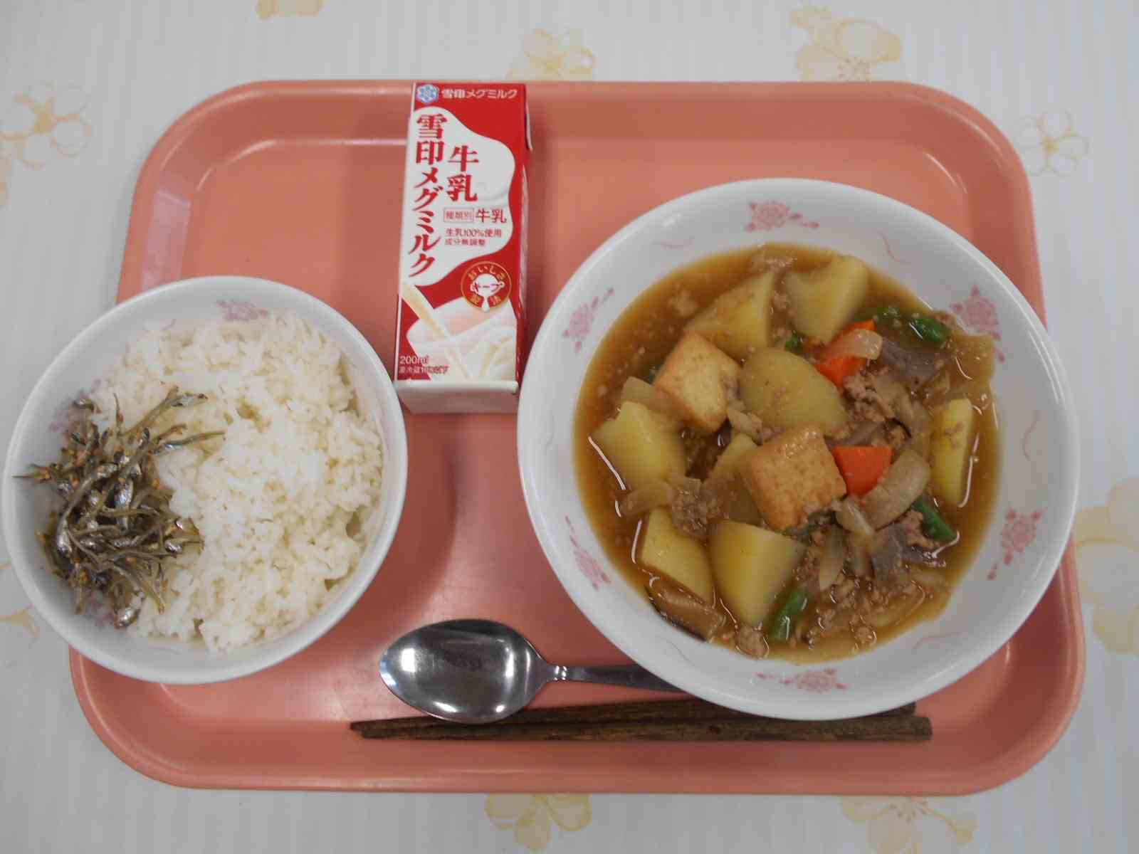 ○牛乳 ○ご飯 〇小魚の揚げ煮 〇じゃが芋と生揚げのそぼろ煮 ☆一口メモ☆ 生揚げの別名は、厚揚げです。ここでクイズです。生揚げも、油揚げも豆腐を油で揚げて作りますが、油揚げの別名はなんでしょうか。 (1)やきあげ (2)うすあげ (3)あげあげ 答えは(2)うすあげ(薄揚げ)です。油揚げは、豆腐を薄く切ってから揚げて作ります。 写真2枚目 ご飯を炊く日は、炊飯器の1釜ずつに分けてお米を洗っています。今日のお米は全部で24kg。1釜6kg、4釜に分けて炊飯しました。写真は洗ったお米の水をきっているところです。水切りの加減がお米の炊きあがりに影響するので、ザルを上下に振って水をよくきります。 写真3枚目 じゃがいもと生揚げのそぼろ煮は、大きな回転釜いっぱいにできました。80kgもある料理を混ぜるのには、とても力がいります。てこの原理を利用して、食材がまんべんなく混ざるように、釜の下から上にヘラを動かします。 支点・・・回転釜のフチ 力点・・・調理員さんの手の部分 作用点・・・ヘラの先端(食材があるところ)【添付ファイル】