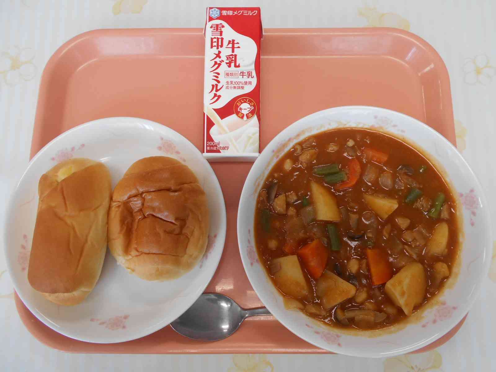 〇バターロールパン 〇ダイスチーズパン 〇チキンと豆のブラウンシチュー ☆一口メモ☆ シチューには、いんげん豆とさやいんげんが入っています。さやいんげんは、いんげん豆が若いうちに収穫してさやごと食べているものです。いんげん豆は、さやの中の豆だけ食べているものです。ここで、クイズです。今日のシチューに入っているさやいんげんは、ケンタッキーワンダーという品種ですが、ある生き物に似ている形をしていることから、別の名前があります。その名前は何でしょうか。 (1)ドラゴンいんげん (2)ドジョウいんげん (3)ヘビいんげん ・・・・答えは(2)ドジョウいんげんです。このいんげんは、すじが少なくやわらかいのが特徴で、日本で一番多く流通している品種です。【添付ファイル】