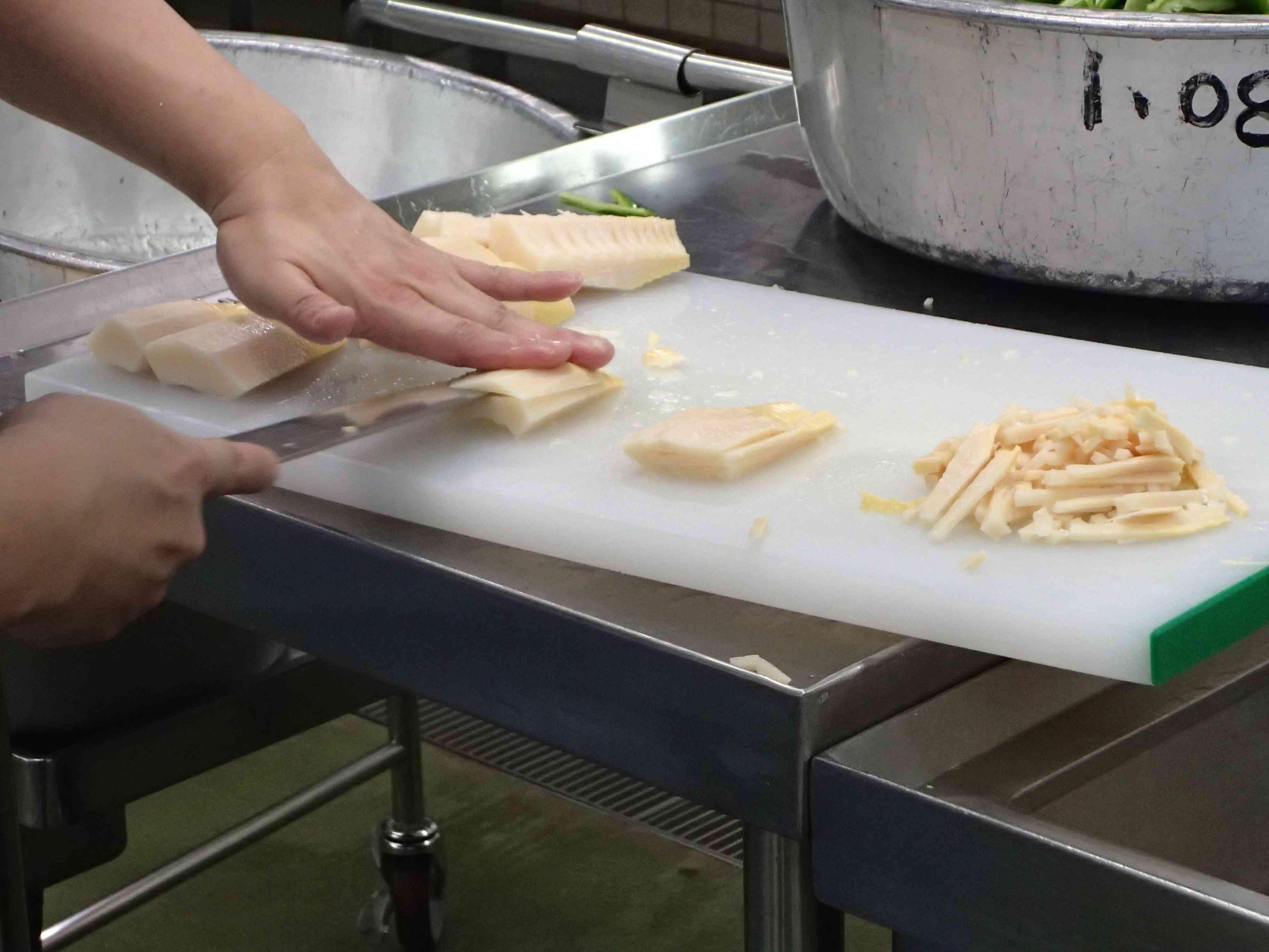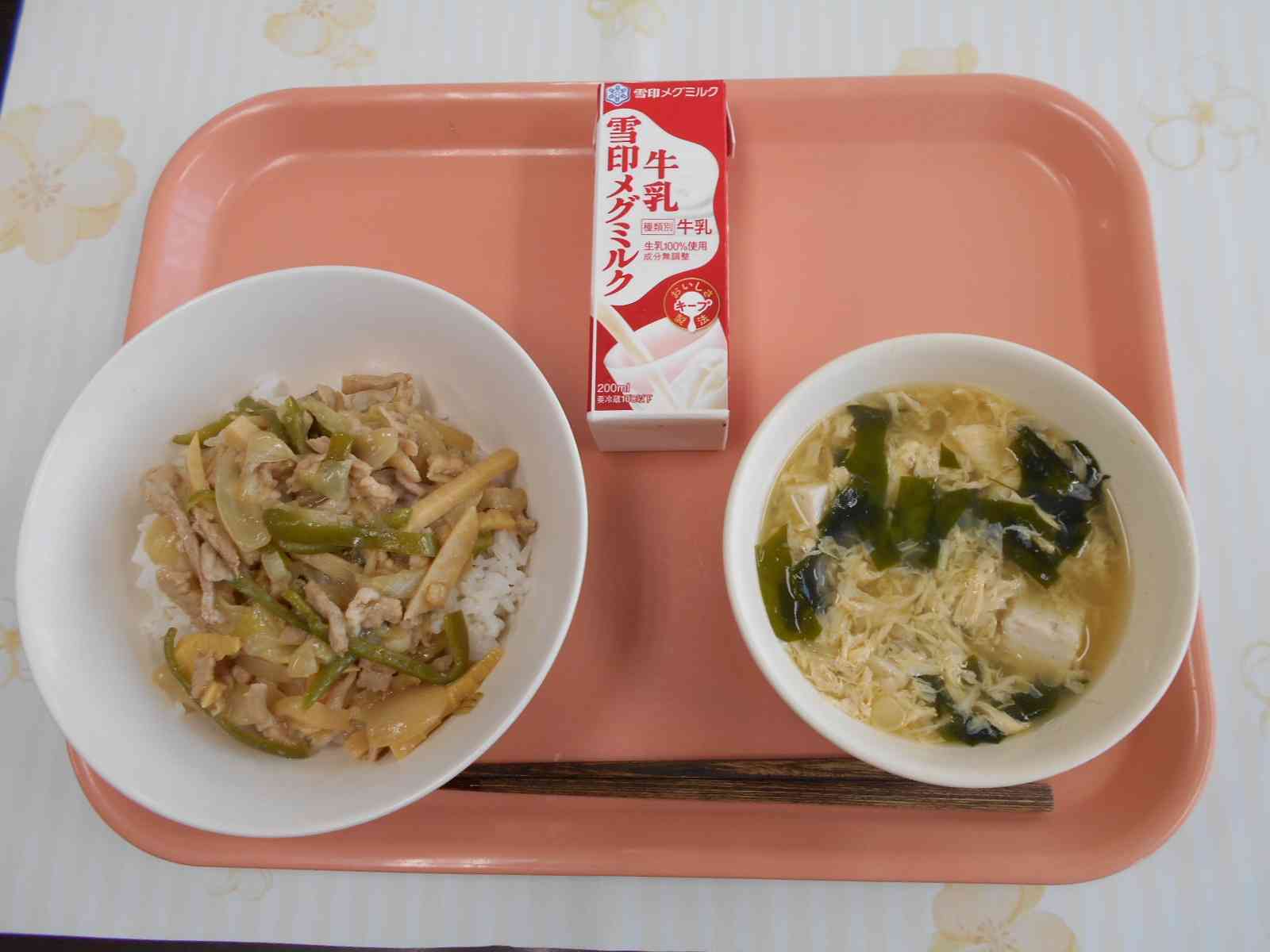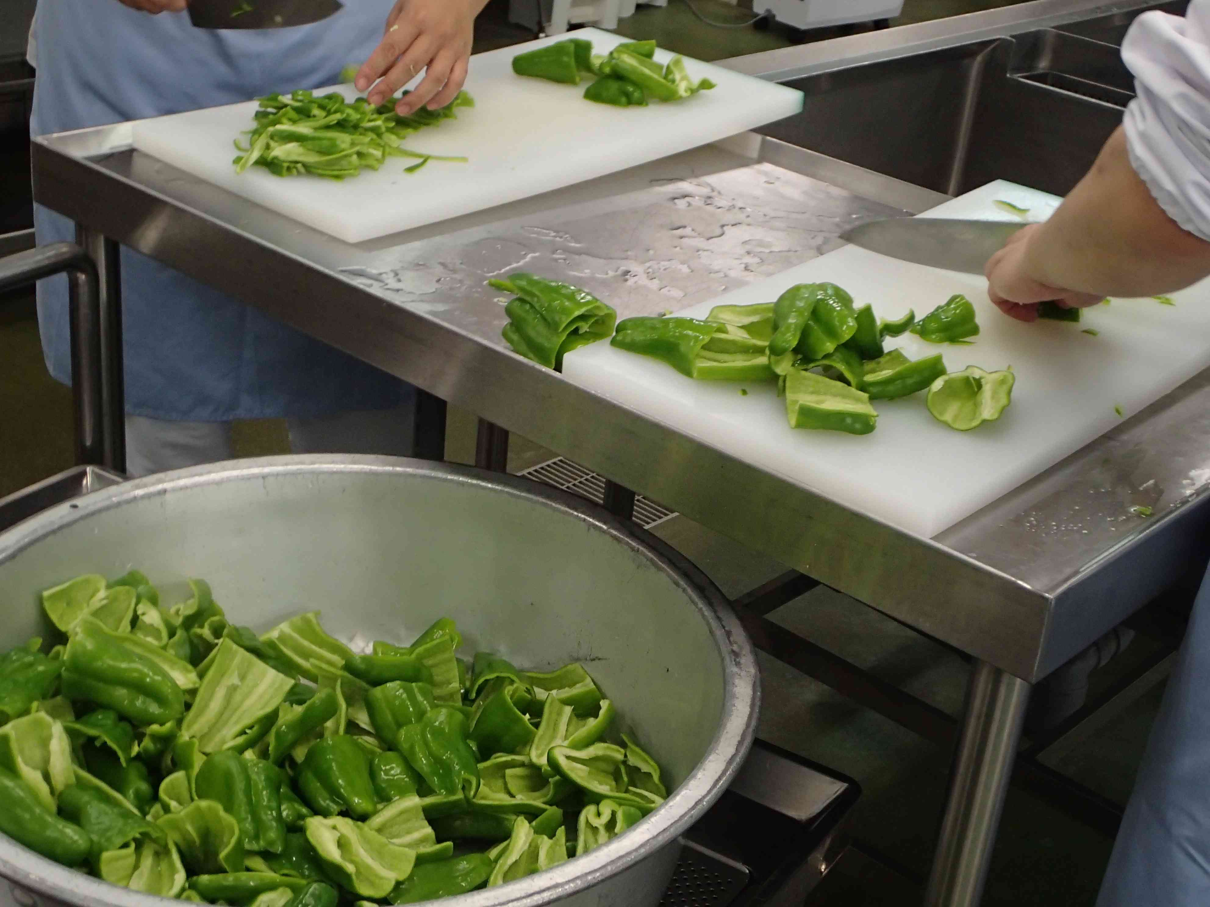 〇チンジャオロースー丼 〇わかめと卵のスープ ☆一口メモ☆ 夏においしいピーマンをごはんがすすむチンジャオロースーにしました。ピーマンは、包丁で切るときの方向で食感や味が変わります。ピーマンの繊維は縦に走っているので、繊維にそって縦の向きに切ると、苦みが少なく、しゃきしゃきとした食感が楽しめます。反対に、繊維をたち切るように横の向きに切る場合は、苦みを味わいたいときや、短時間で火を通したいときに向いています。切り方ひとつでも仕上がりに影響が出るので、料理に合ったものを考えるとよりおいしくなります。今日のチンジャオロースーは、縦の向きに切って食感を意識しました。 写真2枚目 八百屋さんにピーマン7kg分を納品してもらいました。 大きめのピーマンは1個50g弱なので、140個くらいの数があったかもしれません。調理員さんが、手際よく切ってくれました。 ピーマンが苦手な人も多いと思いますが、縦に切ったおかげで苦みが出にくかったのでしょうか、チンジャオロースーの残りはほとんどなかったです。 写真3枚目 ピーマンの千切りの大きさに合わせて、タケノコも千切りにしました。厚みを薄く切ってから、千切りにしていきます。【添付ファイル】