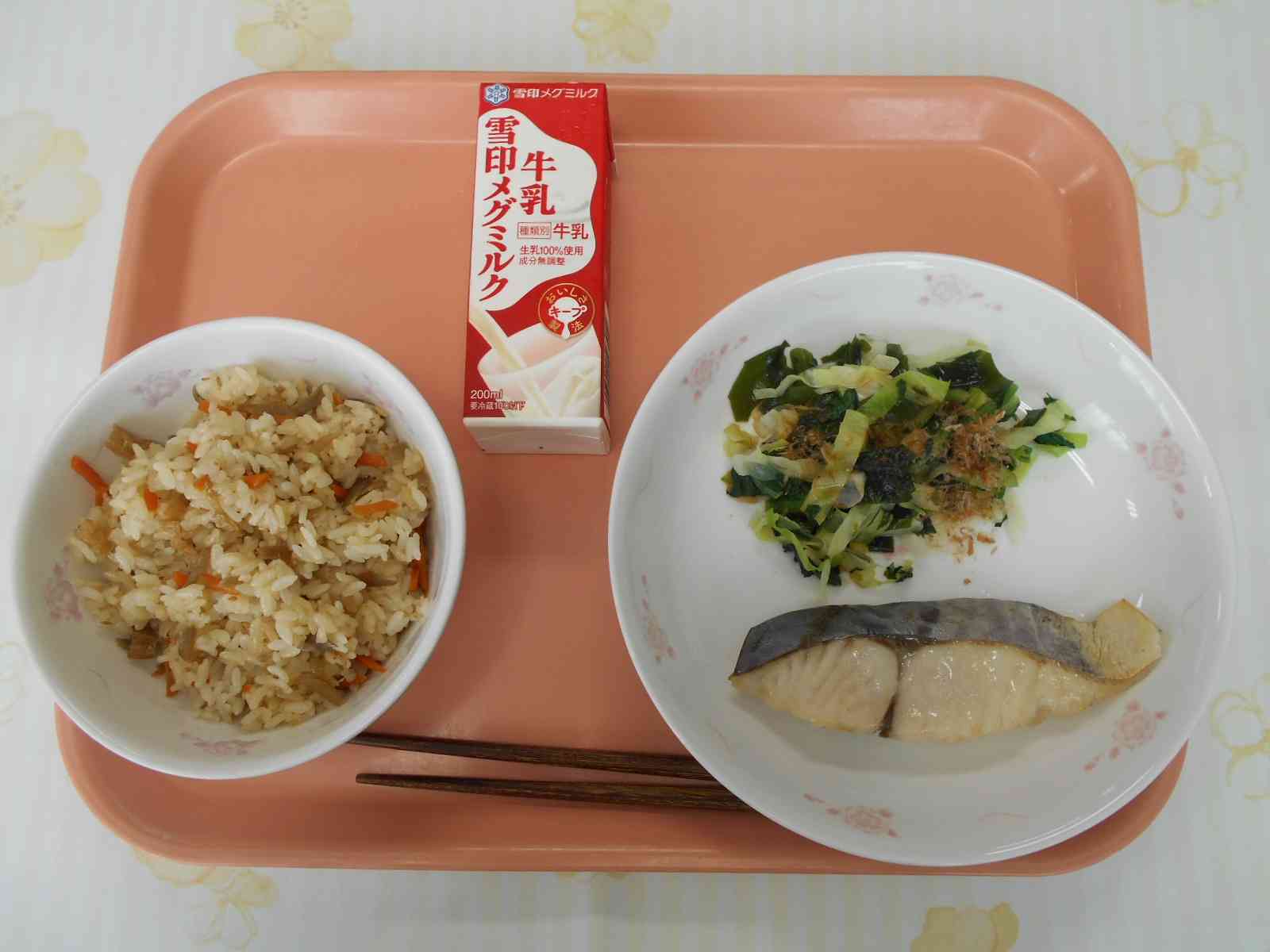 〇きんぴらおこわ 〇鰆(さわら)の塩こうじ焼き 〇おかか和え ☆一口メモ☆ 今日のさわらは、塩こうじにつけ込んでから焼きました。お魚を塩こうじに漬けこむと、まろやかなあまみと優しい塩味、そして深みのある味わいに仕上がります。塩こうじは、「塩」と「こうじ」を混ぜて発酵させた調味料です。私たちの食生活には、発酵食品が身近にあります。ここでクイズです。次の3つのうち、発酵食品は、どれでしょうか。 (1)砂糖 (2)塩 (3)みそ ・・・答えは、(3)みそです。他にもしょうゆ、納豆、キムチ、ヨーグルトなどの発酵食品があります。【添付ファイル】