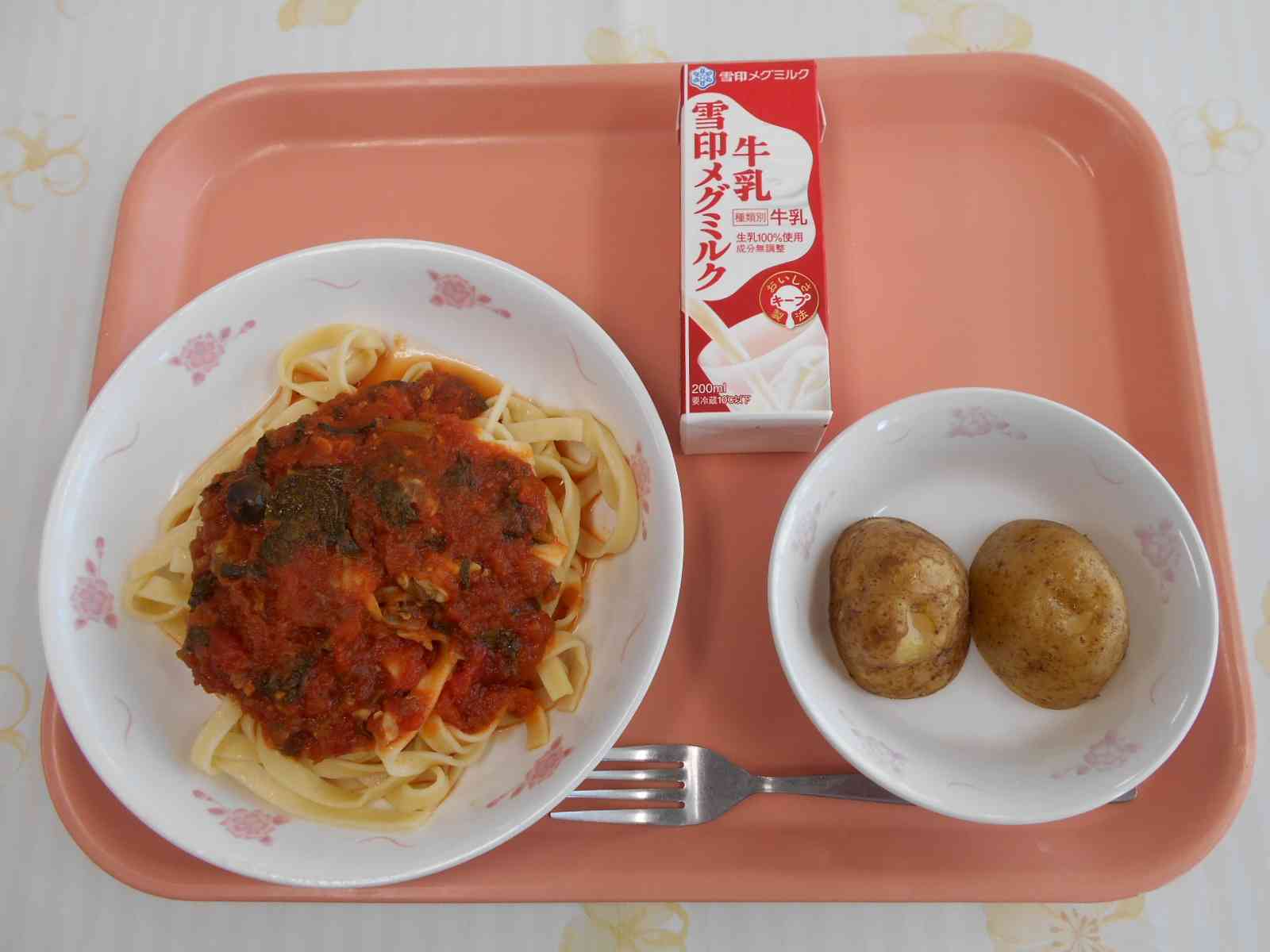 ~イタリアの味めぐり~ 〇ボンゴレ・ロッソ(生パスタを使っています) 〇ロ-ストポテト ☆一口メモ☆ イタリアの味めぐりの献立です。イタリアには、650種類のパスタがあると言われています。パスタとは、スパゲッティのように細長いもの、マカロニのように短いものをすべて合わせた呼び方です。今日のパスタは、フェットチーネと呼ばれる平たいひもの形をした麺で、イタリア語で小さなリボンを意味しています。生のパスタを使っているので、いつものスパゲッティと比べてもちもちとした食感を楽しむことができます。【添付ファイル】