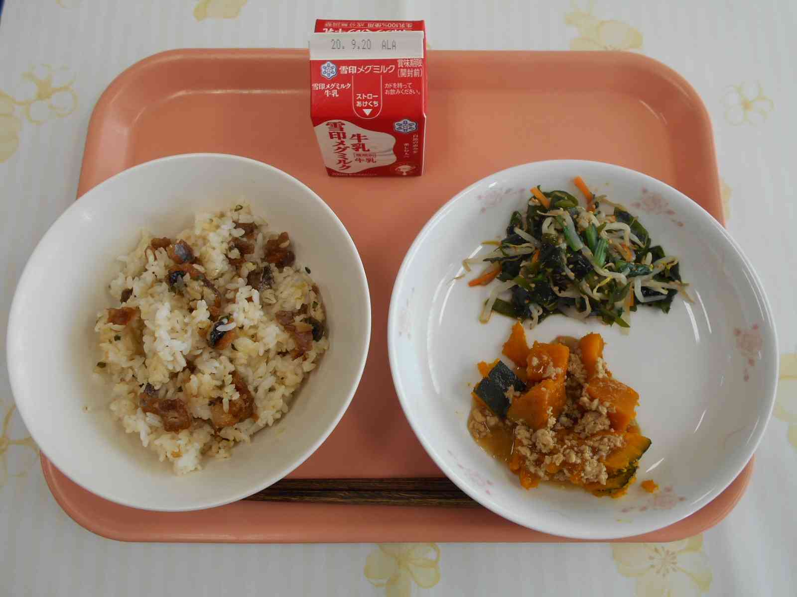〇牛乳 〇秋刀魚(さんま)のひつまぶし風ごはん 〇もやしとわかめのごま醤油 〇かぼちゃのそぼろあんかけ ☆一口メモ☆ かぼちゃは夏野菜ですが、収穫したてのかぼちゃは甘くなく、食べ頃ではありません。ここで、クイズです。収穫したてのかぼちゃを甘くするにはどうしたらいいでしょうか。 (1)風通しのよいところに置いておく (2)電子レンジでチンする (3)木づちで力強くたたく ・・・答えは(1)風通しのよいところに置いておくです。収穫したてのかぼちゃは、まだ熟す前のもので、風通しのよいすずしいところに2週間から2ヶ月保管して、追熟が必要です。追熟をするとかぼちゃの中のデンプンが、糖に変化して甘くておいしいかぼちゃになります。【添付ファイル】