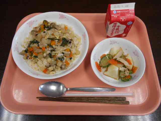 〇牛乳 〇きのこあんかけ炒飯 〇じゃが芋中華サラダ ☆一口メモ☆ スーパーでは1年中売られているきのこですが、本来の旬は秋です。きのこには、骨を強くするのを手助けしてくれるビタミンDが豊富です。骨にはカルシウムがつまっていますが、ビタミンDがそのカルシウムの吸収を良くするはたらきをします。