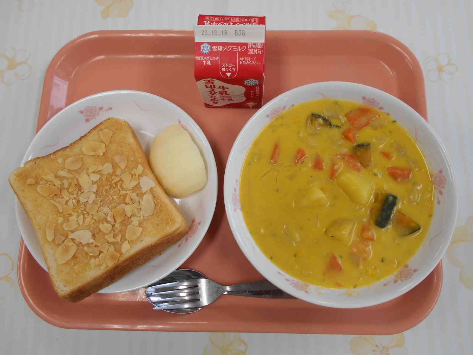 〇牛乳 〇アーモンドトースト 〇かぼちゃの豆乳シチュー 〇りんご ☆一口メモ☆ 給食室で、りんごの皮をむくときは皮むき器という道具を使っています。りんご1個を皮むき器に固定して、手でハンドルを回すと、りんごがくるくると回転して皮をむくことができます。皮むき器は便利な道具ですが、皮むき器のむき残しや真ん中にある芯(しん)は、手に包丁を持って取り除いて仕上げています。果物は、火を通すなどの調理をするわけではありませんが、意外に手のかかるメニューです。今日は調理員さんが全部で63個のりんごを食べやすいように切ってくれました。【添付ファイル】