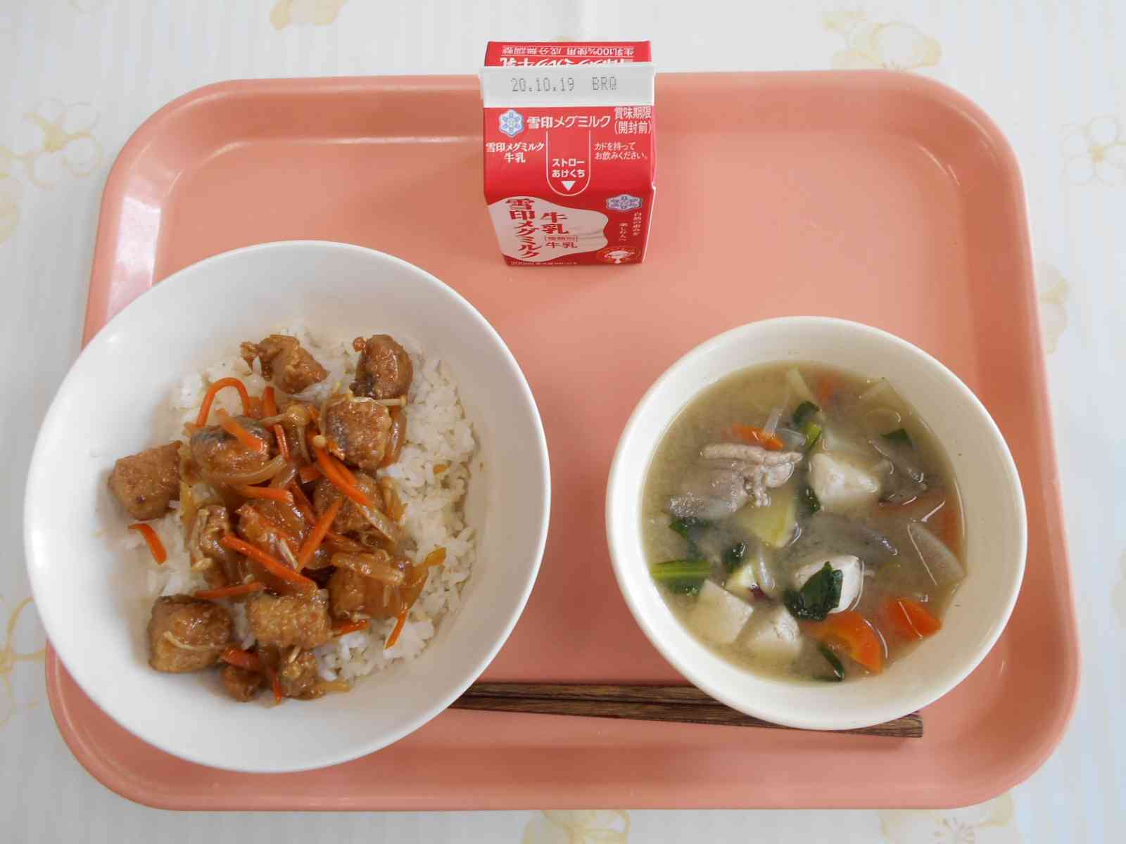 〇牛乳 〇鰹(カツオ)の甘酢丼 〇具だくさんさつま汁 ☆一口メモ☆ "今日の魚は、かつおです。ここで、クイズです。かつおは魚の分類ではどれになるでしょうか。 (1)赤身魚 (2)白身魚 (3)青魚 ・・・答えは(1)赤身魚です。赤身魚には、他にはまぐろ、ぶりなどがあります。かつおは泳いでいないと呼吸ができなくなってしまうため、寝ているときも泳いでいて、一生泳ぎ続けます。そのため、高い持久力を持っています。身が赤い色をしているのは、持久力のある筋肉が赤い色をしているからです。かつおなどの赤身魚は、生まれながらのアスリートともいえるでしょう。"【添付ファイル】