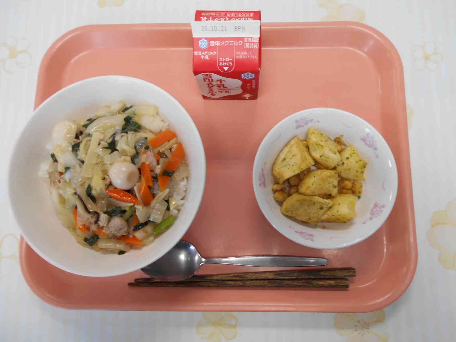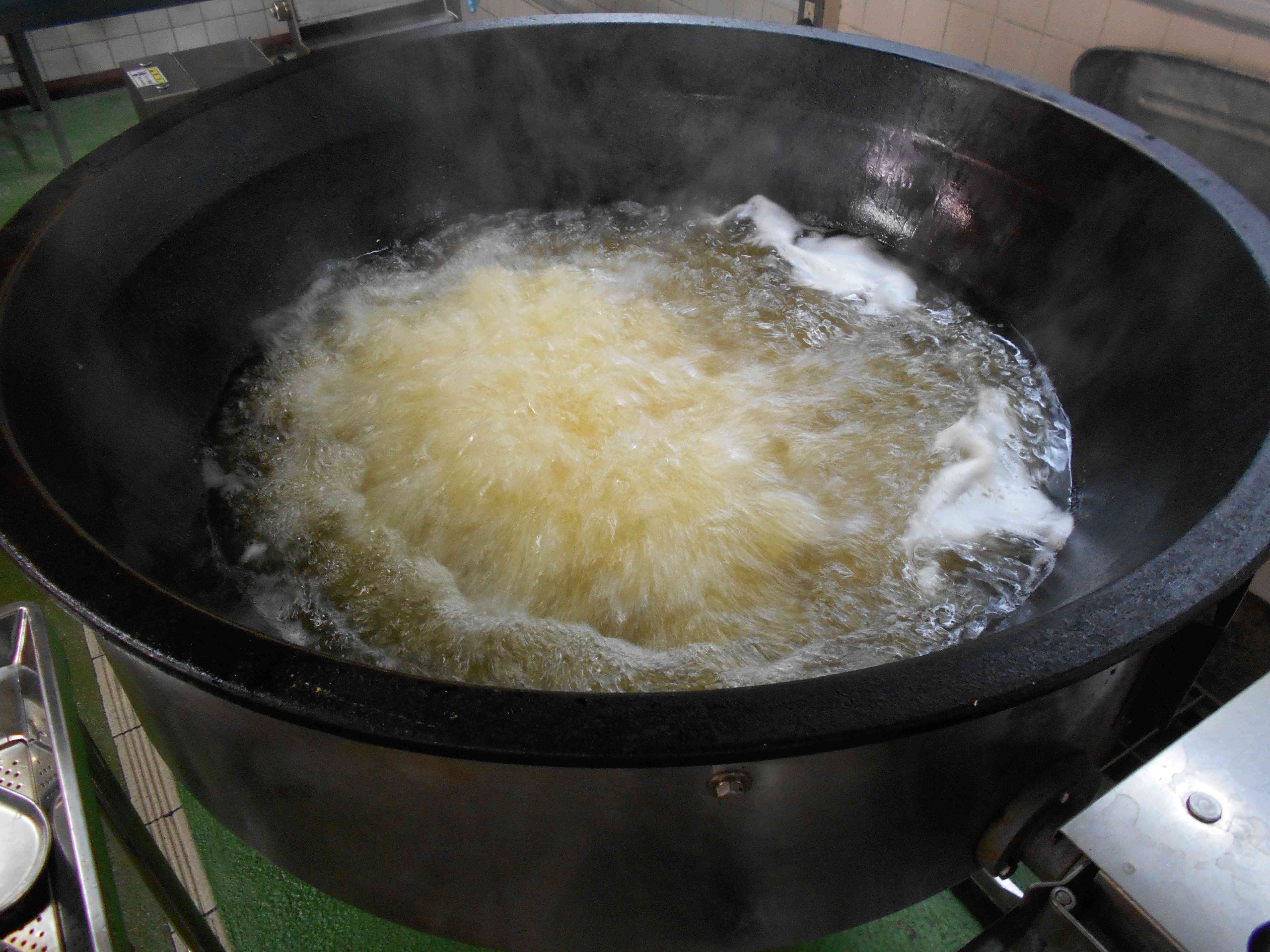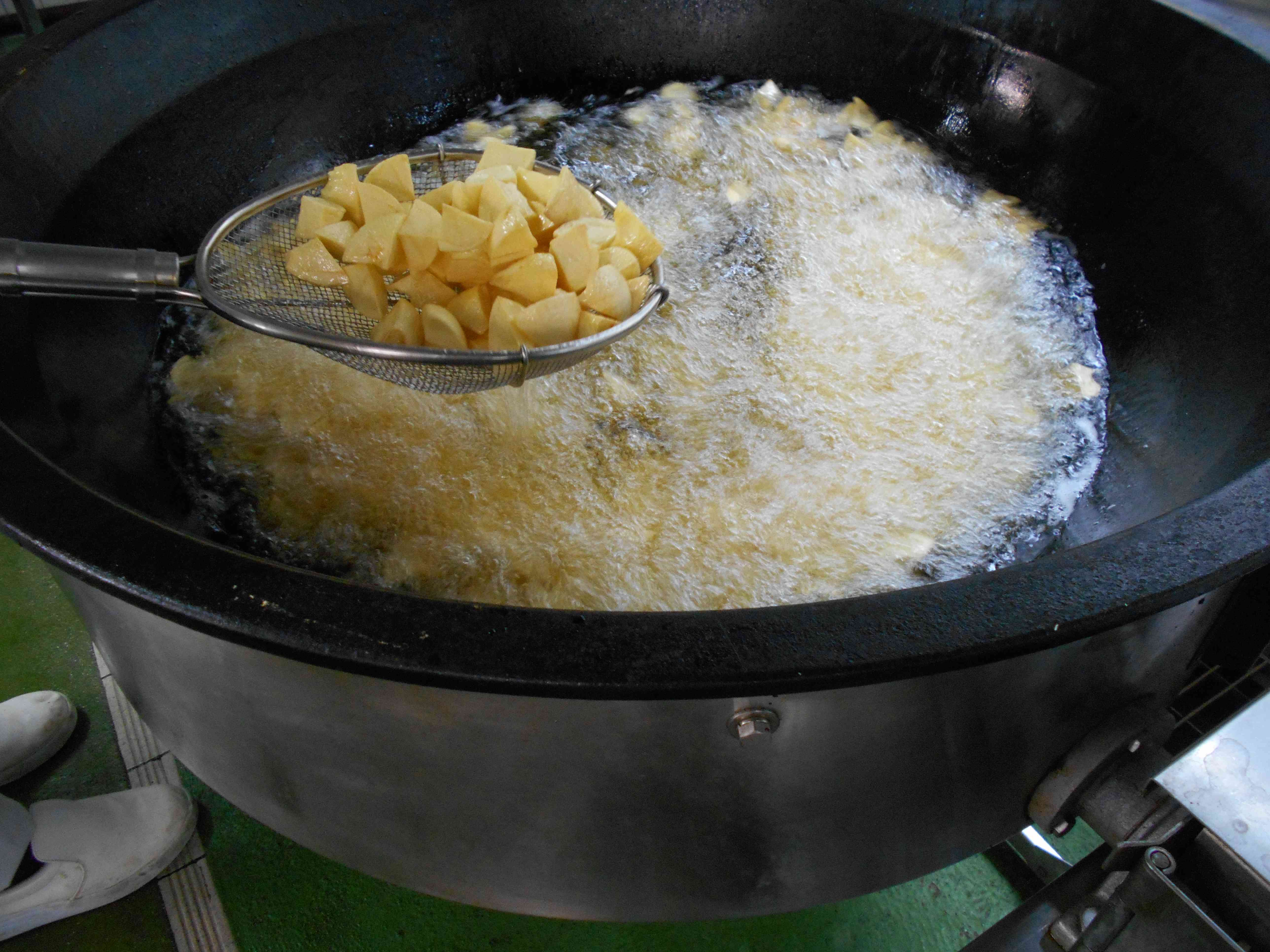〇牛乳 〇中華丼 〇のり塩ビーンズポテト ☆一口メモ☆ "中華丼の調味料のひとつにオイスターソースを使っています。オイスターソースは、中華料理の隠し味として、古くから日本でも親しまれており、その奥深い風味から、中華料理には欠かせない調味料となっています。今日の中華丼も、オイスターソースのおかげでコクやうまみが増しています。ここで、クイズです。オイスターソースは、何を原料にして作られているでしょうか。 (1)果物のかき (2)海のかき (3)星のかけら ・・・答えは、(2)海のかきです。オイスターの意味は「かき」です。給食で使っているオイスターソースは、化学調味料を使わないこと、広島県産かきを使用することにこだわったものを使っています。 写真2枚目 じゃがいもを油で揚げているところです。 じゃがいもを入れてすぐの写真です。じゃがいもから大きな泡がたくさん出てくるので、揚げ油の中央は、まるで火山の噴火口のようになります。 写真3枚目 じゃがいもがちょうどよく揚がったところです。このころになると、じゃがいもから出てくる気泡も小さくなって、その様子からも揚がってきたことが分かります。表面がカリッとして、色がついてきたらできあがりです。食べごたえがあるように、じゃがいもを大きな乱切りに切っているので、10分以上の時間をかけてじっくり揚げました。【添付ファイル】