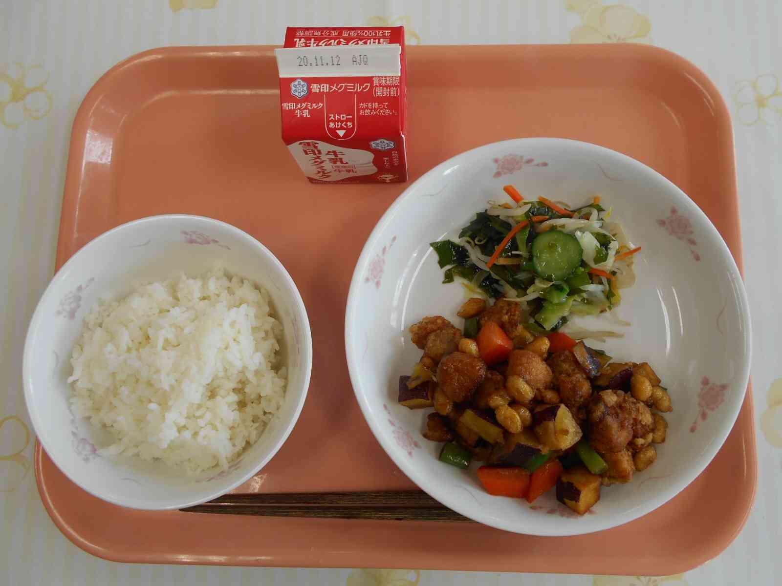 〇牛乳 〇ご飯 〇魚と野菜の五色和え 〇わかめ入りサラダ ☆一口メモ☆ 魚は白身魚のシイラを使っています。日本ではなじみの薄い魚ですが、外国での人気は高く、ハワイではマヒマヒと呼ばれる高級魚です。シイラは、成長が早く、秋に30~40cmだったものが、半年後には2倍の70cmほどになり、1年もすれば1m以上にもなります。鮮度が落ちやすいため、流通が難しい魚でしたが、急速に魚を冷やす技術が発達し、おいしい状態で食べられるようになりました。【添付ファイル】