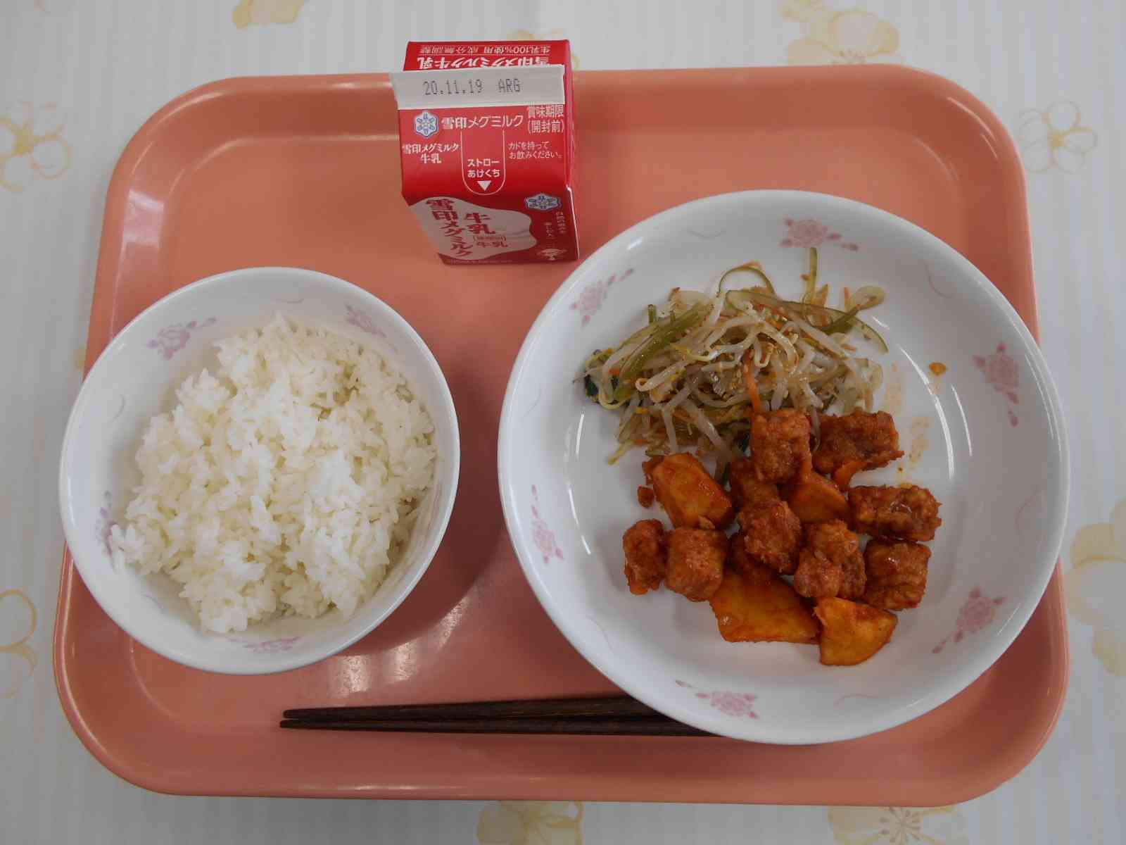 〇牛乳 ○ご飯 ○魚とじゃが芋のチリソース ○茎わかめのナムル ☆一口メモ☆ 日本には、ワニを刺身で食べる地域があります。ワニの刺身と聞いたら、驚く人も多いかもしれません。ただし、ワニと言っても皆さんがイメージする、は虫類のワニとは違います。ワニの刺身のワニは、魚のサメのことです。広島県の一部の地域では、サメをワニと呼んでいます。今日の魚は、サメです。サメを初めて食べる人もいるでしょうか。サメは、身が柔らかくて脂っこくなく、鶏肉にも似ている食感です。サメは鮮度が落ちると、とても強いにおいを放つようになりますが、低い温度で輸送や保管をして、新鮮なサメを魚屋さんが持ってきてくれているので、クセがないものをいただくことができます。【添付ファイル】