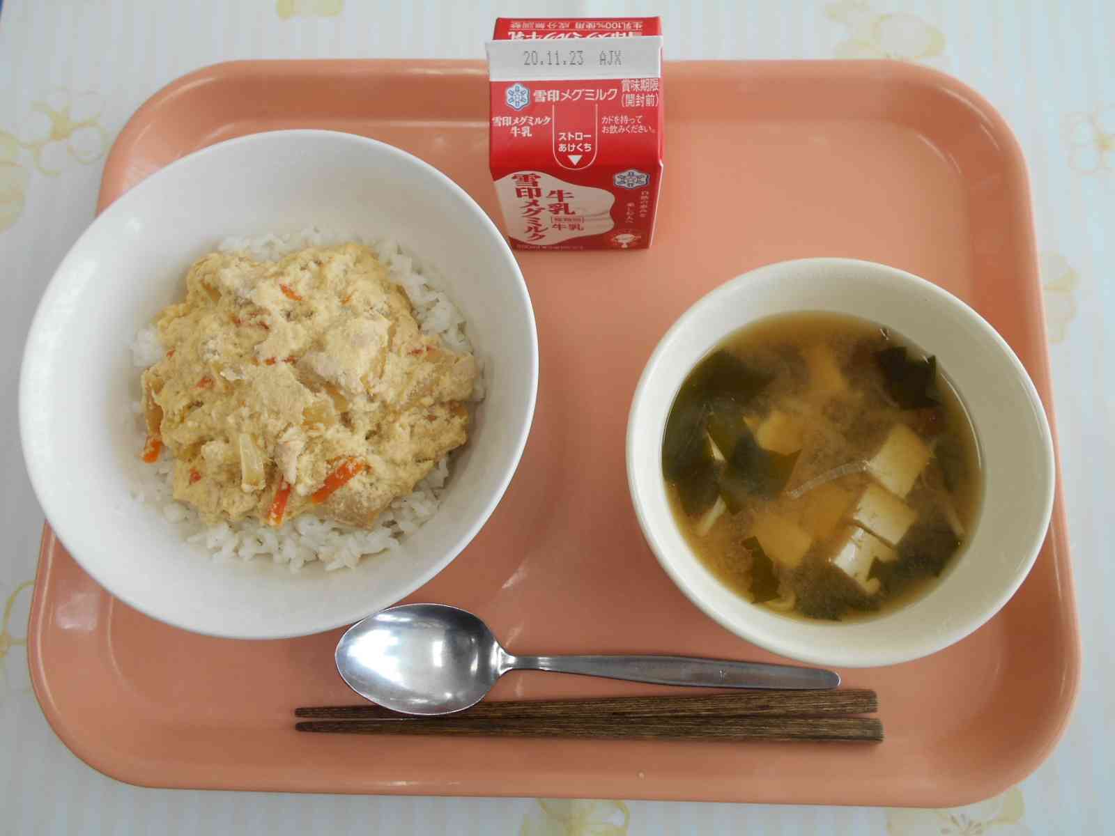 〇牛乳 ○親子丼 ○きのことわかめの味噌汁 ☆一口メモ☆ 今日と明日で、おみそ汁の食べ比べをします。だし汁に使っている食材とみその種類、具材を変えています。今日は、サバの削り節を多く使ってだしをひき、みそは赤みそを使っています。今日のみそ汁をよく覚えておいて、明日のみそ汁と比べてもらいたいと思います。給食を作る都合上、同じ日に比べてもらえないのは残念ですが、におい、味、見た目などにどんな違いがあるかを感じ取ってみましょう。【添付ファイル】
