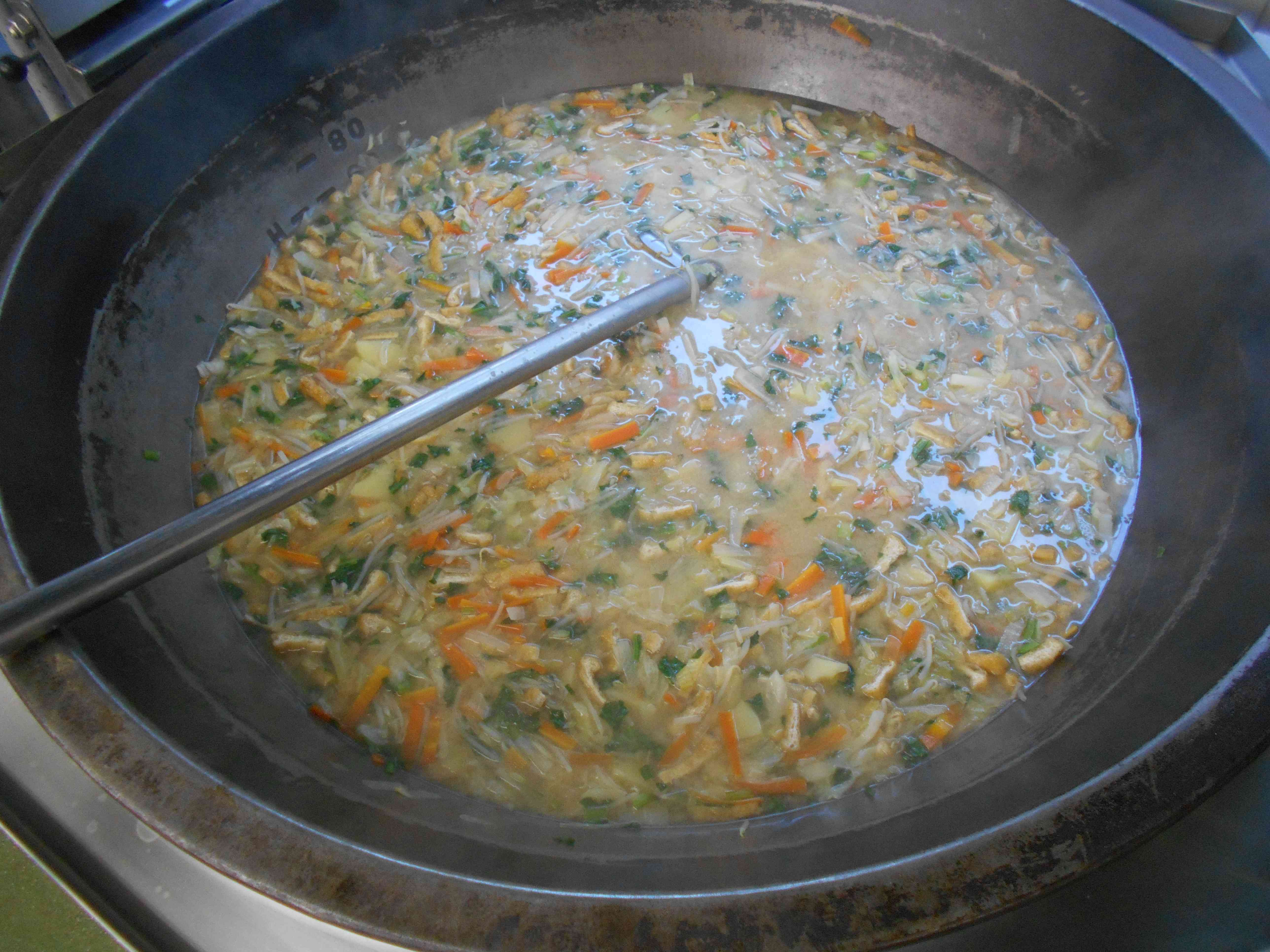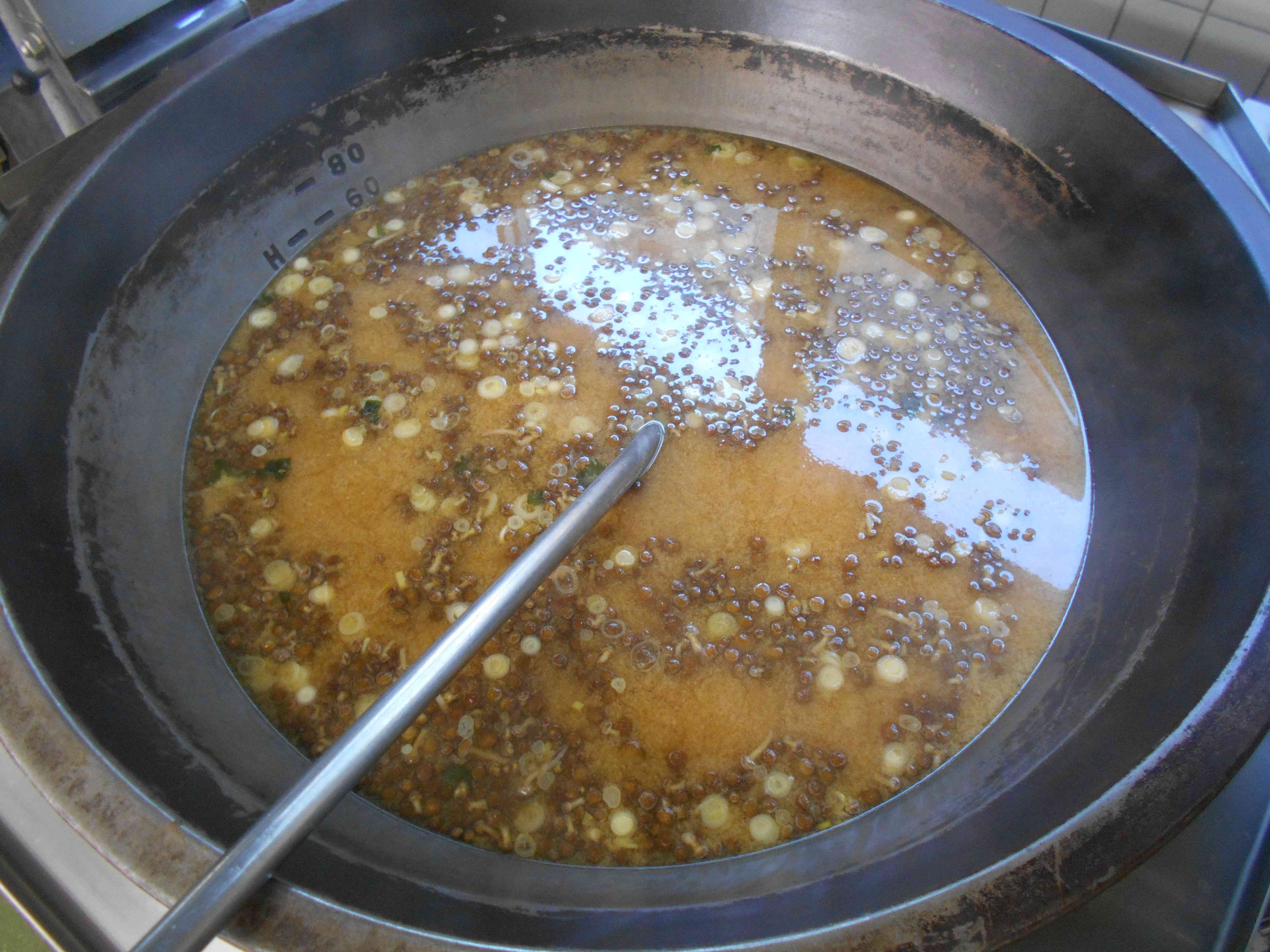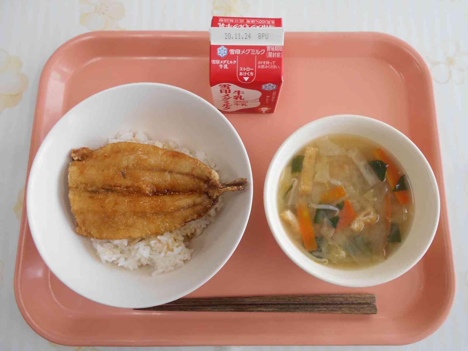 〇牛乳 ○鰯(いわし)のかば焼き丼 ○野菜たっぷり味噌汁 ☆一口メモ☆ みそ汁の食べ比べ2日目です。今日のみそ汁は、かつおの削り節を多く使ってだしをひき、甘口の白みそを使っています。昨日は、サバの削り節に、辛口の赤みそでした。昨日のみそ汁を思い出してみてください。どんな違いを感じますか。みそ汁の好みは人それぞれなので、昨日のみそ汁の方が好きな人、今日の方が好きな人、さまざまいると思います。 給食では使っていませんが、煮干しでひいただしもみそ汁によく合います。大豆、米、麦の原料の違いや作り方でみその味は変わります。地域によってもよく使われるみそが違ってきます。ふだん自分が食べているみそ汁は、どんな種類のだし、みそを使っているのか確認してみませんか。 写真2枚目 昨日のきのことわかめの味噌汁です。 赤味噌を使ったので、濃い茶色の汁になりました。 写真3枚目 今日の野菜たっぷり味噌汁です。 白味噌を使っているので、薄い茶色の色をしています。 見た目からも違いが伝わるでしょうか? 味噌汁は、和食の献立における汁物の代表料理のひとつです。 それぞれのご家庭ごとに慣れ親しんだ味があり、同じ都内に住んでいても保護者の方の出身地によって味噌やだしの種類は異なるものです。 今回は、食べ慣れている味噌汁に向き合って、どんな食材を使っているか関心を持ってほしいと思い、2日連続で異なる味噌汁の提供をしました。【添付ファイル】