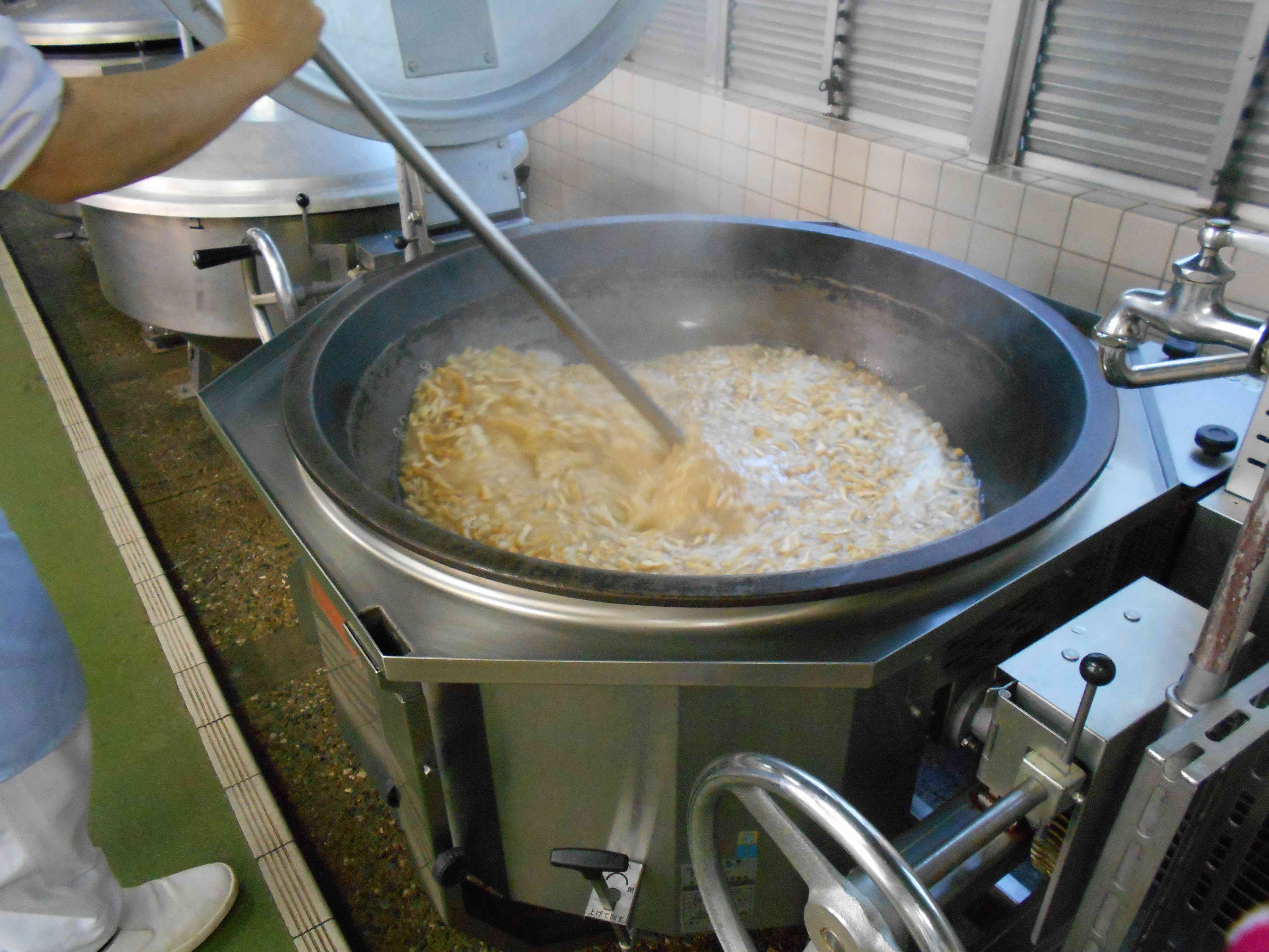 〇牛乳 〇五穀(ごこく)ご飯 〇擬製(ぎせい)豆腐 〇からし醤油のお浸し 〇じゃが芋の味噌汁 ☆一口メモ☆ 五穀ご飯には、麦、もちきび、もちあわ、玄米、大豆の5種類の雑穀が入っていて、食感が楽しいご飯です。雑穀は、お米と比べてやせた土地でも育ちやすいので、お米が不作のときには重要な作物として育てられてきました。現代では、雑穀は健康食材のイメージが強くなりました。実際に、白いお米だけで炊いたご飯よりも、雑穀を入れて炊くとビタミンやミネラルなどの栄養がアップします。 写真2枚目 焼き上がった擬製豆腐を切り分けているところです。 写真3枚目 味噌汁を仕上げているところです。 約8ヶ月ぶりの3食器使用の通常の献立です。 給食時間に遅れることがないよう、調理の工程を入念に確認しながら作業を進めました。【添付ファイル】
