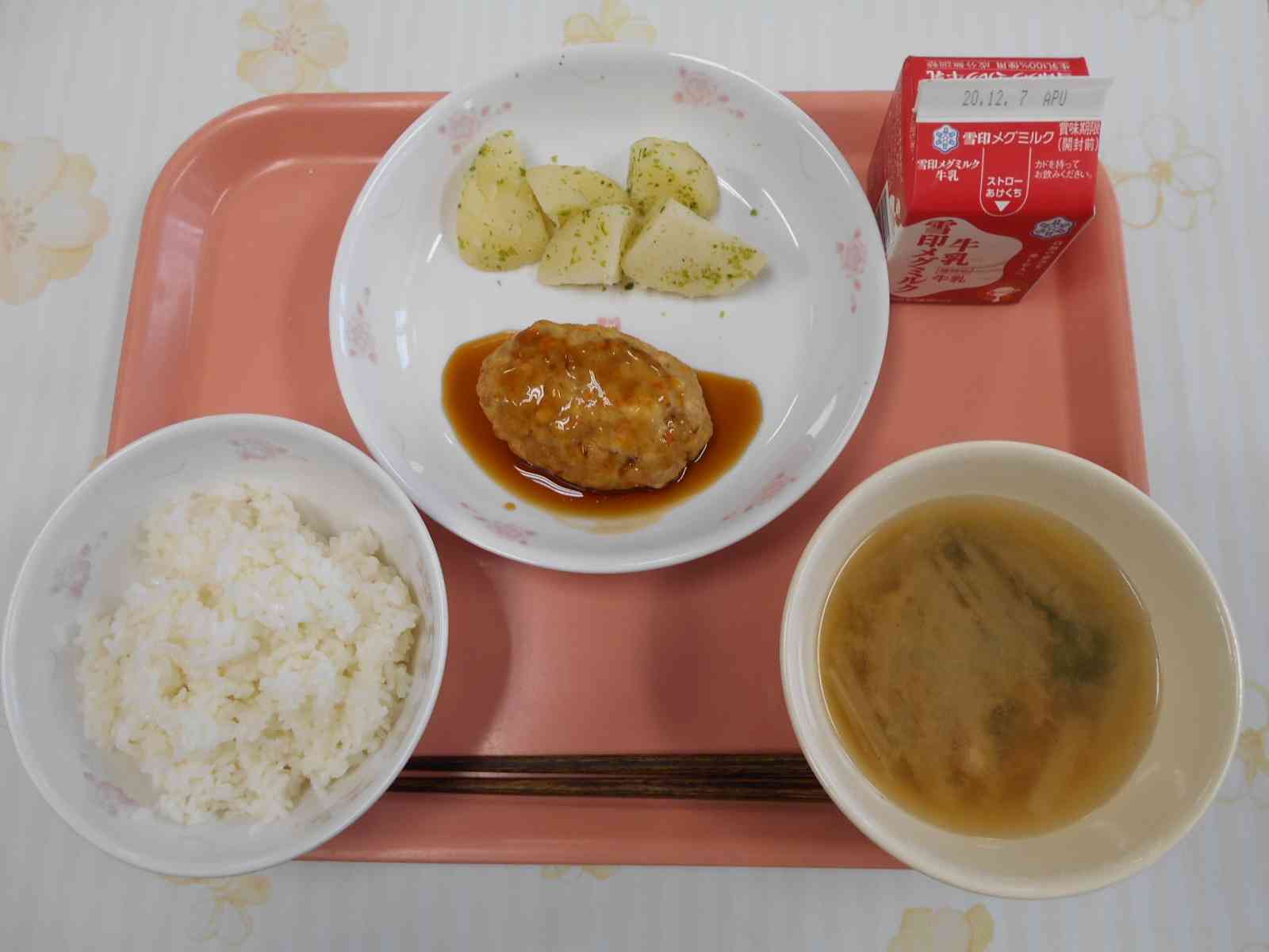 〇牛乳 ○ご飯 ○とびうおのつくね焼き ○じゃが芋の香味和え ○大根の味噌汁 ☆一口メモ☆ 本日、11月24日はいい日本食の語呂合わせで、和食の日です。和食は、日本の自然や歴史から生まれ、私たちが昔から受け継いできた食文化です。給食では、「だし」を使ったみそ汁を作ります。「だし」とは、こんぶやかつお節などの食材を煮だした液体のことです。食材のうま味を引き出した「だし」は、和食の味の基本になります。 写真2枚目 とびうおのつくね焼きには、とびうおのミンチだけではなく、豚ひき肉と豆腐も入っています。魚が得意ではない人にも食べやすく仕上げました。とびうお、ひき肉、豆腐を混ぜる割合を調整できるのは、手作りの給食だからこそのメリットです。 写真3枚目 今日から新米に切り替わりました。新米には水分が多く含まれているので、お米の水の量を少し減らして炊きました。今年の秋に収穫されたお米で、年内に精米、袋詰めされたものには新米のシールが袋についています。しばらくの間、新米のみずみずしさを楽しんでいただきたいと思います。【添付ファイル】