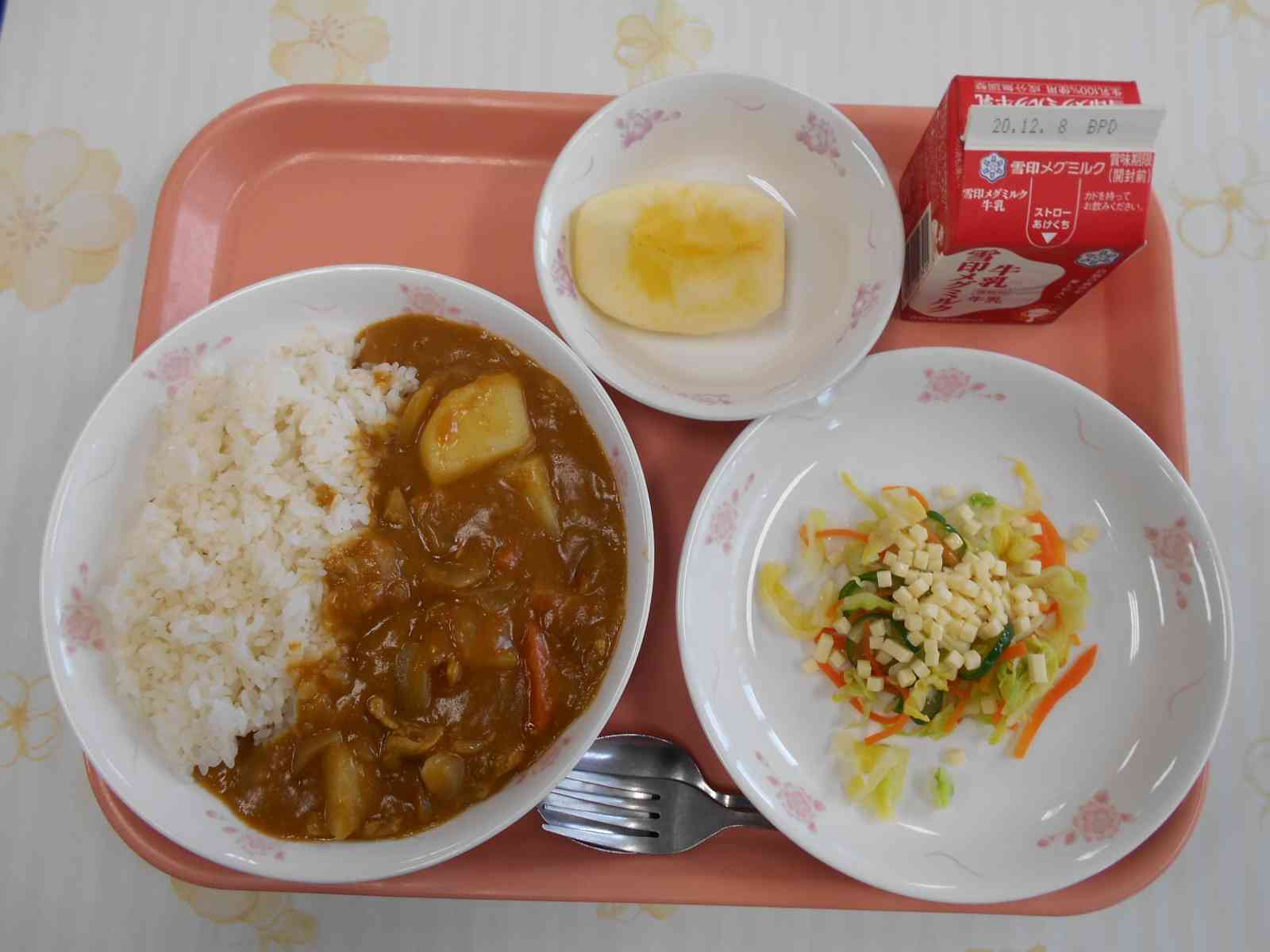 〇牛乳 ○チキンカレーライス ○チーズ入りサラダ ○りんご ☆一口メモ☆ 今日の果物は旬のりんごです。実はデザートのりんご以外に、もう一品りんごを使った料理があります。その料理はカレーです。今日のカレーには、かくし味にりんごのすりおろしが入っています。りんごのフルーティーな香りと甘酸っぱい味が、カレーを複雑でワンランク上の味にしてくれます。果物を食べるときは、そのまま食べたり、デザートにすることが多いですが、料理に取り入れると食卓を豊かにしてくれます。例えば、やきにくのタレにりんごのすりおろしを入れる、酢豚にパイナップルを入れる、ドライカレーにレーズンを入れるなど活用方法があります。【添付ファイル】
