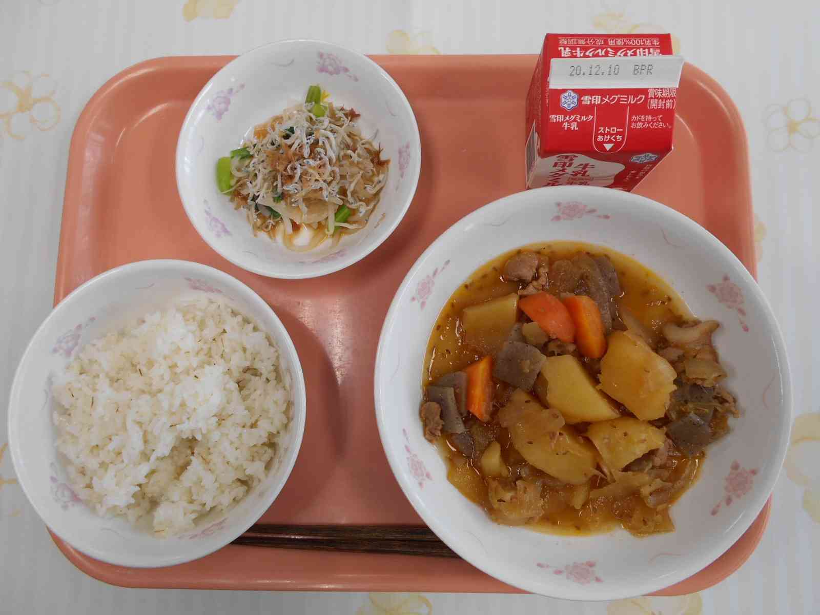 〇牛乳 ○押し麦入りご飯 ○韓国風肉じゃが ○じゃこと大根のサラダ ☆一口メモ☆ 押麦(おしむぎ)の麦は,パンやめんになる小麦ではなく、大麦です。大麦は白米に不足しているビタミンB1や食物繊維をたくさん含んでいます。大麦のそのままの状態だと食べにくいので、押麦は、大麦を加熱してからローラーで押しつぶして、食べやすくしたものです。大麦は、 麦ごはん以外にも、麦みそや麦茶、ビールなどのお酒を作るときにも使います。【添付ファイル】
