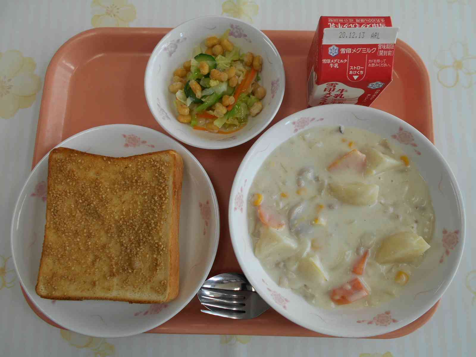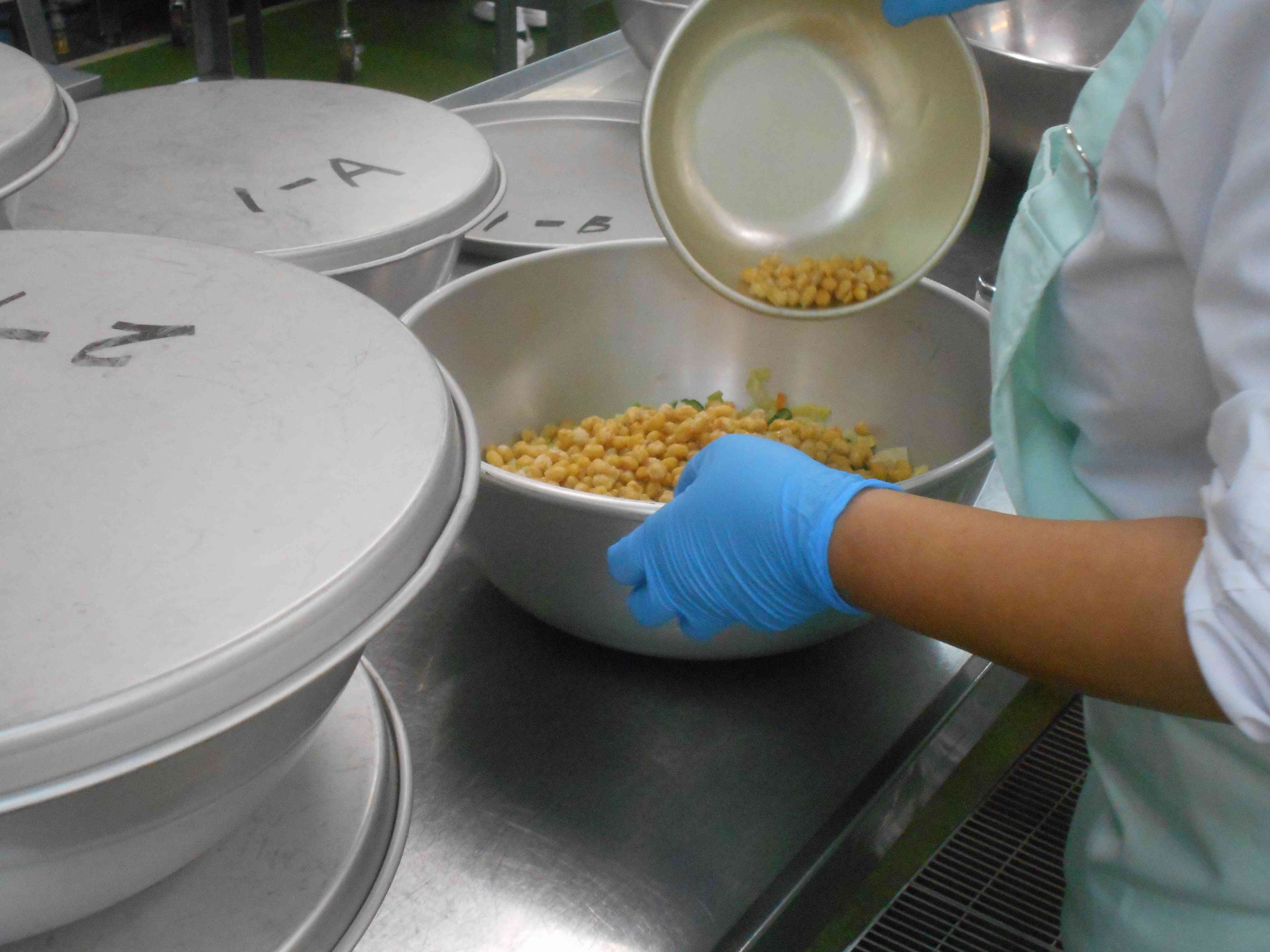 〇牛乳 ○ハニーセサミトースト ○米粉のクリームシチュー ○揚げ大豆入りサラダ ☆一口メモ☆ 給食の料理によく登場するごま。ごまは、香ばしい香りで料理をおいしくしてくれます。ごまは和食にもよく使われているため、日本で生まれた食べ物だと思っている人も多いのではないでしょうか。実は、ごまの原産地は、アフリカのサバンナ地帯だと考えられています。 日本に伝わってきたのは、縄文時代です。日本におけるゴマの自給率は0.1パーセントで、ほとんどすべてを輸入に頼っています。国産のゴマはとても貴重で高価なので、給食でも外国から輸入したものを使っています。 写真2枚目 給食で大豆を使うときは、乾燥大豆を購入し、当日の朝に水をひたしてゆでています。大豆をふっくらさせるには、水に長時間浸して大豆が十分に吸水してからゆでる方が望ましいです。しかしながら、給食では、当日調理がルールのため、前日の夜から大豆を水につけておくことができません。ゆで時間や火加減を調整して、当日でもおいしくいただけるように調理しています。 今日は、ゆでた後に片栗粉をまぶしてカリッと揚げました。 写真3枚目 各クラスのサラダの上に揚げた大豆を配缶していきます。カリッと揚げた大豆が水っぽくならないように、提供時間ギリギリのタイミングで作業をしました。【添付ファイル】