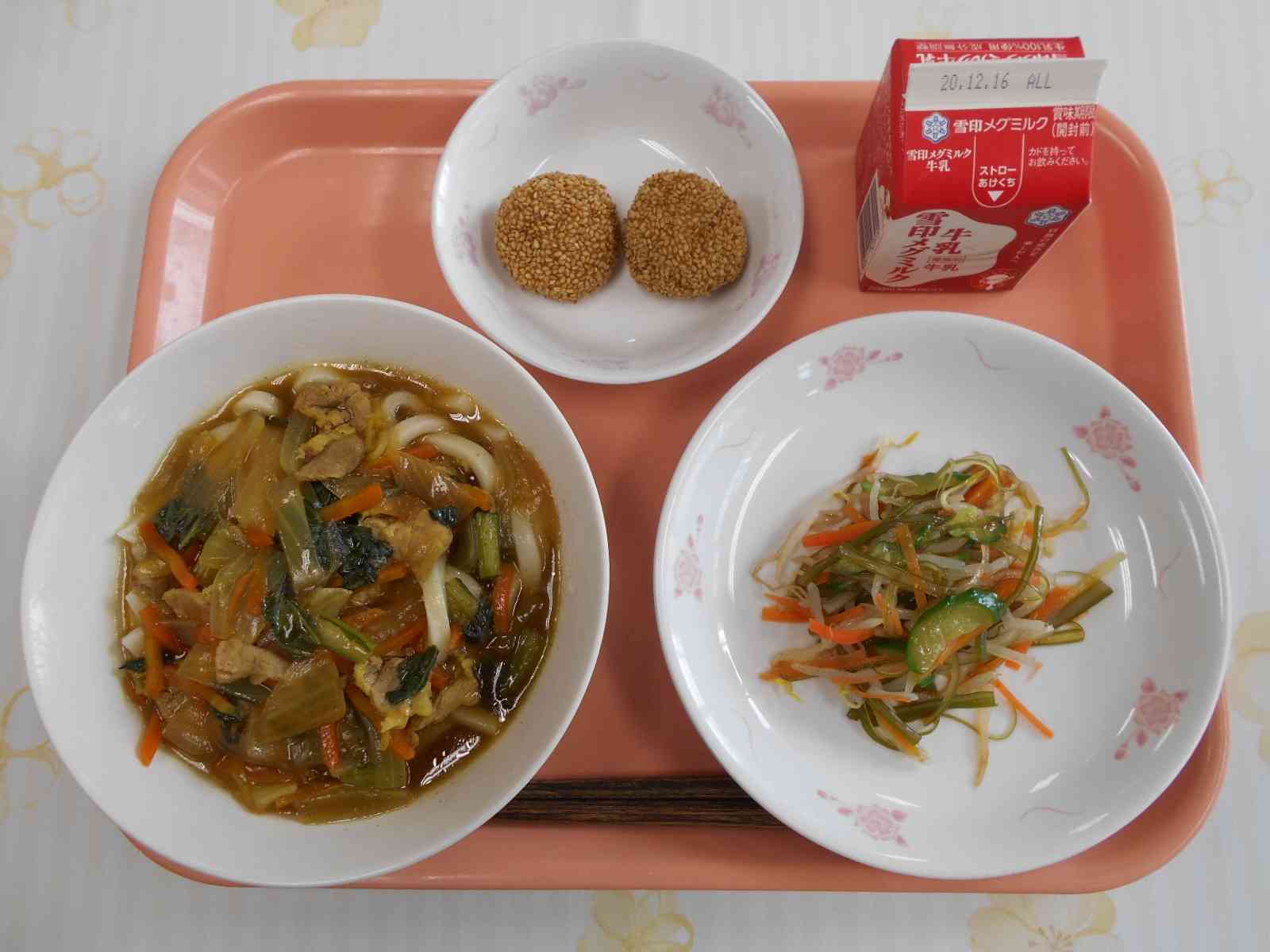 〇牛乳 ○カレーうどん ○くきわかめの和え物(あえもの) ○さつま芋のごま団子 ☆一口メモ☆ ごま団子には、つぶしたさつまいもだけではなく、白玉粉も練り込んでいます。白玉粉のおかげで、さつまいもの食感だけではなく、独特のもっちりとした食感が加わっています。白玉粉には別の呼び方があり、「寒ざらし粉」とも言います。寒ざらしとは、冬の厳しい寒さの中、水や空気にさらしておくことです。寒ざらしという言葉の季語は冬です。今では、1年中生産されている白玉粉ですが、もともとは、お米の粉を寒ざらしにして作られていました。【添付ファイル】