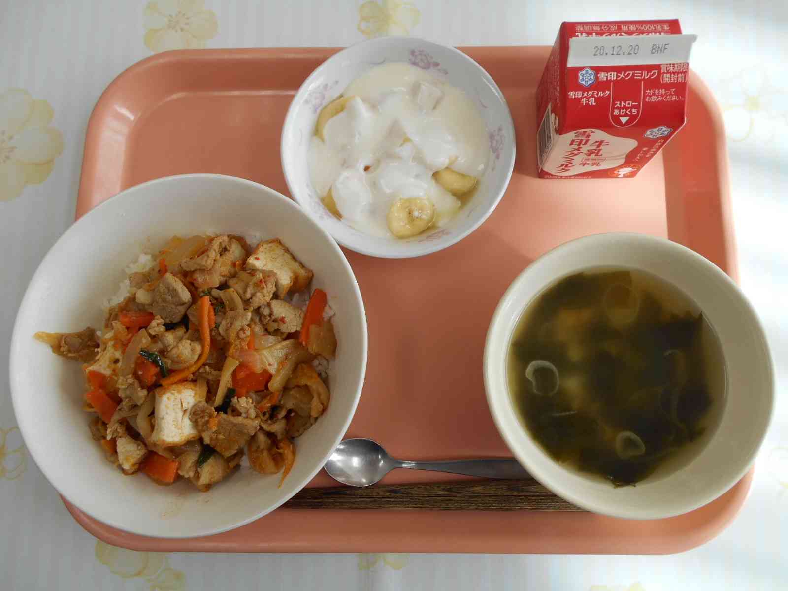 〇牛乳 ○豚キムチ丼(生揚げ入り) ○わかめとコーンのスープ ○フルーツのヨーグルト添え ☆一口メモ☆ わかめには、つるっとしたぬめりがあります。このぬめりは、「アルギン酸」という水に溶けやすい性質の食物繊維です。食物繊維は、体に入るとおなかの調子を整えてくれます。わかめがヌルヌルするのは、体によい成分が入っている証拠です。食物繊維が多い食材には、わかめなどの海そう、豆、野菜、きのこなどが挙げられます。これらの食材は、副菜や汁物に使われることが多いです。ご飯などの主食、肉や魚などの主菜ばかりを食べて、野菜のおかずが少ないと、食物繊維をなかなかとれません。意識して、食事に取り入れていきましょう。【添付ファイル】