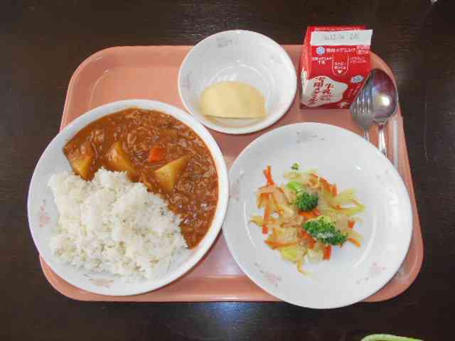 12月11日(金)の給食 〇牛乳 ○ポークハヤシライス ○ブロッコリー入りサラダ ○りんご ☆一口メモ☆ サラダにはブロッコリーの茎を細かく刻んで入れました。ブロッコリーのもこもことした食べる部分は、花になるところです。もしも、花の部分しか食べない場合は、ブロッコリーの50パーセント位を包丁で切り落とすことになって、半分が捨てられてしまいます。茎を食べることで、捨てる量を減らすことができます。茎のまわりの皮はかたいので、皮だけをむいて、中のやわらかいところをゆでると食べられます。食材のムダを少なくするエコクッキングです。【添付ファイル】