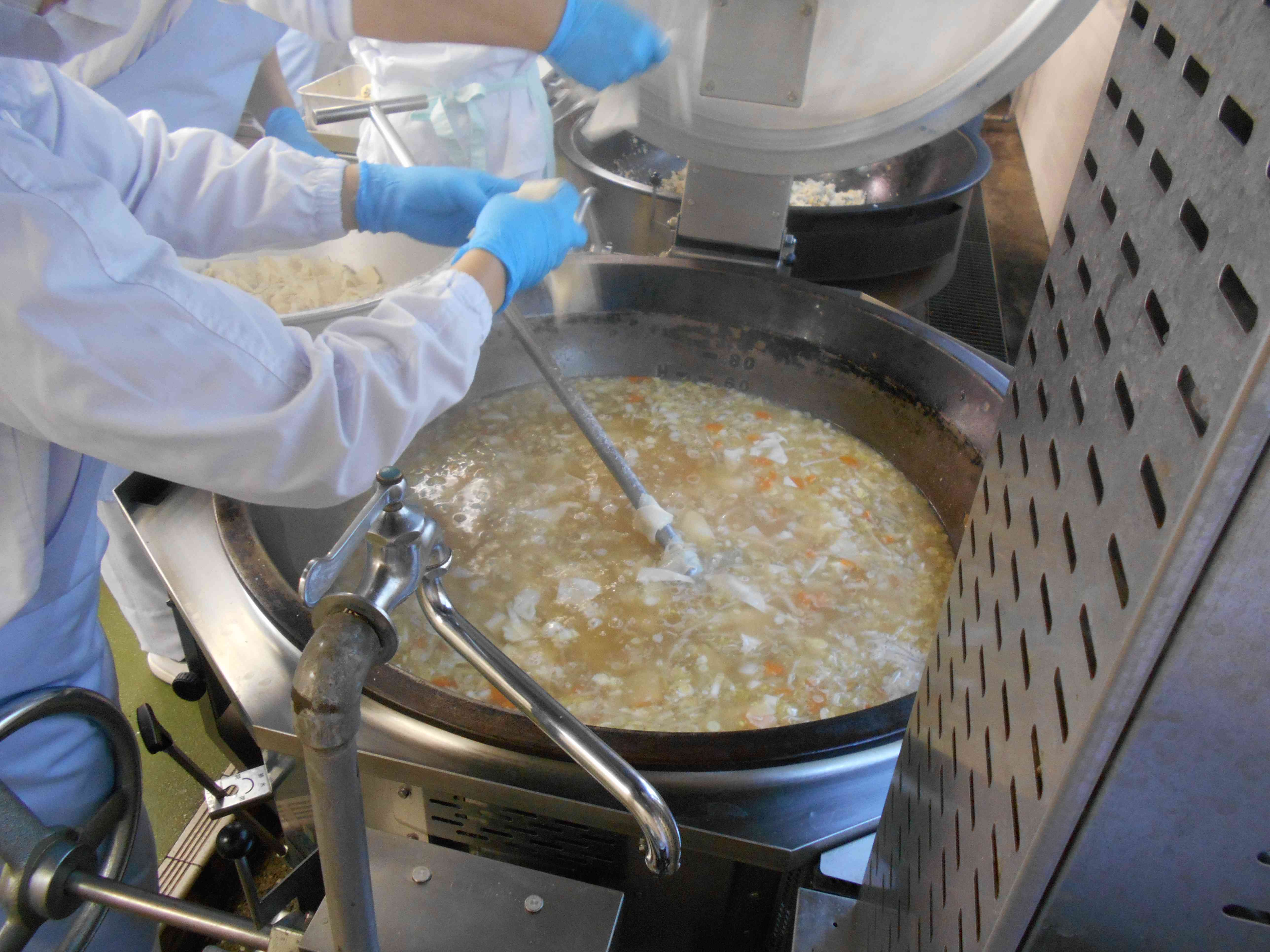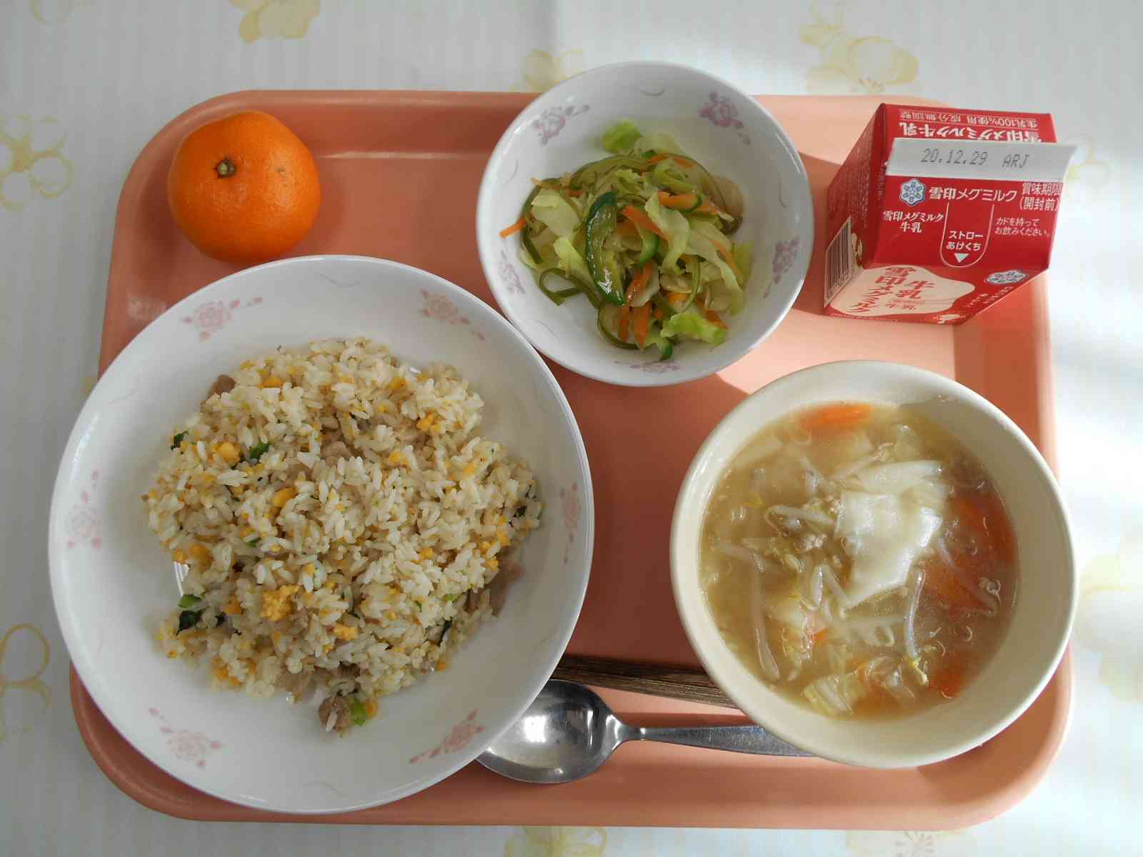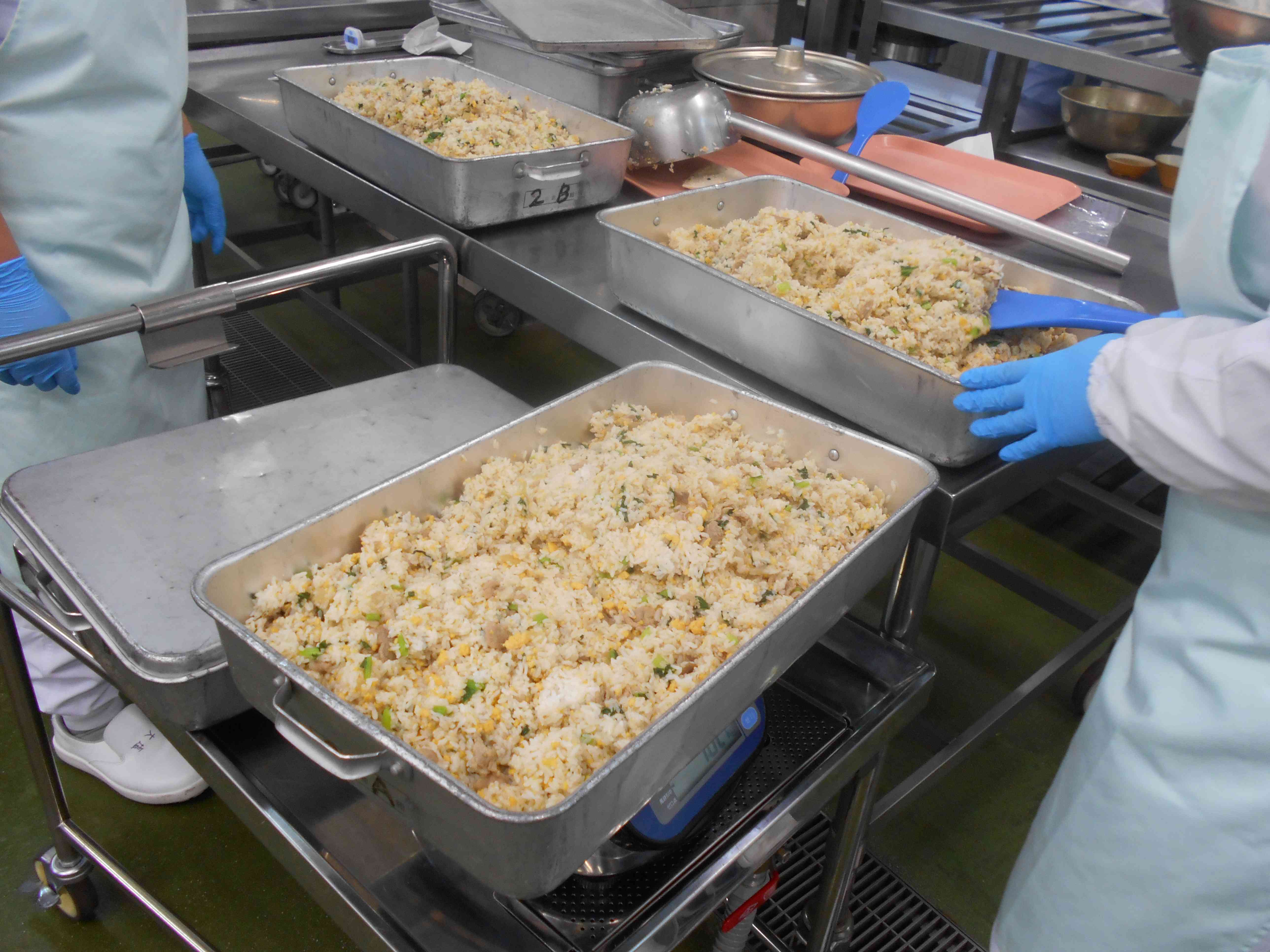 〇牛乳 ○ガーリック炒飯(チャーハン) ○海藻(かいそう)入りサラダ ○わんたんスープ ○みかん ☆一口メモ☆ チャーハンはにんにく入りです。少ないお塩でもおいしく仕上げるために、2つのことに気をつけました。一つ目は、にんにくのかおりを生かすことです。にんにくは香味野菜といわれて、香りや風味が強い野菜です。この香味野菜の香りが、料理の風味を豊かにしてくれます。2つめは、にんにくを炒めて香ばしさを引き出すことを意識しました。にんにくの風味と、炒めた香ばしい香りが、私たちの舌と鼻を刺激するので、少ないお塩でも料理の満足感を高めてくれます。 写真2枚目 チャーハンを大きな回転釜で炒めた後は、クラスごとのバットに入れていきます。重さを量って、クラスごとの人数に合わせた重さに振り分けます。 写真3枚目 わんたんスープのわんたんは、麺屋さんが作ってくれたものです。1枚を4等分に三角形の形に切ってから、スープに入れています。わんたんは、くっつきやすいので、スープの中で大きなかたまりになってしまいやすいものです。そのため、よくほぐしながら少しずつスープの中に入れました。【添付ファイル】
