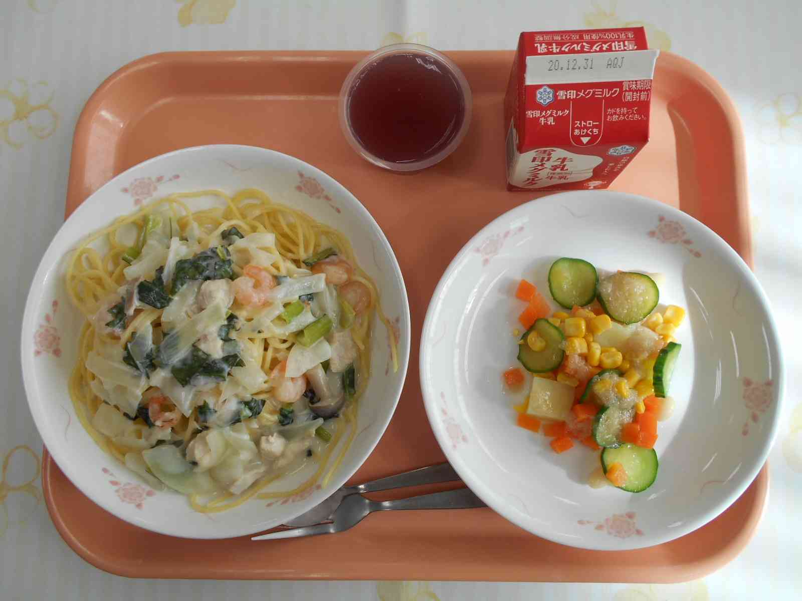 〇牛乳 ○ミルクスープスパゲッティ ○ポテトと豆のサラダ ○ぶどうゼリー ☆一口メモ☆ スパゲッティのミルクスープには小松菜が入っています。牛乳も小松菜も骨を強くするカルシウムが多い食材です。骨を強くするために、カルシウムの多い食材をとりましょう、とは言いますが、牛乳だけを飲んで、小松菜だけを食べて1日に必要なカルシウムをとるのは、とても難しいことです。牛乳だけで1日に必要なカルシウムをとろうとすると、牛乳に入っている脂肪のとりすぎになりかねません。小松菜だけでとろうとすると、量が多くなってしまって食べきれないことになるでしょう。牛乳、小松菜、そして、その他のカルシウムの多い食材(野菜、海藻類、乳製品、大豆製品など)をまんべんなく、幅広い食材を食べることを心がけるのがおすすめです。【添付ファイル】