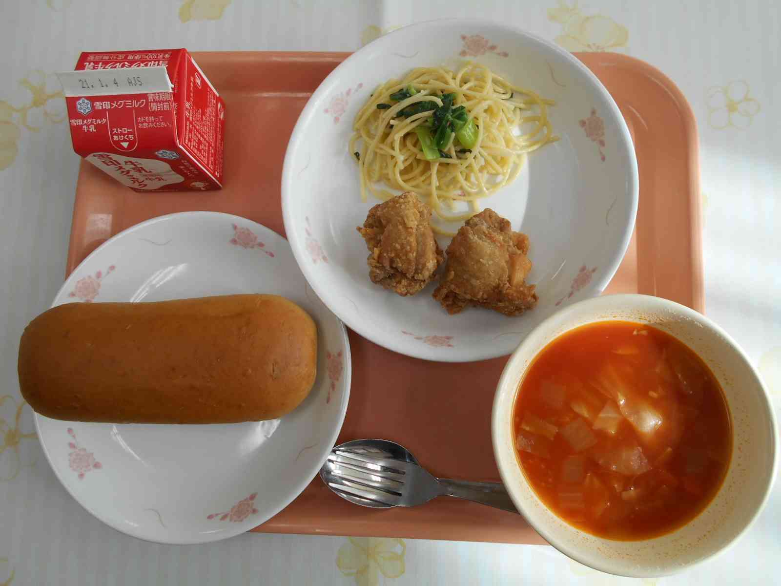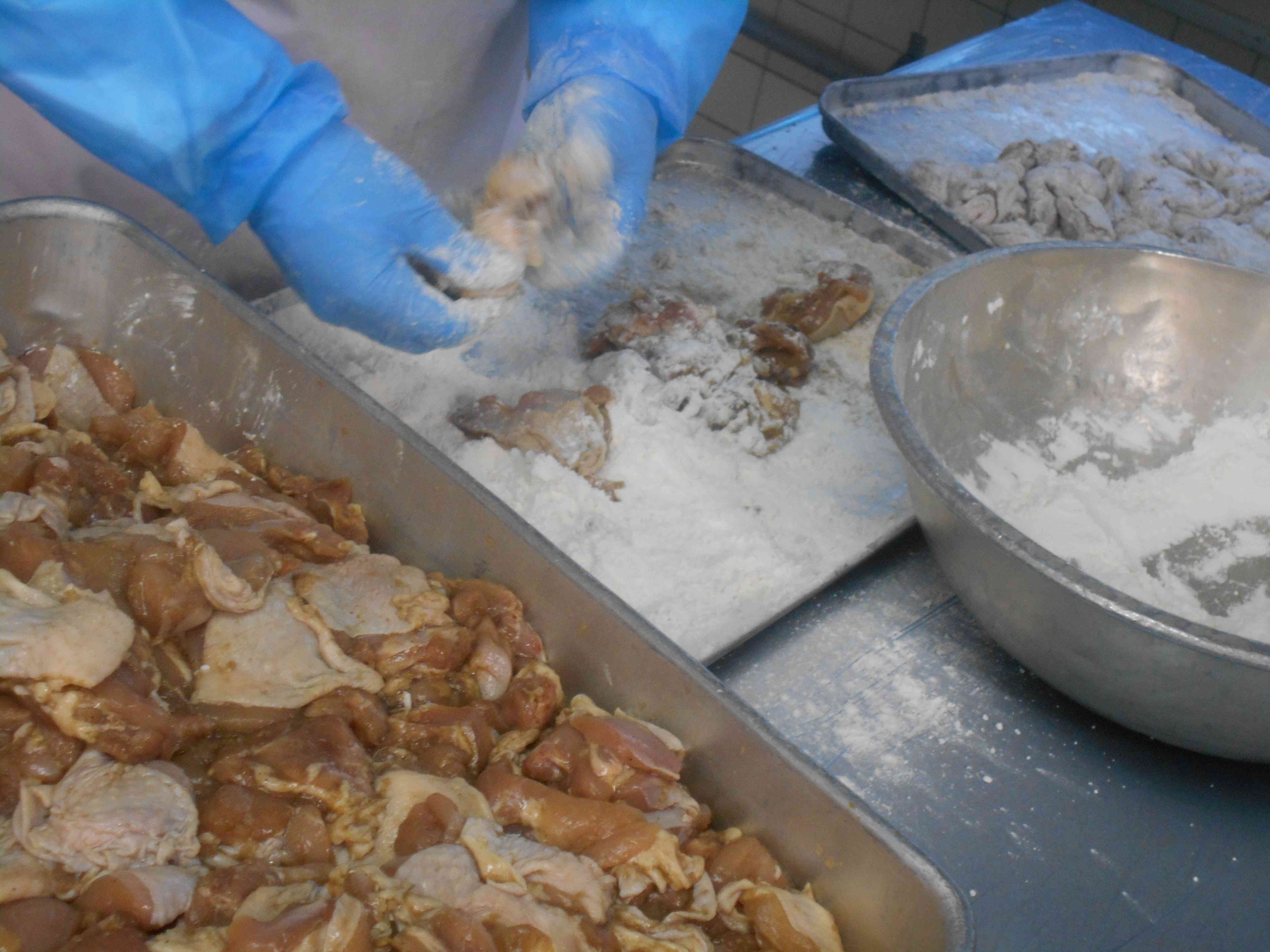 〇牛乳 ○黒砂糖コッペパン ○フライドチキン ○ペペロンチーノ ○ミネストローネスープ ☆一口メモ☆ 今日は、ひと足早いクリスマス献立です。クリスマスと言えば、どんな食べ物を思い浮かべますか。クリスマスケーキやローストチキンなどがあるでしょうか。それらのおいしい食べ物の裏には、実は悲しい事実もあります。クリスマスケーキがクリスマスの翌日に、どれくらい捨てられていると思いますか。とある食品リサイクル工場には、クリスマスの後に、2000キログラムの売れ残りのケーキが運び込まれたそうです。2000キログラムはおおよそホールケーキ2000個分にあたります。このような食べられるのに捨てられてしまう食品のことを「食品ロス」と言います。数年前から、クリスマスケーキの食品ロスを減らすために、ケーキを完全予約制にしたり、ミニサイズのケーキを作る企業も出てきました。食品ロスは、クリスマスに限った話ではなく、私たちの普段の生活の身近なところにあります。私たちは、どんなことができるでしょうか。 写真2枚目 下味をつけた鶏もも肉に、片栗粉と小麦粉を混ぜた粉をまぶしていきます。均一に粉がついてカリッと揚がるように、肉を手で広げながら、1枚ずつ粉づけします。 下味には、複数のスパイスも入れました。こしょう、オールスパイス、ガラムマサラ、ナツメグ、タイムを使って、スパイシーで香りよく仕上がりました。 写真3枚目 役割分担をして調理を進めているので、今日は一人の調理員さんが、ミネストローネとペペロンチーノを手際よく調理してくれました。写真中央の釜でミネストローネを煮込みつつ、右側の釜でペペロンチーノのスパゲッティをゆで、左側の釜ではオリーブオイルでニンニクを炒めています。【添付ファイル】
