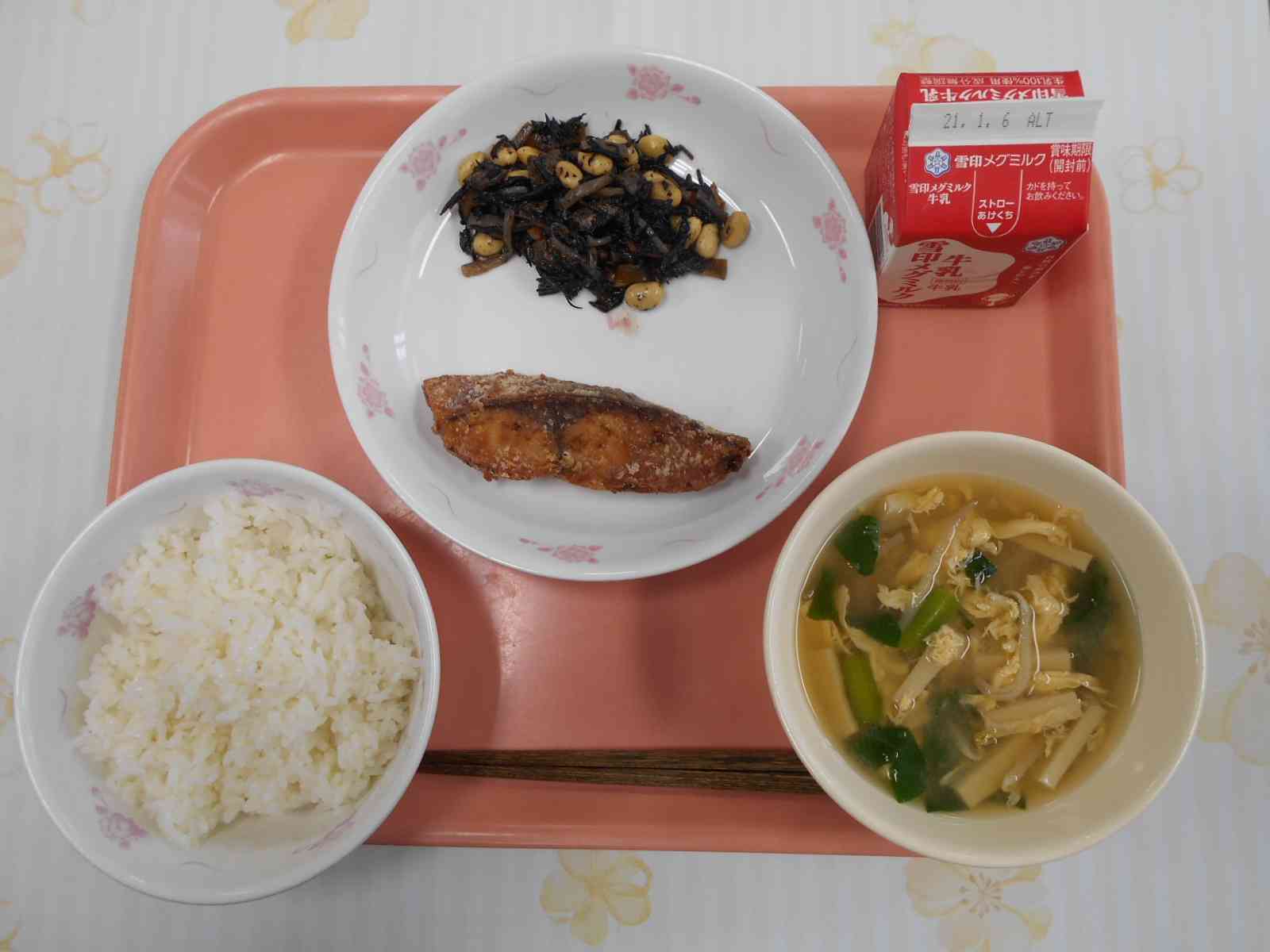 〇牛乳 ○ご飯 ○鰤の竜田揚げ(ぶりのたつたあげ) ○ひじきと大豆の炒め煮 ○卵と高野(こうや)豆腐の味噌汁 ☆一口メモ☆ 天然ブリの旬は冬です。この時期のブリは寒ブリ(かんブリ)と呼ばれ、脂がのっておいしいと言われています。脂がのっていることから、江戸時代には「アブラ」と呼ばれていたそうです。それが、時代とともに変化して、「アブラ」「ブラ」「ブリ」という名前になったという説があります。