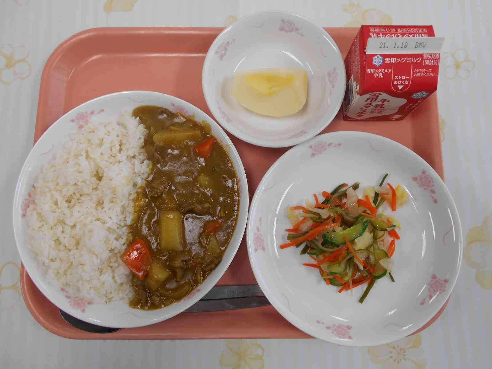 ○牛乳 ○カレーライス ○海藻(かいそう)入りサラダ ○りんご ☆一口メモ☆ 例年より早い年明けの給食。食材の納品業者さんもそれに合わせて納品してくれます。東陽中学校に食材を届けてくれる業者さんは、牛乳、八百屋、肉屋、魚屋など10社以上あり、今日は5つの業者さんが届けてくれた食材を使って給食を作りました。朝早くから、区内の複数の学校に食材を届け、東陽中には7時頃から8時にかけて持って来てくれます。学校の給食は、食材を事前に準備して、毎朝早い時間に届けてくれる業者さんの協力があって作ることができています。【添付ファイル】