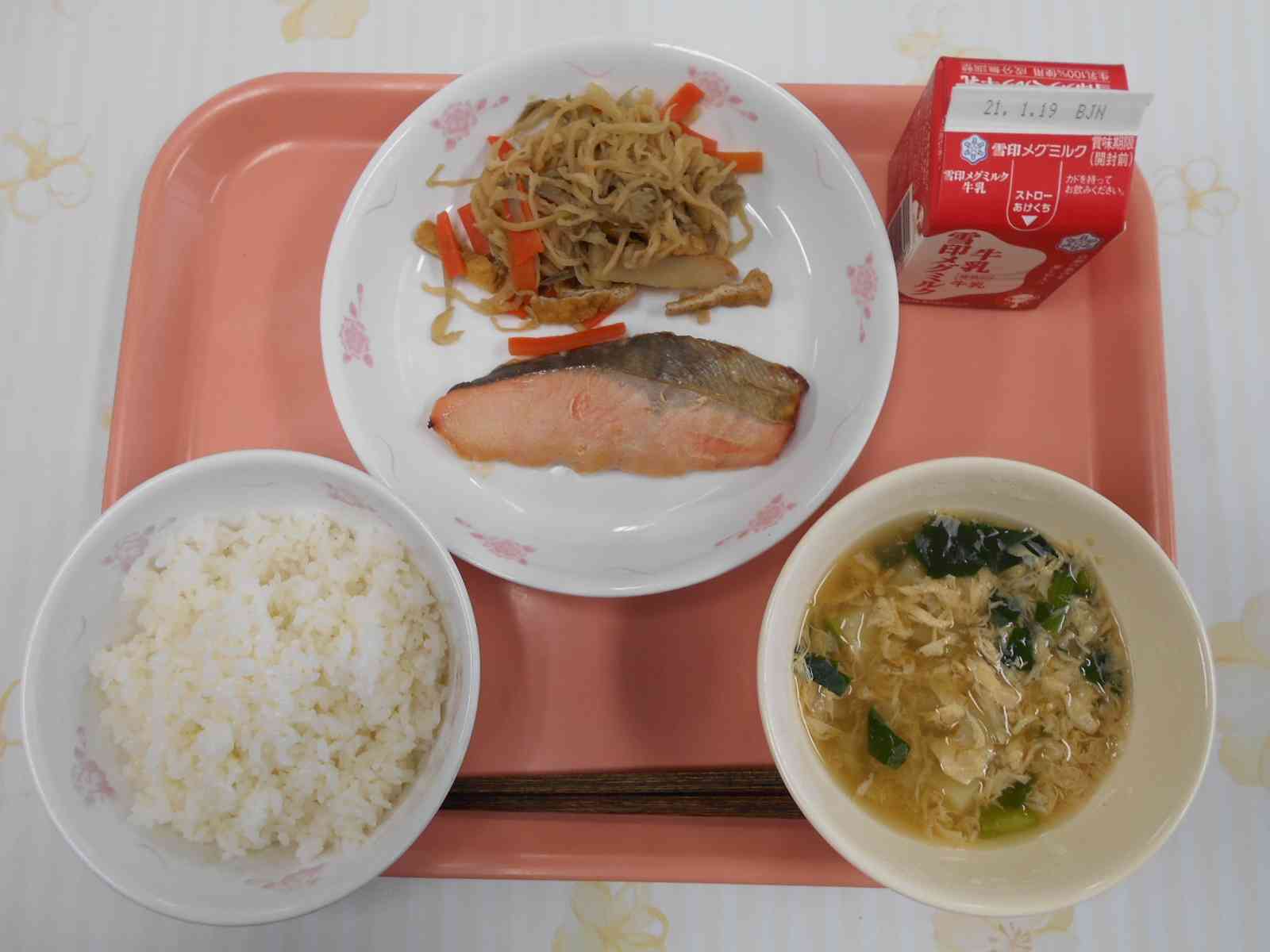 ○牛乳 ○ご飯 ○鮭の西京焼き(さけのさいきょうやき) ○切り干し大根の炒め煮 ○じゃが芋のかきたま汁 ☆一口メモ☆ 西京焼きは、サケやサワラ、サバなどの魚を白みそにつけこんでから焼いたものです。西京みそという甘口の白みそを使いました。日本では、平安時代から食材をみそづけにする保存方法がありました。魚は、生ものなので、海から遠い地域に運ぶまでにすぐに傷んでしまいます。そのため、日持ちさせる方法のひとつとして、魚のみそづけが始まったと言われています。【添付ファイル】