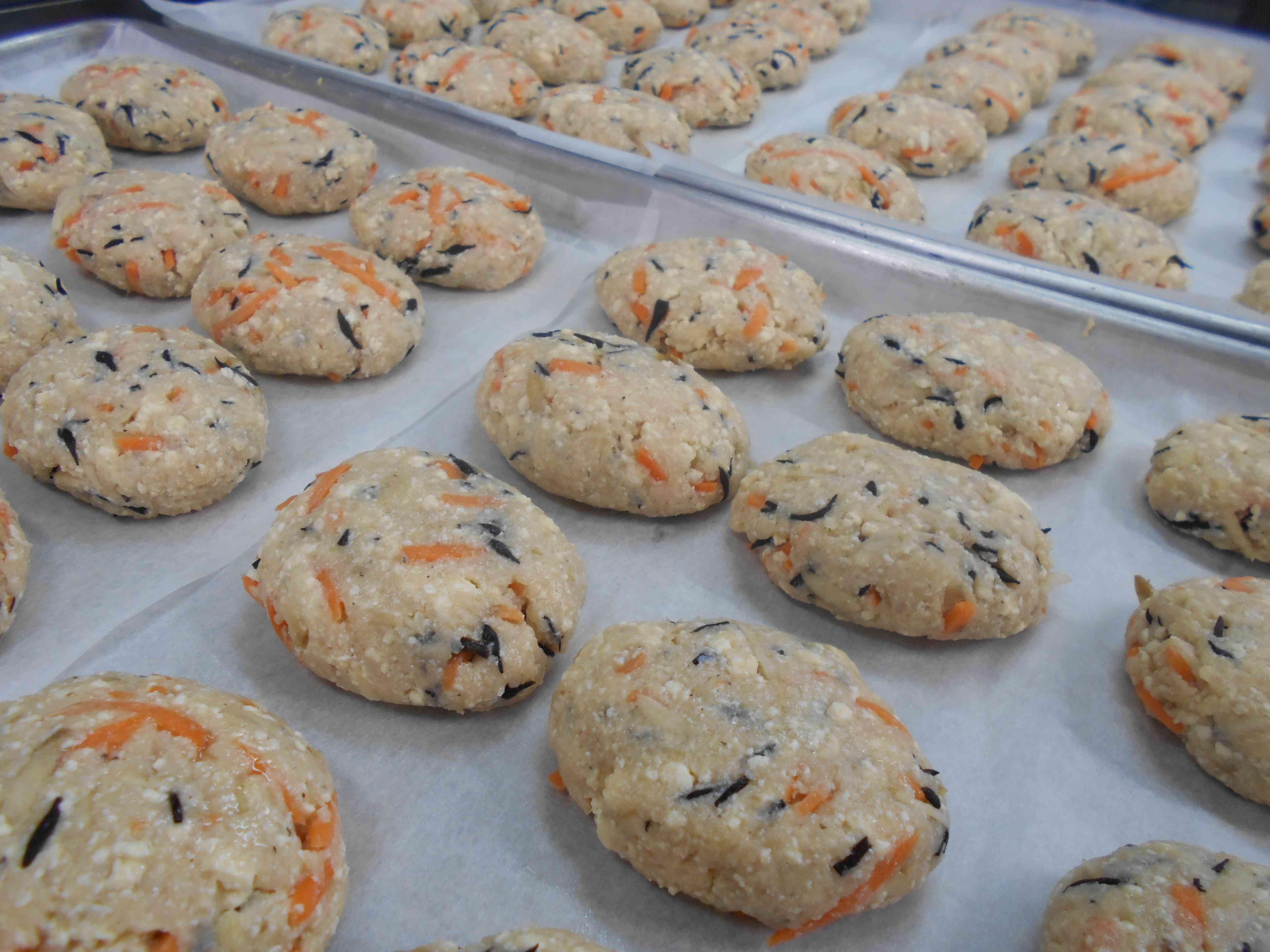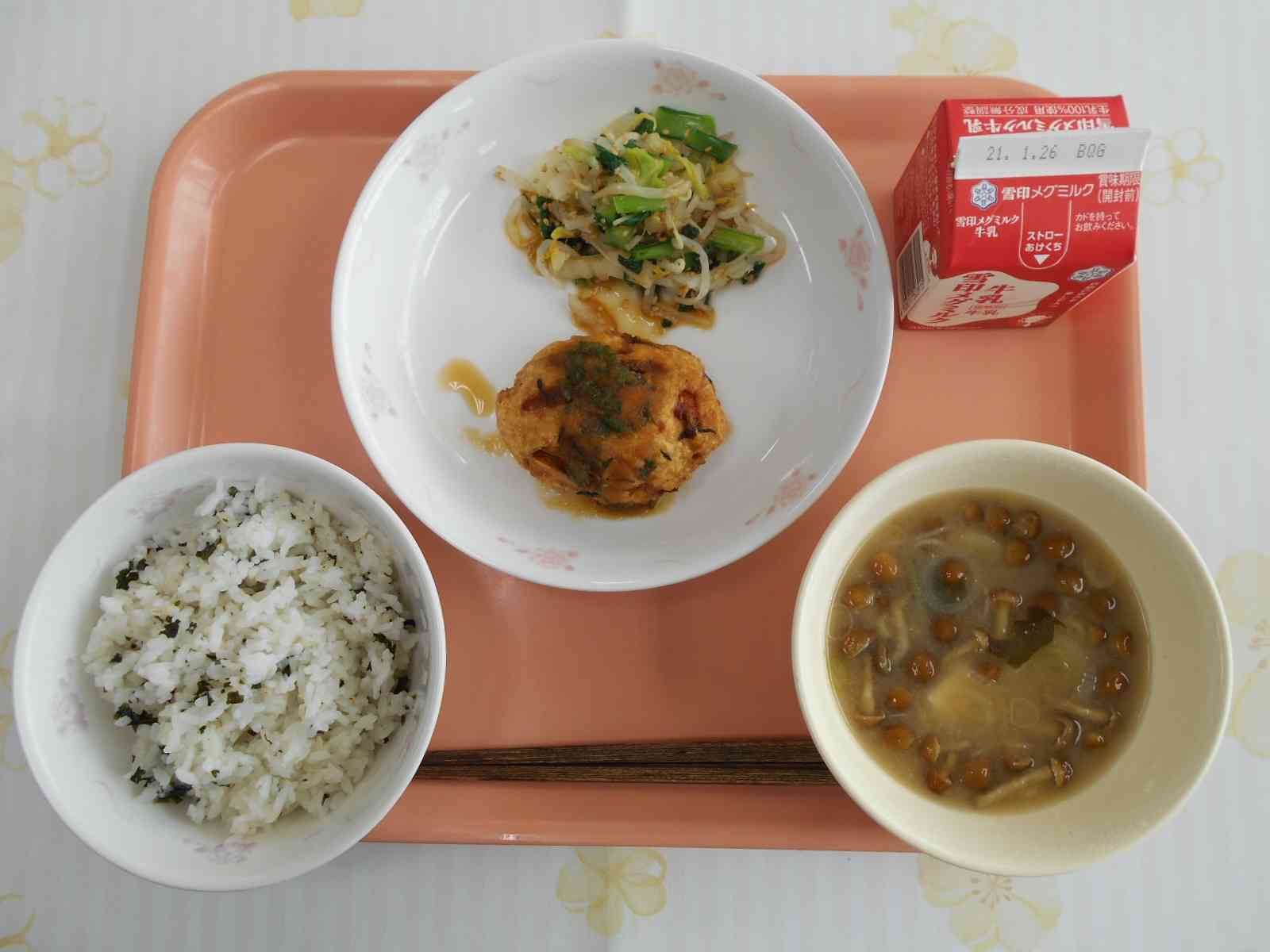 ○牛乳 ○わかめご飯 ○手づくりさつま揚げ(八丈島メダイ使用) ○ごまかけお浸し(おひたし) ○なめことわかめの味噌汁 ☆一口メモ☆ 新型コロナウイルスの感染拡大により、日本各地で水産物の消費量が減り、価格が下がるなどの影響が出ている状況です。消費拡大を図り、将来にわたって水産物を食べられる環境を整えるため、水産庁が支援事業を行っています。東京都では、東京都産水産物販売促進緊急対策事業により都内学校給食に無償提供をしてもらうことになりました。東京都八丈島産のメダイを使って、手作りのさつま揚げを作ります。給食室で揚げたての、既製品とはひと味違う手作りのおいしさを味わってもらいたいと思います。 写真2枚目 さつま揚げの揚げる前の写真です。クッキングシートごと揚げ油に入れて、形が崩れないようにしました。 八丈島産のメダイは、ミンチ状に加工したものを納品してもらいました。それ以外は、野菜を切ること、調味料を練り込むことなど完全手作りのさつま揚げです。 写真3枚目 表面はきつね色に色づいてカラっと、中はふんわりと揚がりました。【添付ファイル】