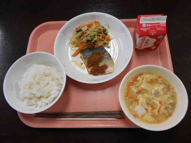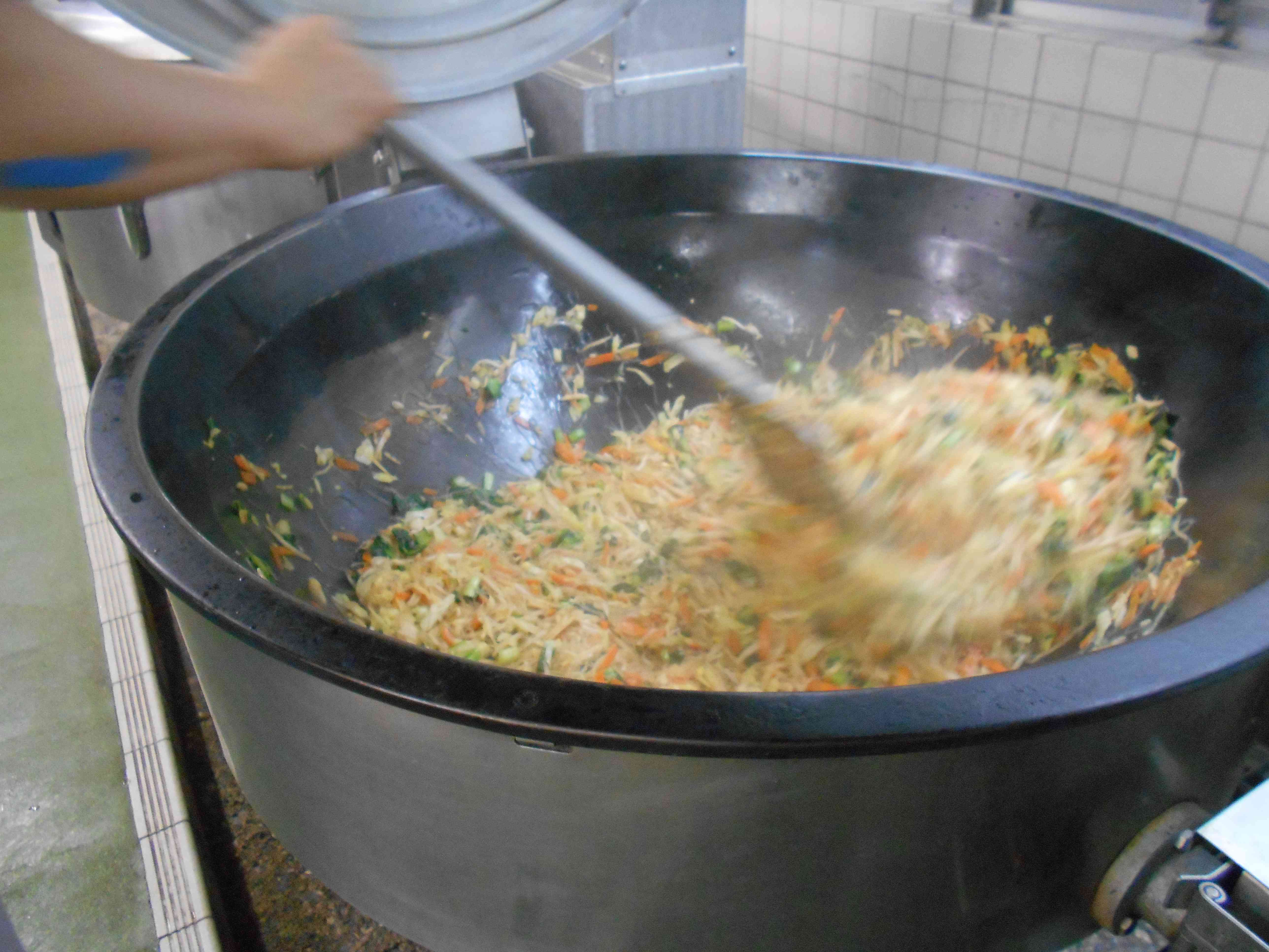 ○牛乳 ○ご飯 ○鯖のピリ辛ねぎだれ ○炒合菜(チャーボーサイ)ターサイ入り ○中華風卵スープ ☆一口メモ☆ 炒め物の中には、ターサイ(タアサイ)が入っています。ターサイは冬が旬です。なじみのない人もいるかもしれませんが、チンゲンサイの仲間の野菜です。寒さに強く、1~2月の厳しい寒さで甘味が出ておいしくなるので、如月菜(きさらぎな)とも呼ばれています(如月は2月の別の呼び方)。今が旬の野菜を味わいましょう。 写真2枚目 大きな回転釜で、炒め物を作っています。給食のように、たくさんの量を炒めて作るときは、時間が経つと野菜から水気が出てきやすくなります。それを防ぐために、火加減や炒め時間、大きなヘラの動かし方に気をつけて作りました。さらに、春雨を加えて、野菜から出てきたうまみのある水分を吸わせています。 (調理員さんの腕についてる青いものは、ばんそうこうです。あえて青い色のものを使うことで、万が一落ちてもすぐに気づくので、異物として混入してしまうことを防げます。) 写真3枚目 ピリ辛ねぎだれは、ねぎ、しょうが、しょうゆ、ラー油、七味唐辛子、酒、酢、砂糖を混ぜて火を通して作りました。焼いたサバにたれをかけて提供しました。【添付ファイル】